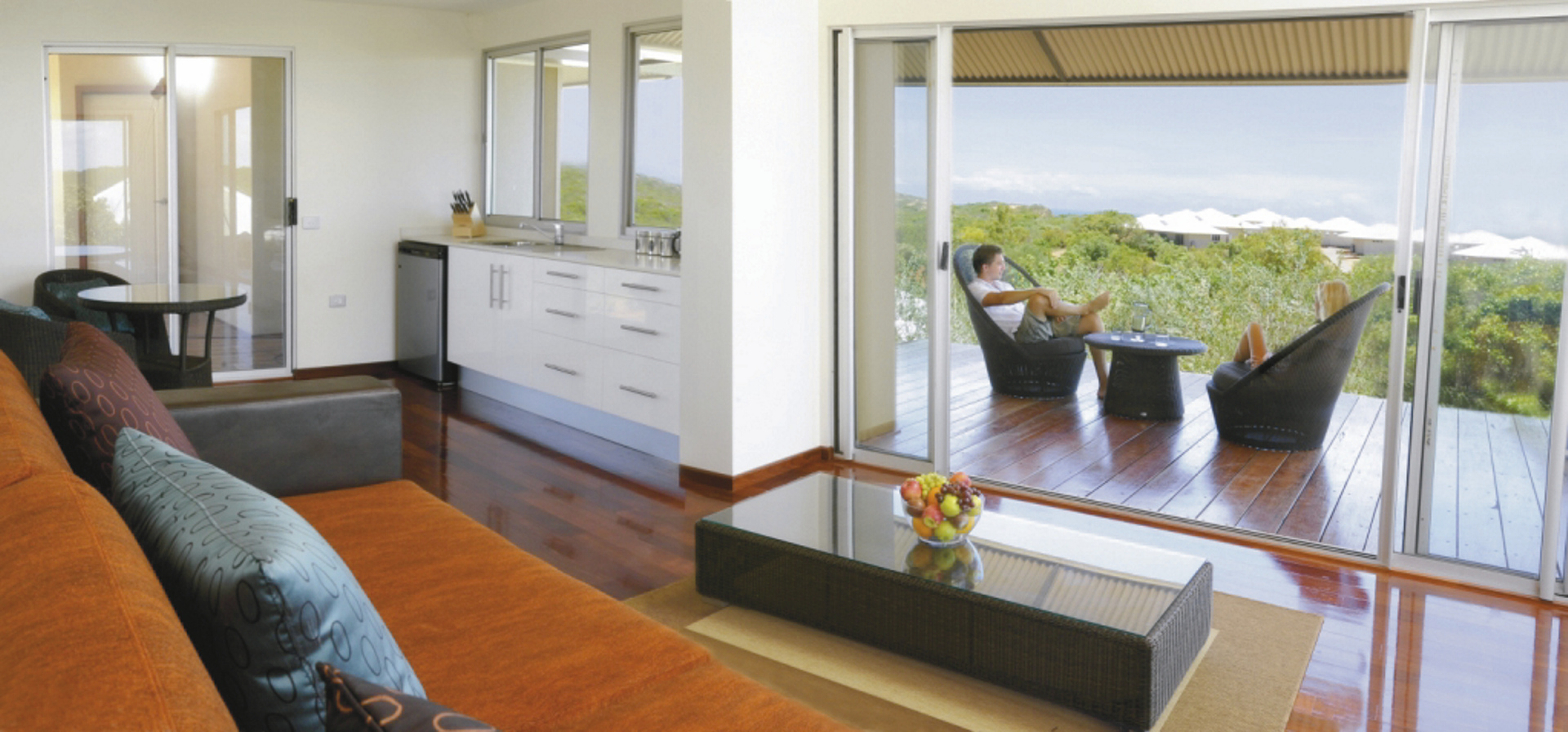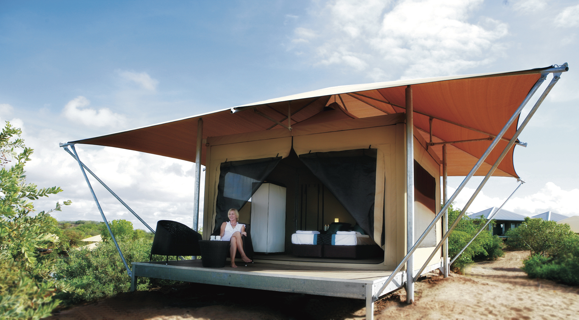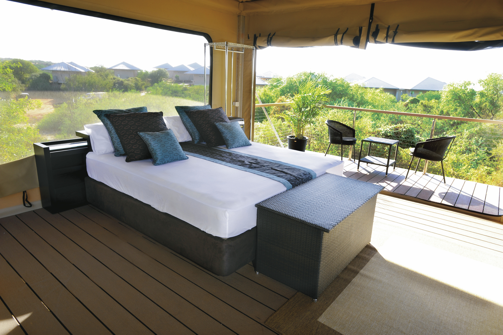 55 stilvolle Zelte und Bungalows (Villa). Gut ventilierte Zelte (24 m²) mit Holzfußboden, Doppelbett, Kühlbox, Dusche/WC und kleiner Terrasse. Moderne Bungalows (65 m² inkl. Terrasse) mit Wohn- und Schlafbereich, Klimaanlage, kleinem Kühlschrank und Tee-/Kaffeezubereiter.