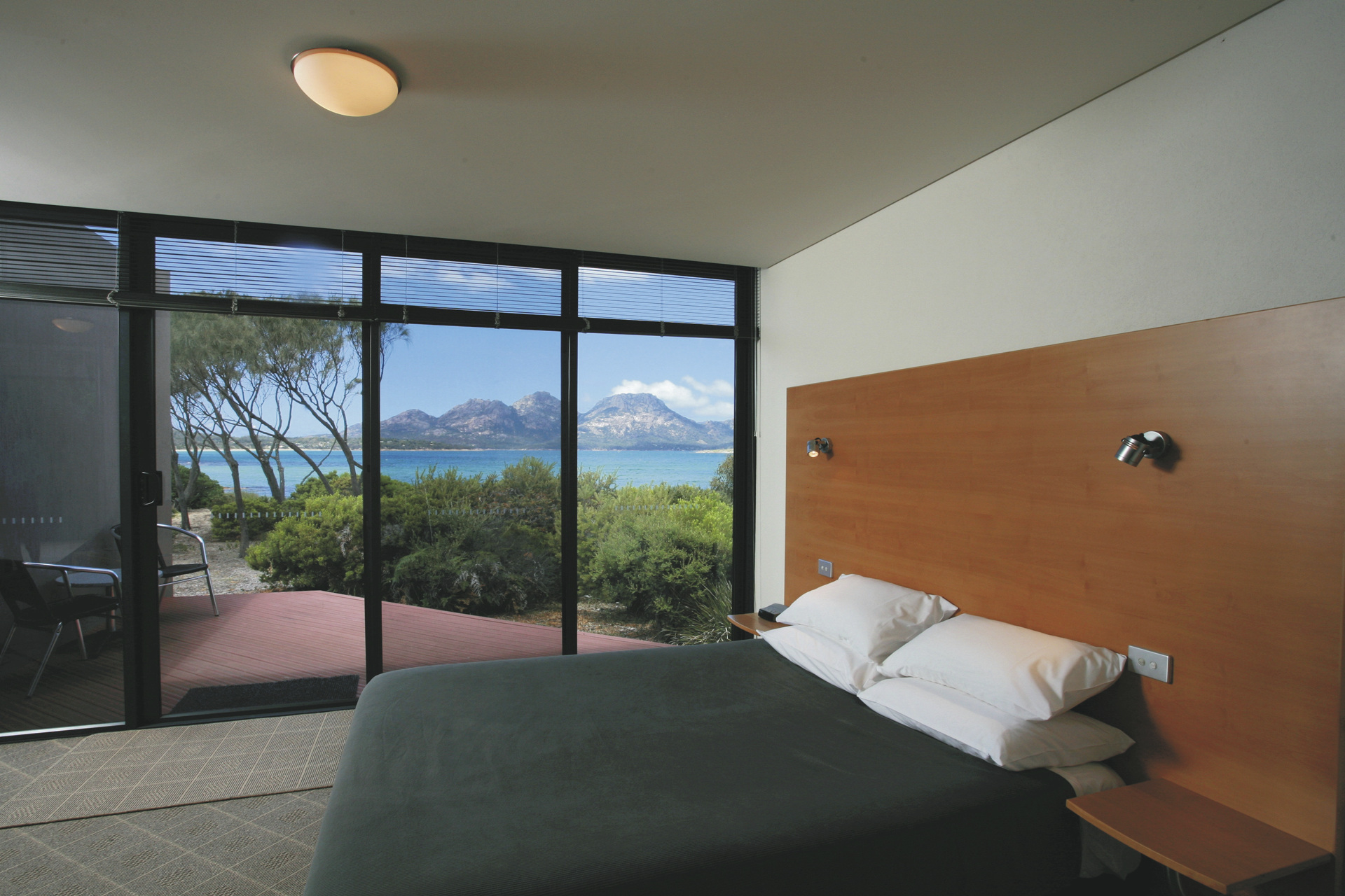 14 moderne Meerblick-Studios im Reihenhausstil und 6 Vintage Chalets, alle mit Blick über die Bucht und auf die Hazards Mountains. Studios sind zeitgemäß ausgestattet mit King-Size-Bett, Lounge-Bereich mit ausziehbarem Sofa-Bett, Bad mit Dusche/WC und Fön, LED-TV, Klimaanlage, eigenem Deck und Kitchenette mit Toaster, Tee-/Kaffeekochgelegenheit und kleinem Kühlschrank. Frühstück ist für Gäste dieser Kategorie inkludiert.Die abgeschieden gelegenen Vintage Chalets sind von typisch australischen Strandhütten der 1980er Jahre inspiriert. Sie bieten einen großen Wohn-/Essbereich, zwei Schlafzimmer (1x Queen-size Doppelbett, 1x drei Einzelbetten) und verfügen über eine voll ausgestattete Küche, Waschmaschine/-trockner sowie eine Veranda mit BBQ-Bereich.