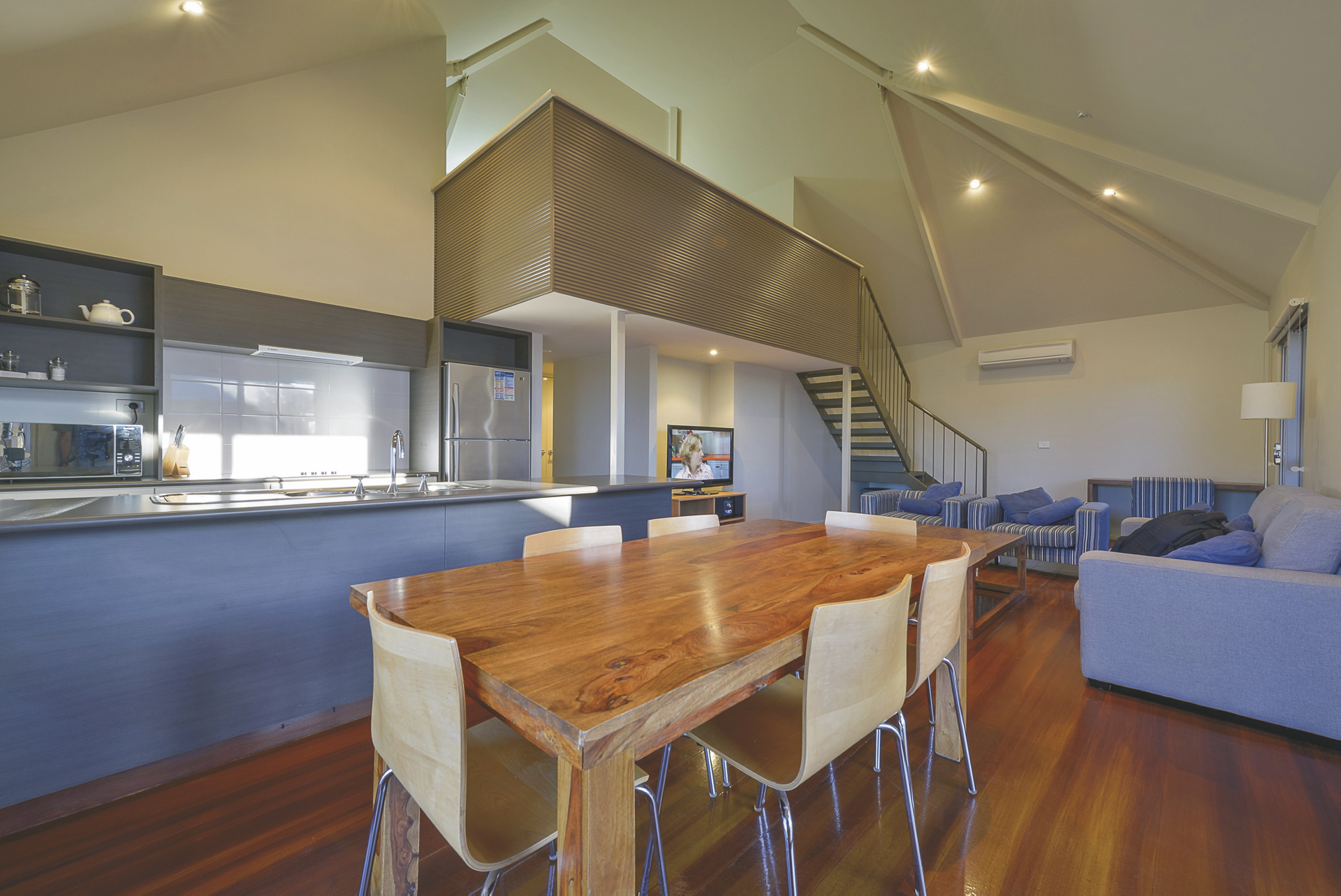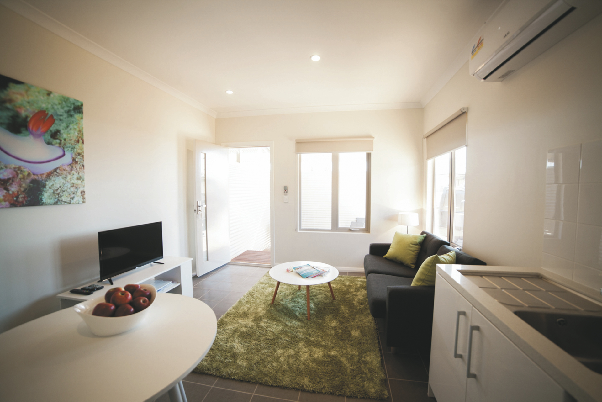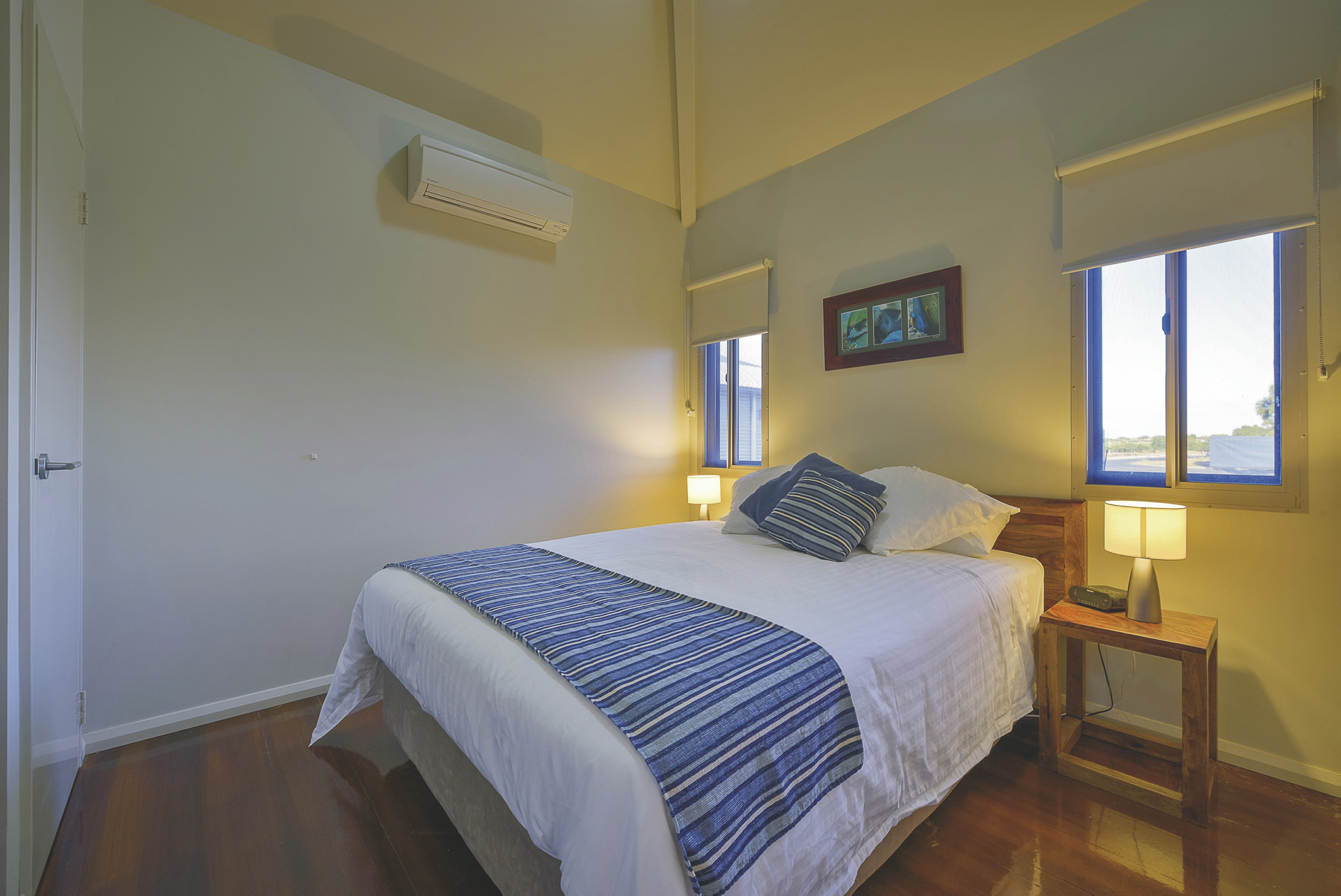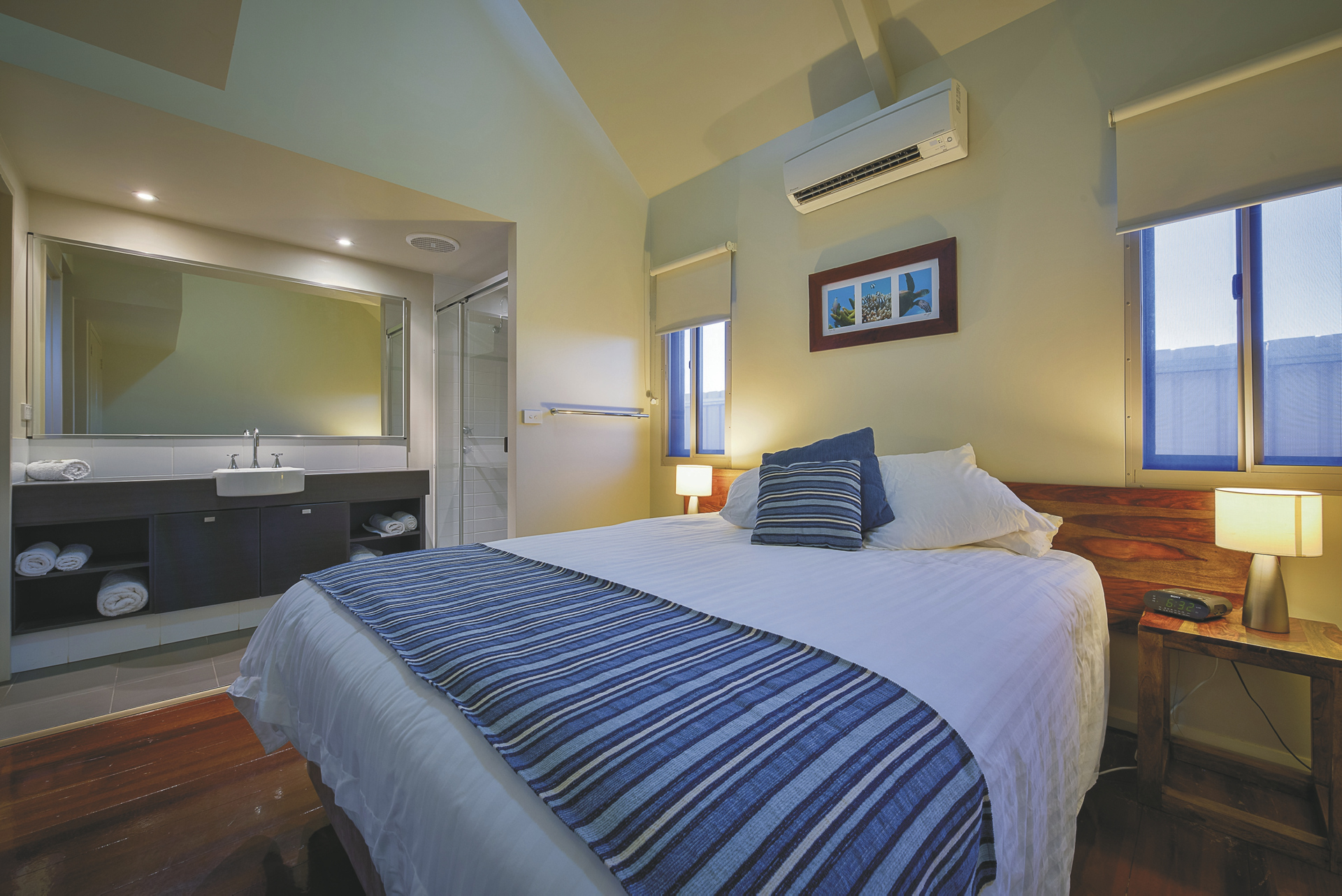 62 komfortable Unterkünfte, ausgestattet u.a. mit Klimaanlage, TV, DVD-Spieler, Waschmaschine/Trockner und überdachtem Außenbereich mit Grill. 1 SZ Apartments mit Dusche/WC und Küchenzeile. 2 SZ Apartments mit zweitem Twin-Schlafzimmer, zwei Bädern, größerer Küche und Wohnbereich. 3 SZ Apartments mit drittem Schlafzimmer und zweitem Bad auf einer Empore.