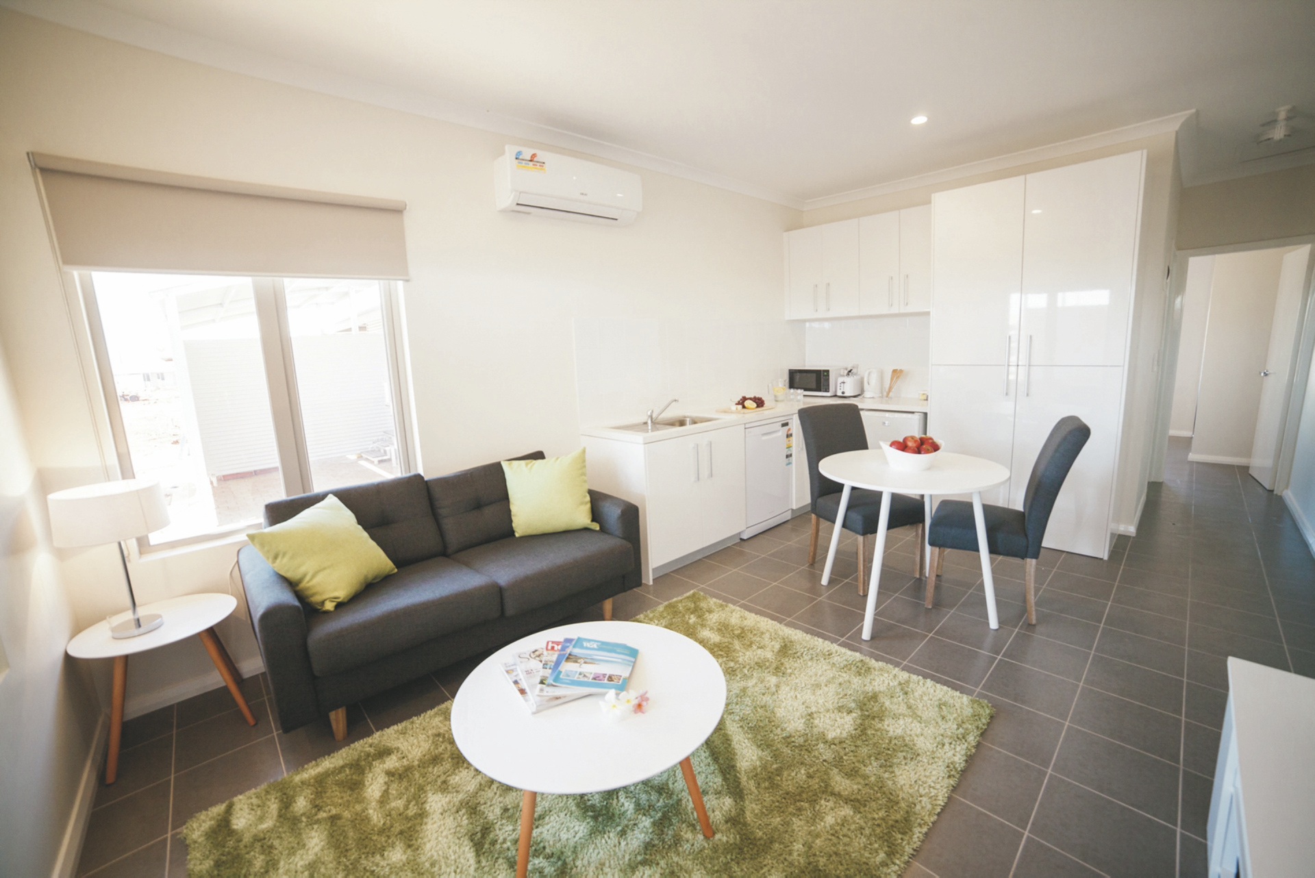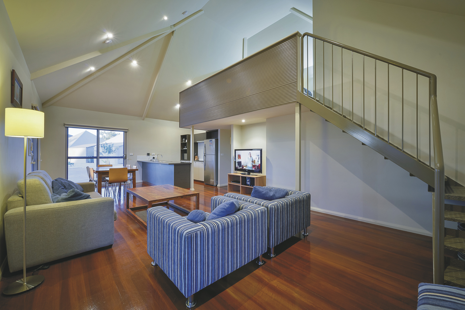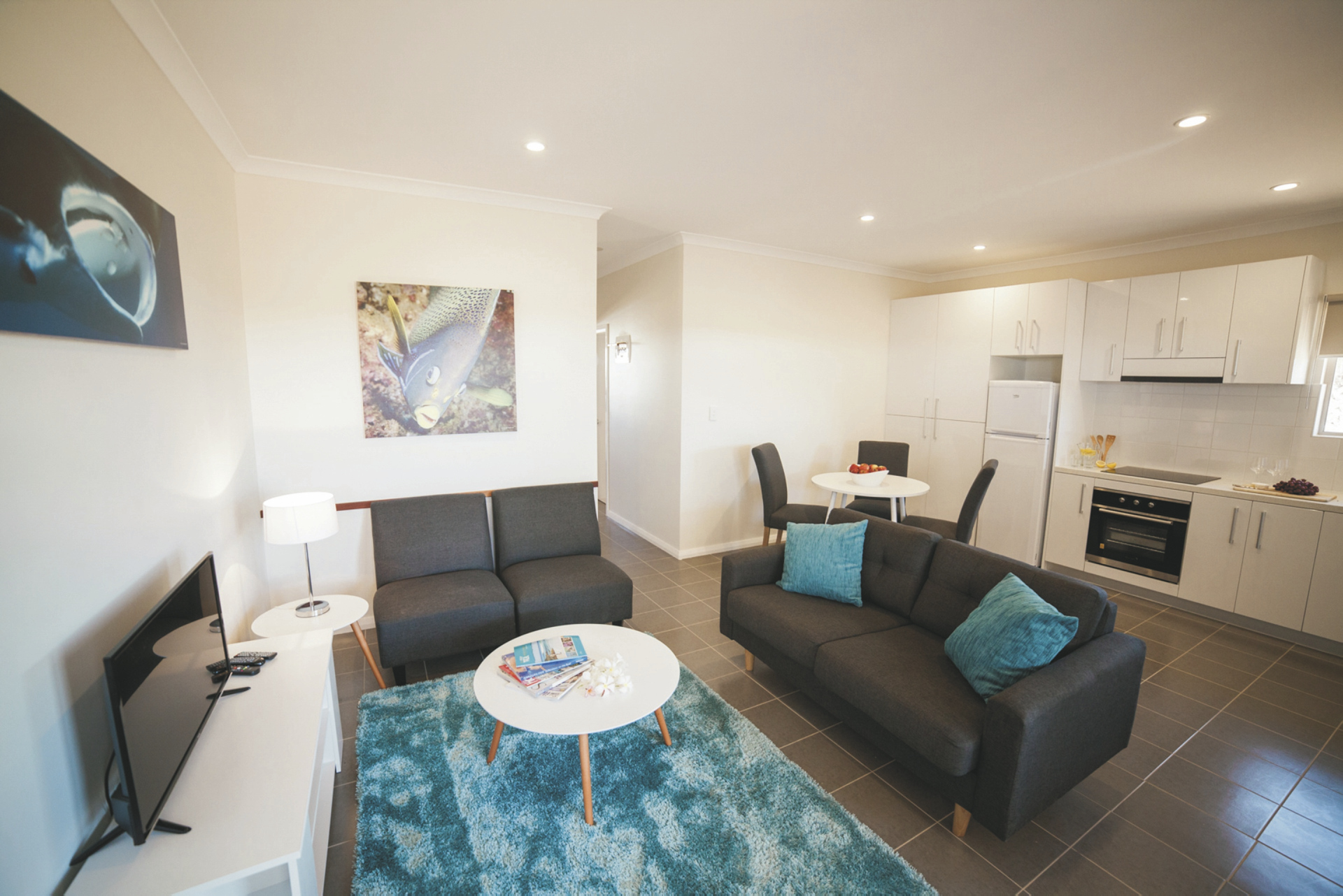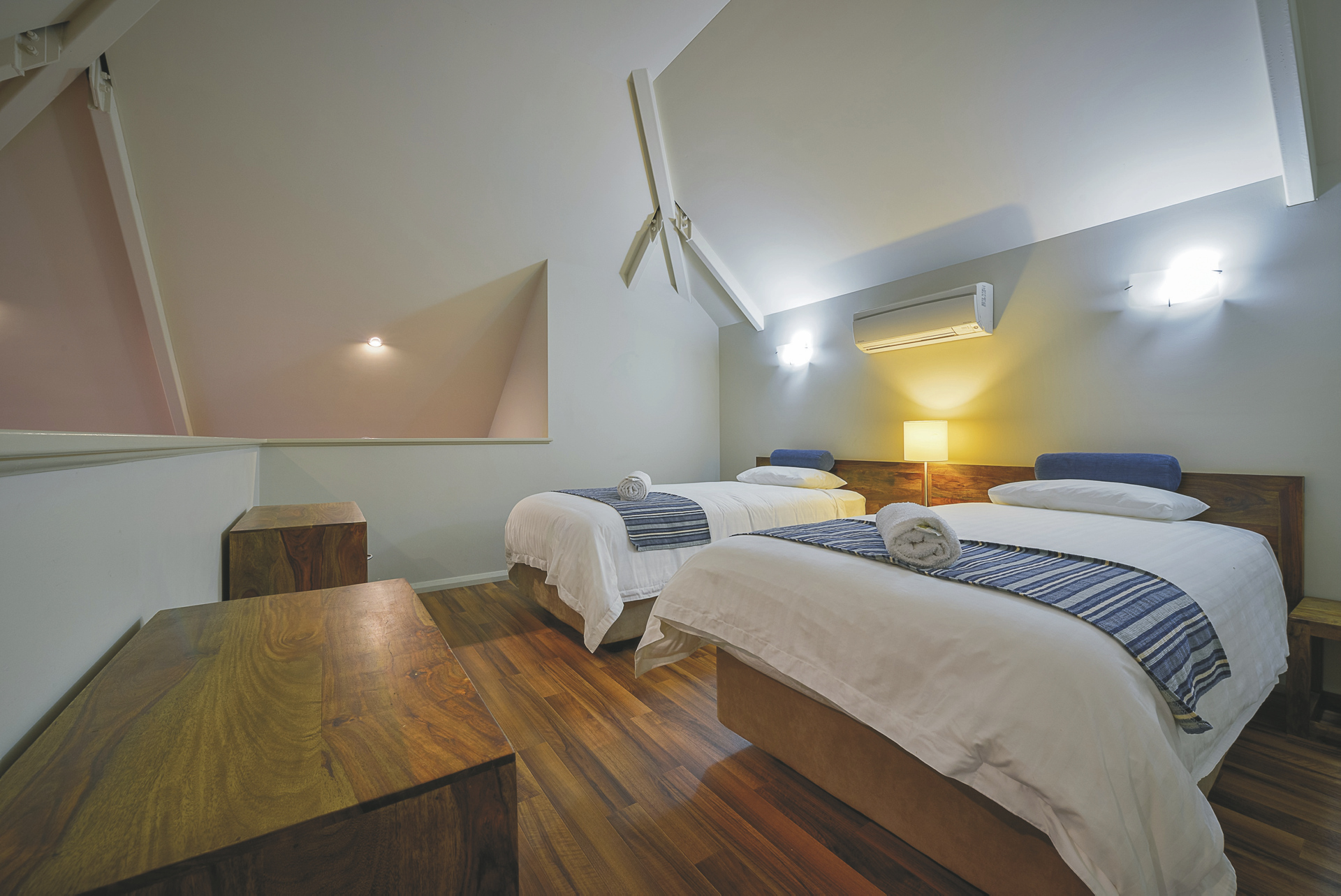62 komfortable Unterkünfte, ausgestattet u.a. mit Klimaanlage, TV, DVD-Spieler, Waschmaschine/Trockner und überdachtem Außenbereich mit Grill. 1 SZ Apartments mit Dusche/WC und Küchenzeile. 2 SZ Apartments mit zweitem Twin-Schlafzimmer, zwei Bädern, größerer Küche und Wohnbereich. 3 SZ Apartments mit drittem Schlafzimmer und zweitem Bad auf einer Empore.
