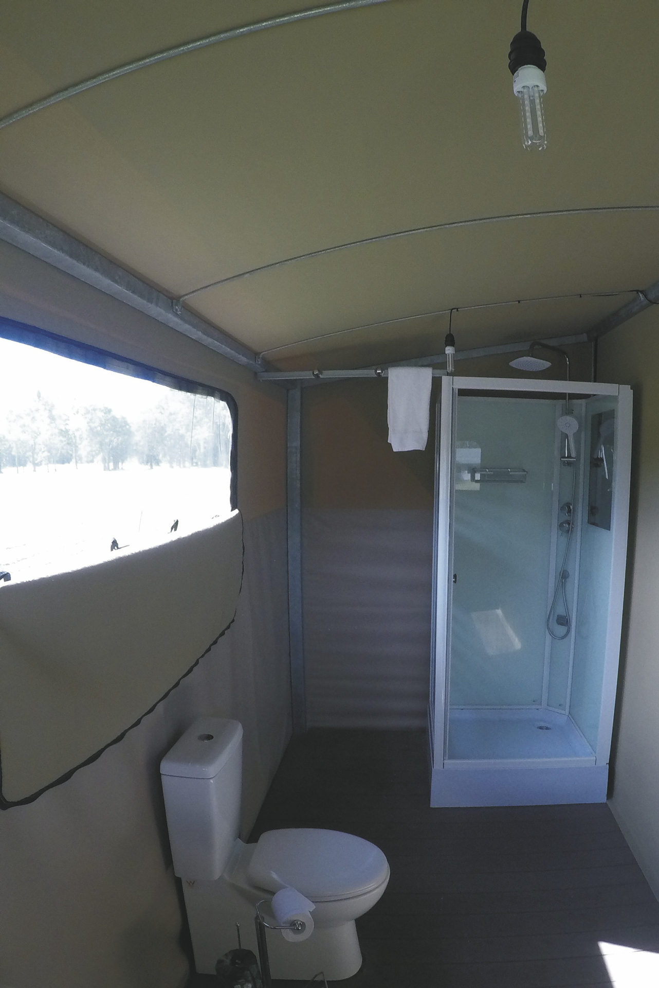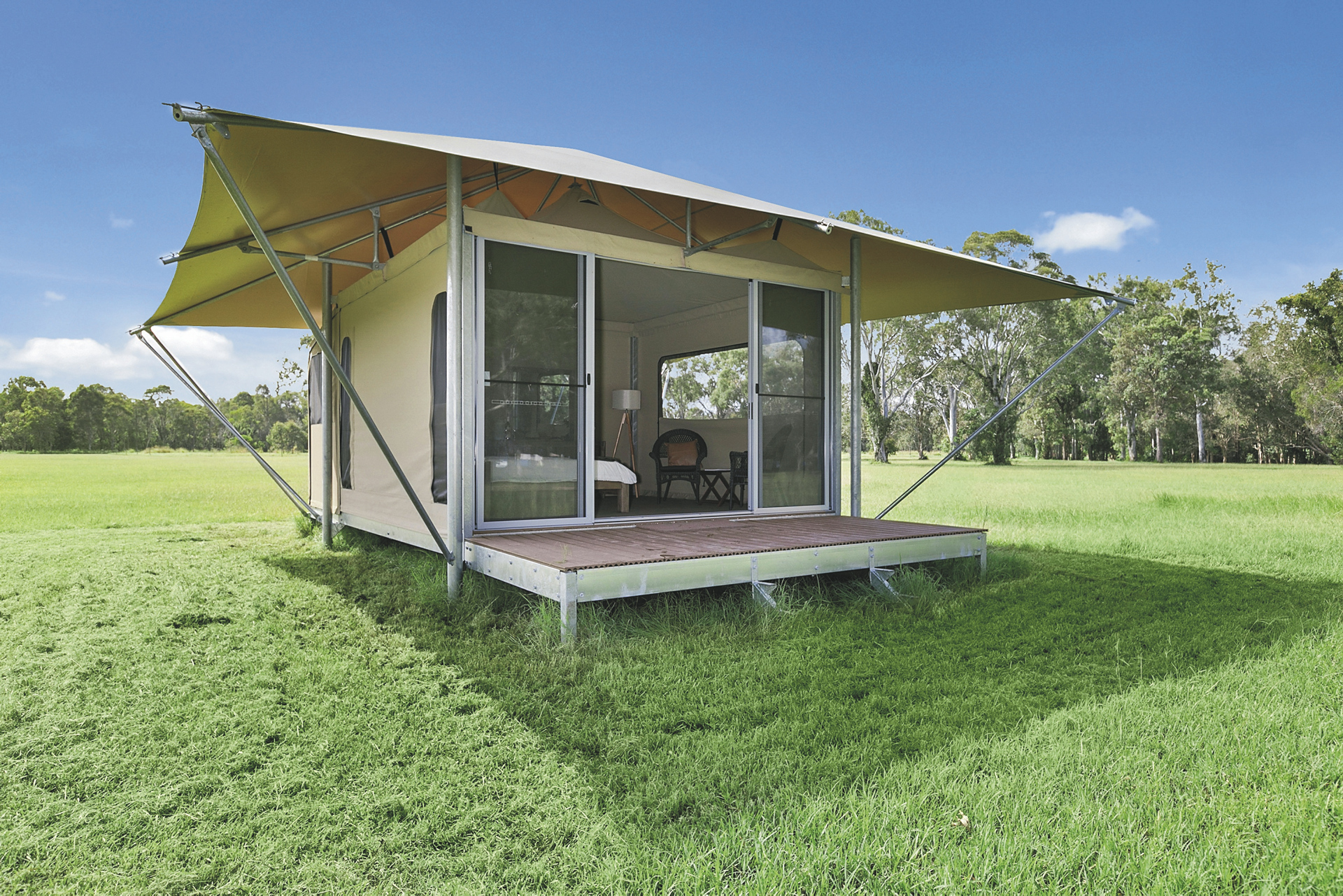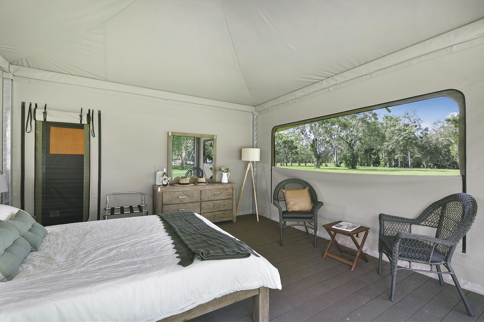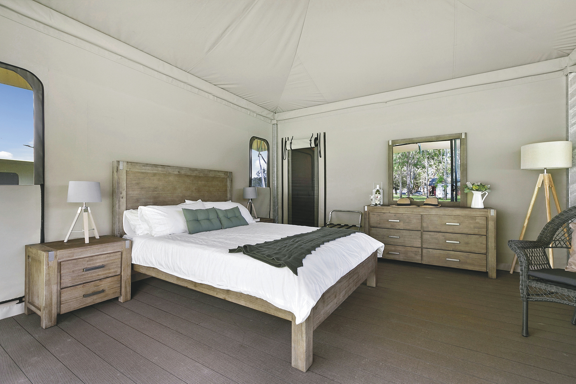 U.a. 18 geräumige (30 m²) Paperbark Zeltbungalows mit eigener Dusche/WC. Entweder mit Blick über den Campingplatz auf den See oder auf Wiese und Wald. Die in harmonischen Farben gehaltenen Zelte stehen auf soliden Holzplattformen, haben jeweils vier Schlafplätze (ein Doppelbett und ein Stockbett) und verfügen über elektrisches Licht, Deckenventilator, Kühlschrank, Terrasse mit Tisch und Stühlen sowie eine Feuerschale nebenan. Der Zugang erfolgt durch eine abschließbare Glasschiebetür.