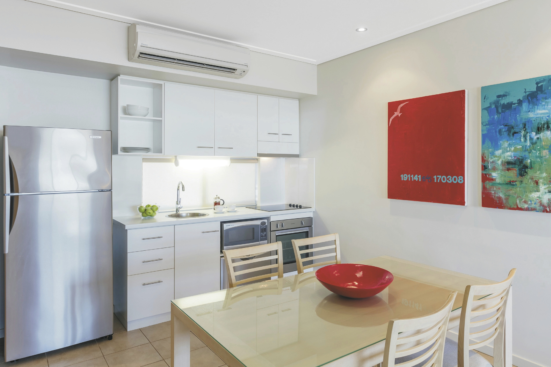 78 helle Studios und Apartments auf 2 Etagen (kein Lift), ausgestattet u.a. mit Klimaanlage, Küchenzeile mit Tee-/Kaffeezubereiter, Bad/WC mit Dusche und/oder Wanne, Waschmaschine/Trockner sowie Terrasse oder Balkon. Premier Studios sind geräumiger, Apartments mit separaten Schlafzimmern und zusätzlichem Geschirrspüler.