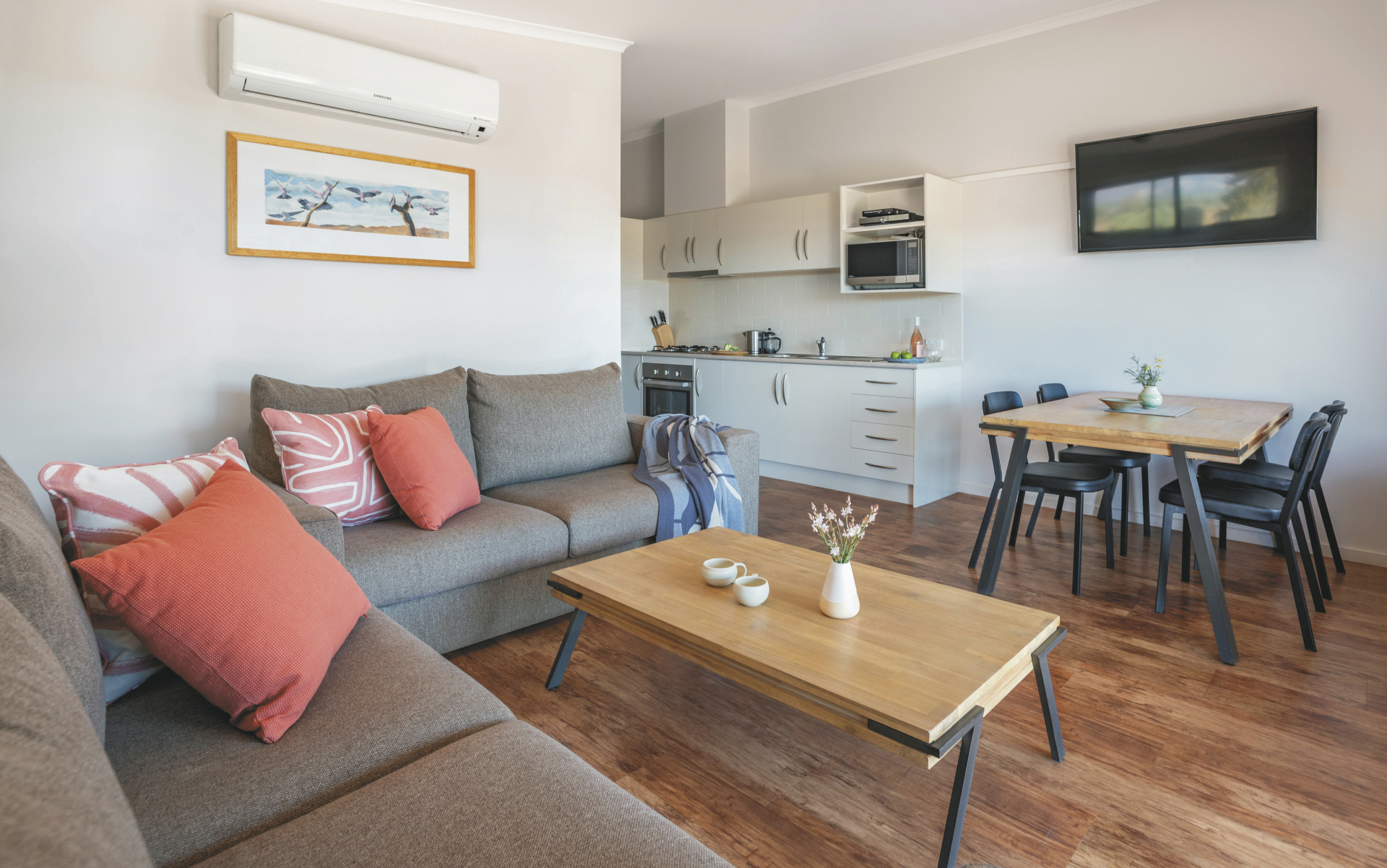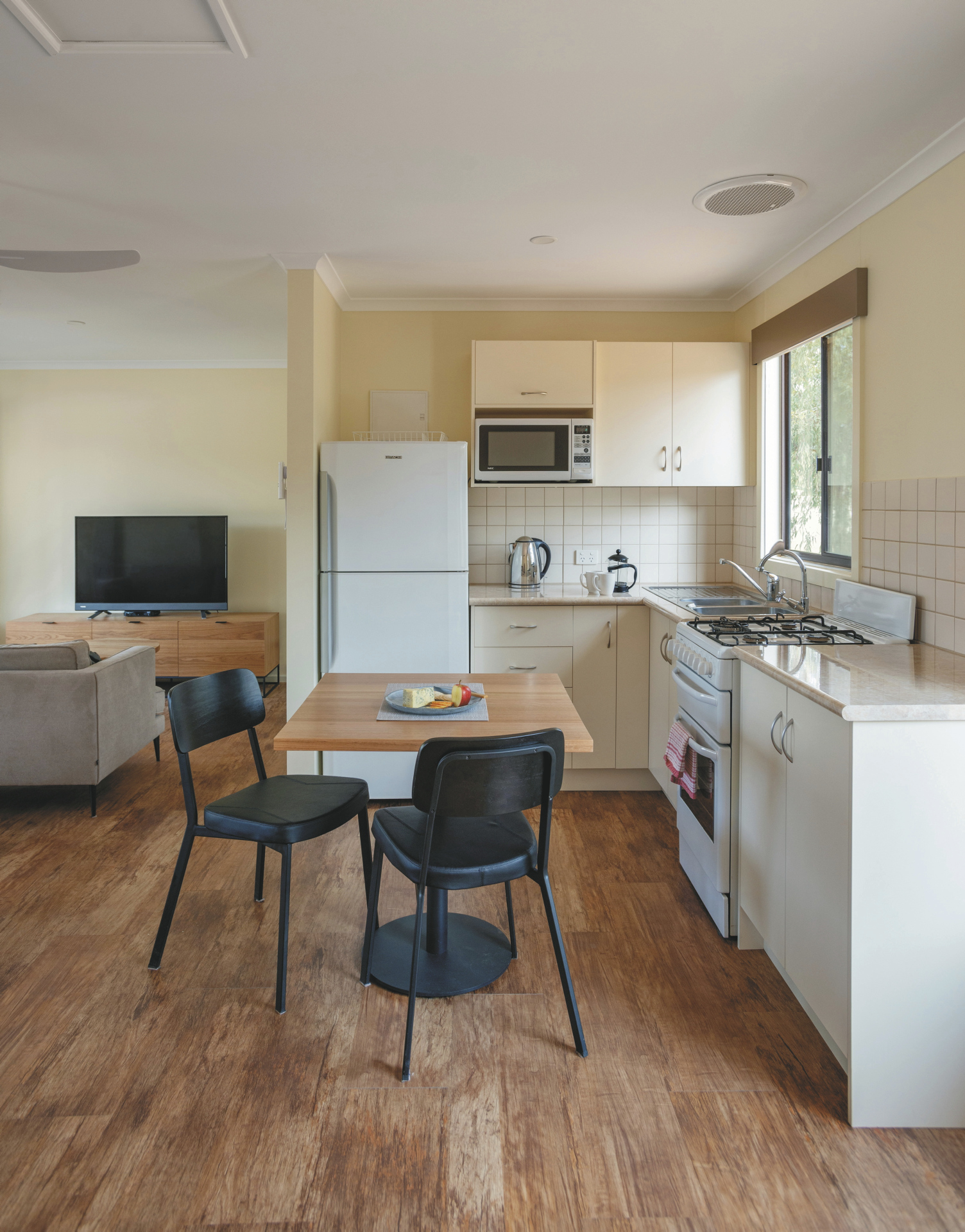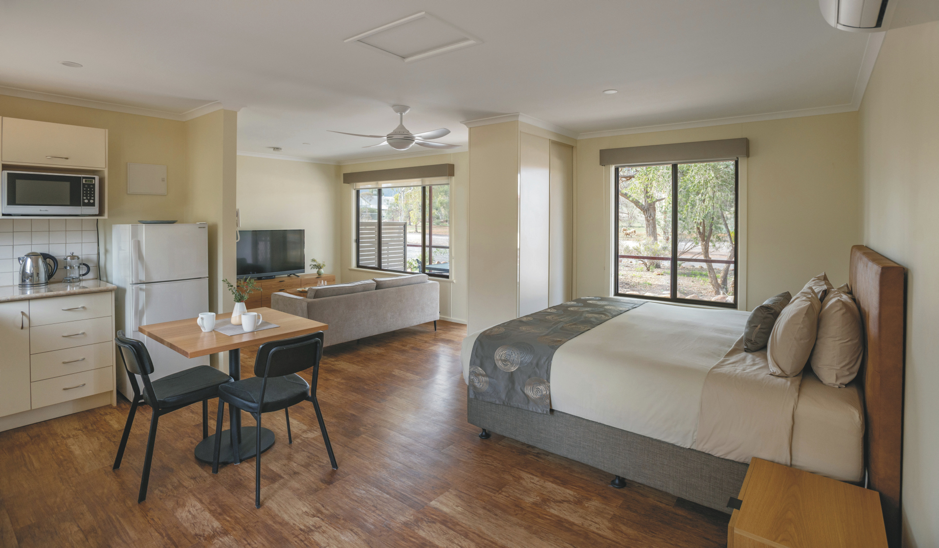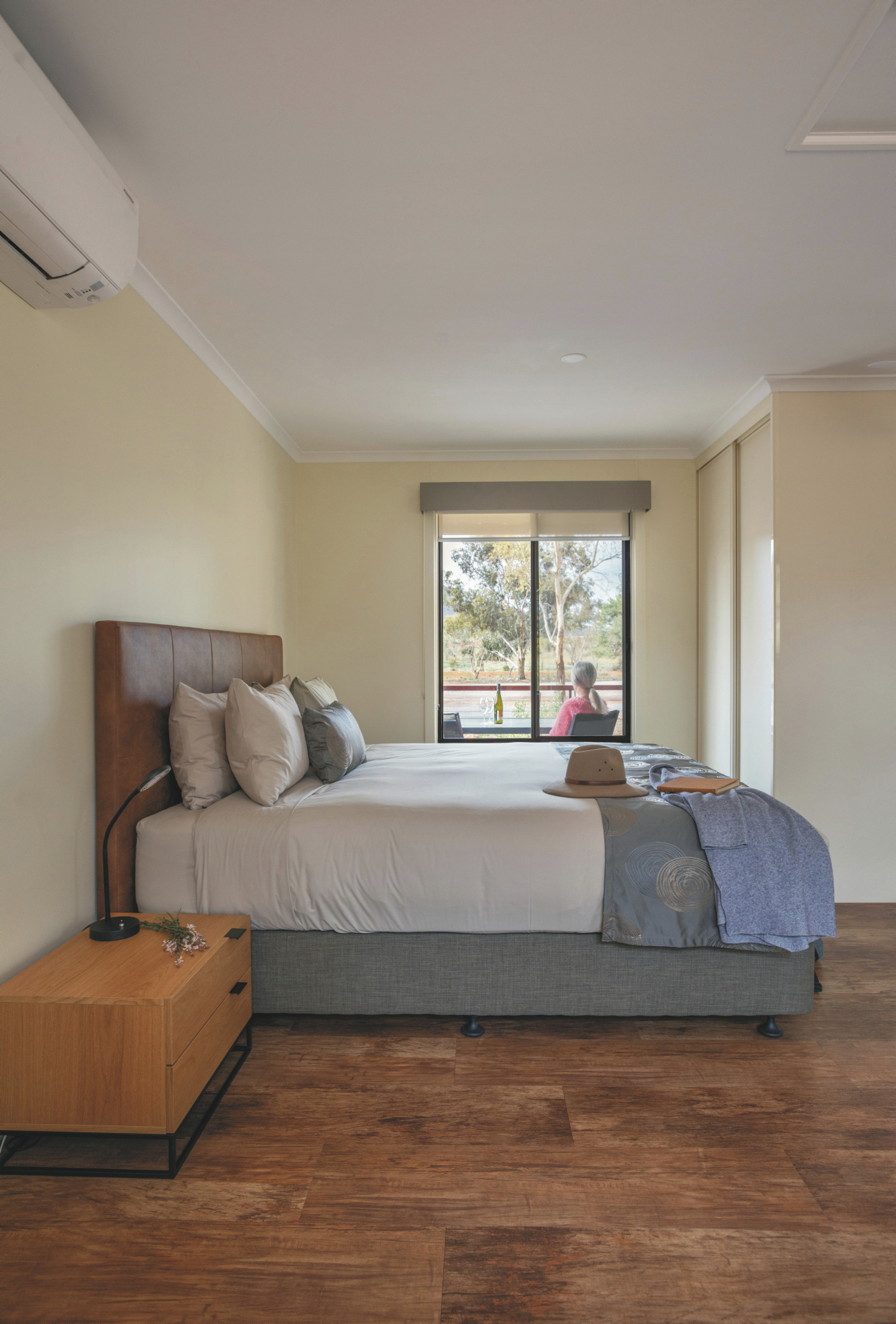 Insgesamt 30 Unterkünfte, wahlweise im Motelstil (Superior Holiday Units ) und näher zur Rezeption, u.a. mit Bad/Dusche, Küchenzeile, separatem Schlafzimmer und Terrasse. Oder 8 einzigartige, luxuriöse Eco Villas, geräumige moderne Bungalows mit 1 oder 2 Schlafzimmern, je Schlafzimmer ein eigenes Bad mit separater Dusche und Wanne, Bademäntel, Fön, kompletter Küche, TV, DVD-Spieler sowie Veranda mit Sitzmöbeln, BBQ und toller Aussicht. Der Clou: Nachts kann durch ein Fenster über dem Bett der Sternenhimmel beobachtet werden.