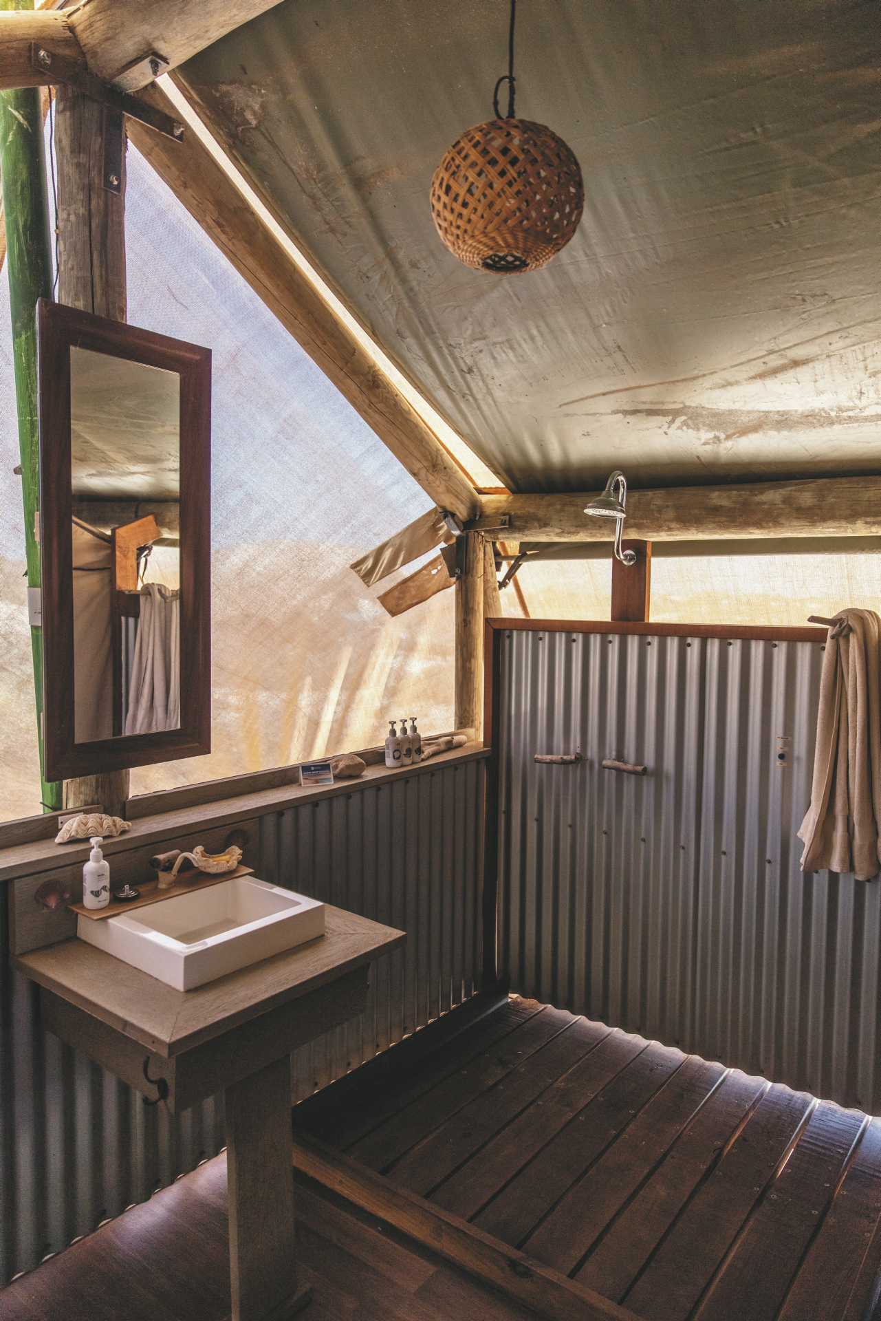 Lediglich 9 geräumige, auf Plattformen errichtete Zelte, qualitativ hochwertig eingerichtet und mit eigenem Bad mit Solar-Dusche und WC, aber ohne TV, Telefon oder Minibar.