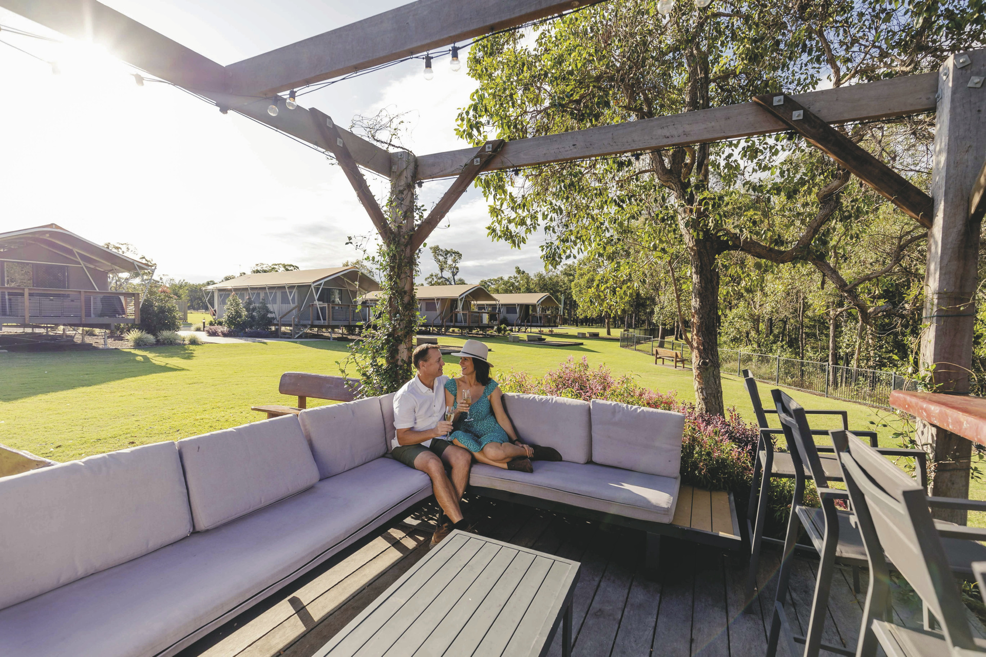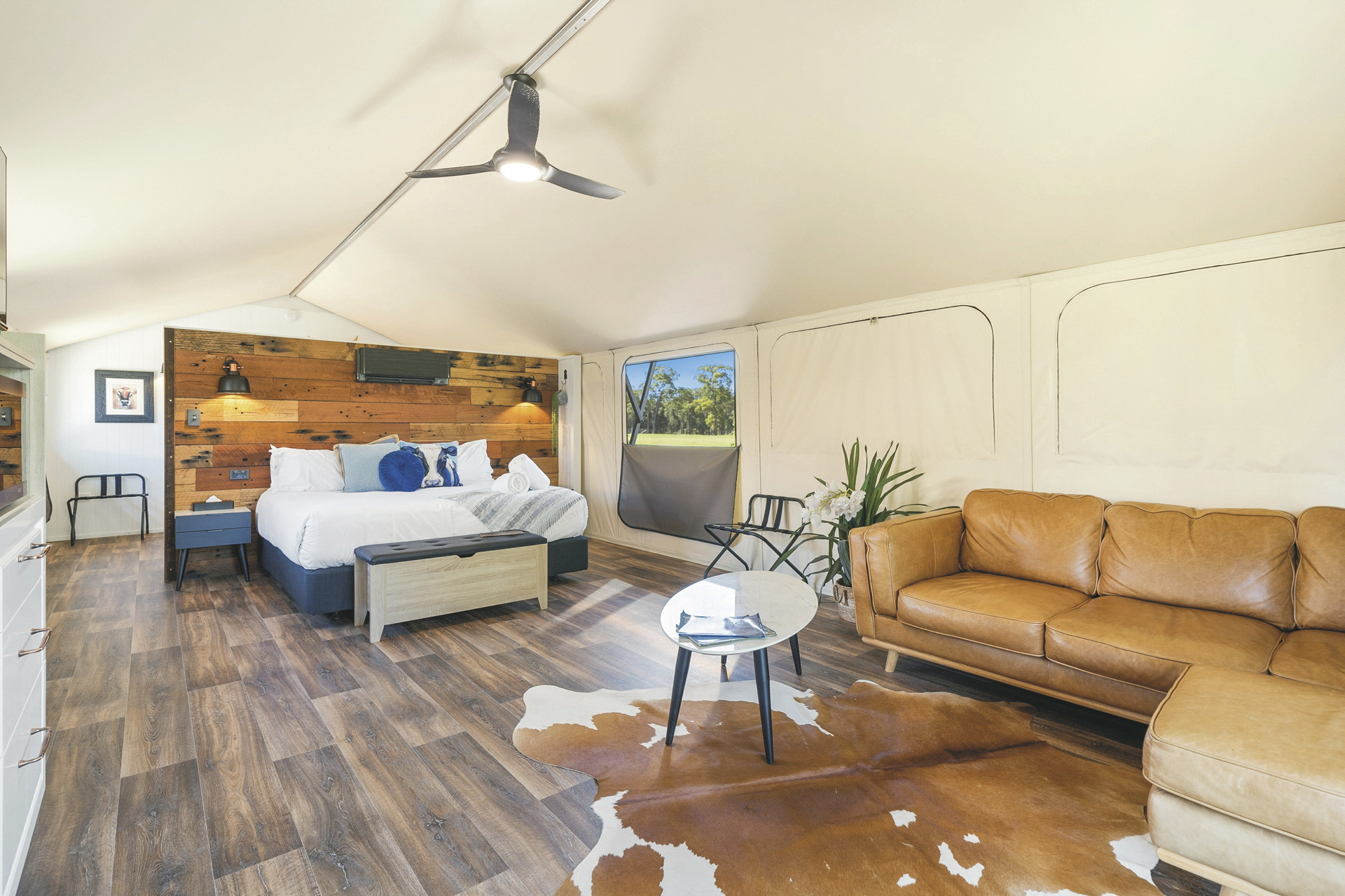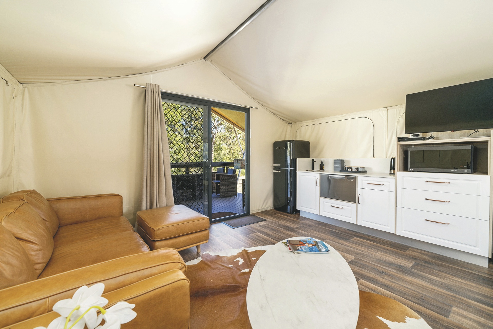 8 klimatisierte Zeltbungalows mit großzügigem Wohn-/Schlafbereich und ansprechender, moderner Einrichtung. Zur Ausstattung zählen u.a. ein Wohnbereich mit Sofa, TV, DVD-Spieler, Deckenventilator, ein bequemes Kingsize-Bett, zwei Einzelbetten, ein Bad mit begehbarer Dusche, eine Küche (indoor & outdoor) mit Mikrowelle, Geschirrspüler und Gasgrill sowie eine große Verandah mit Sitzmöbeln.