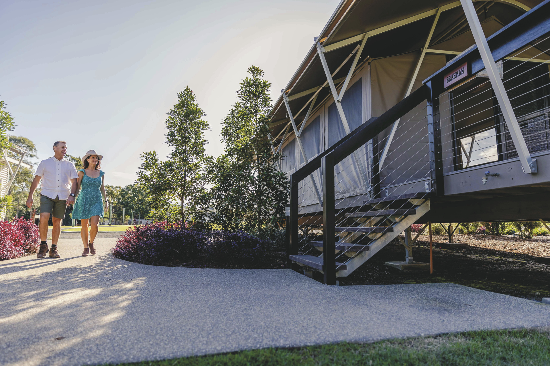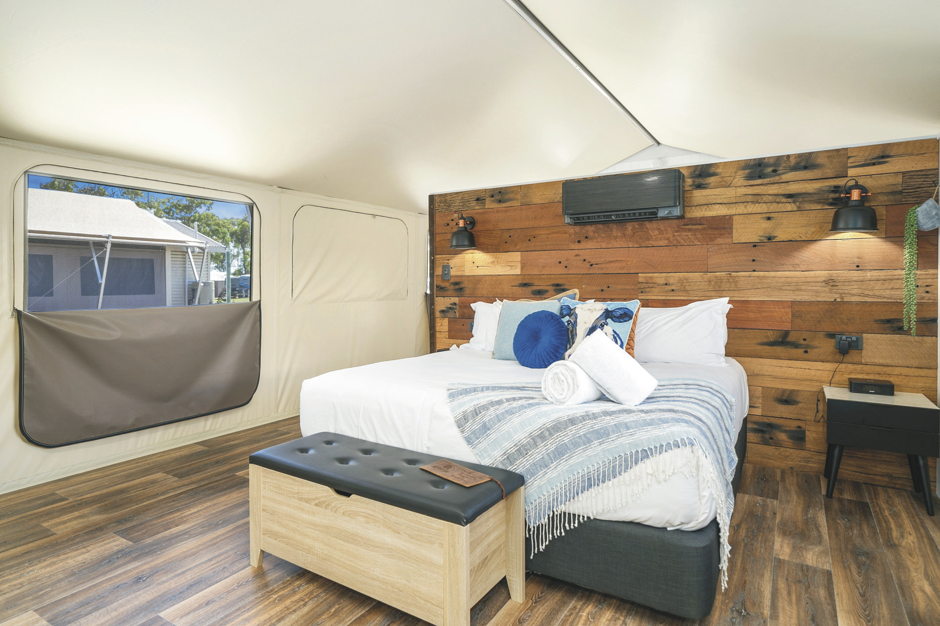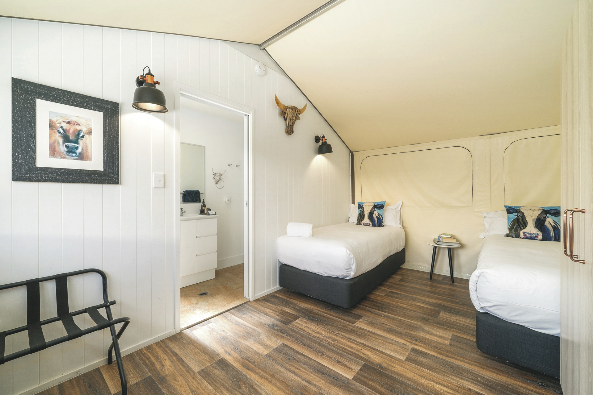8 klimatisierte Zeltbungalows mit großzügigem Wohn-/Schlafbereich und ansprechender, moderner Einrichtung. Zur Ausstattung zählen u.a. ein Wohnbereich mit Sofa, TV, DVD-Spieler, Deckenventilator, ein bequemes Kingsize-Bett, zwei Einzelbetten, ein Bad mit begehbarer Dusche, eine Küche (indoor & outdoor) mit Mikrowelle, Geschirrspüler und Gasgrill sowie eine große Verandah mit Sitzmöbeln.