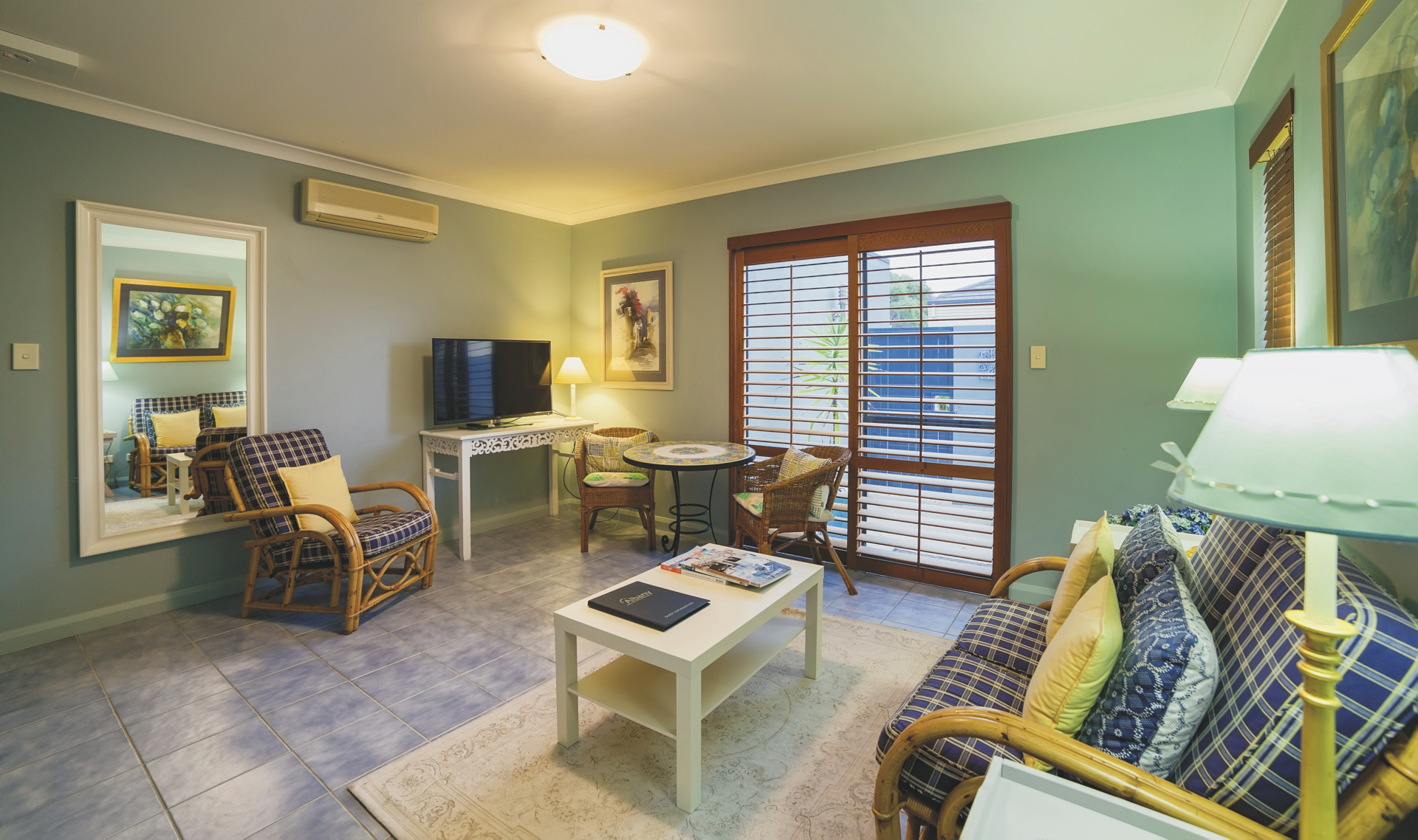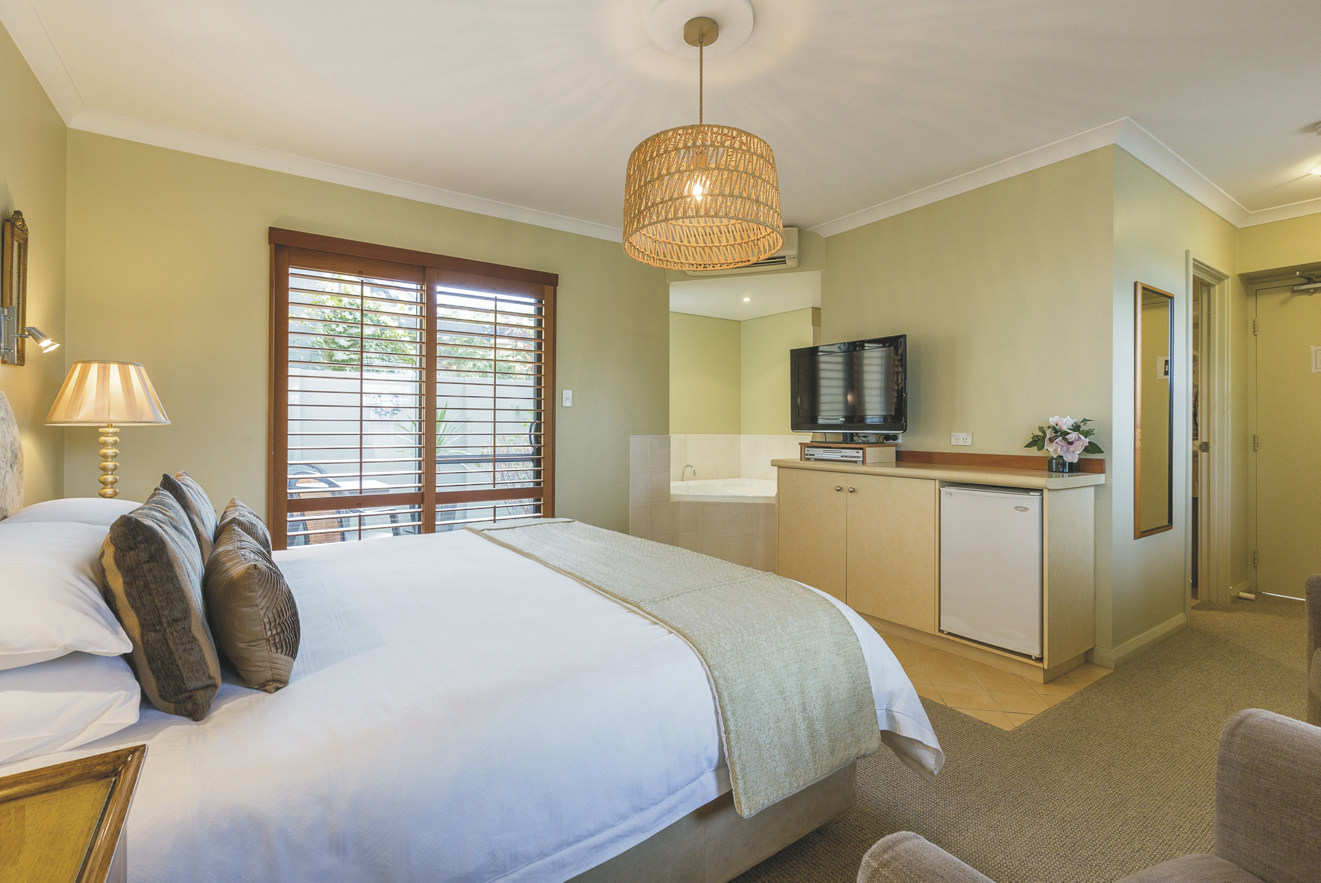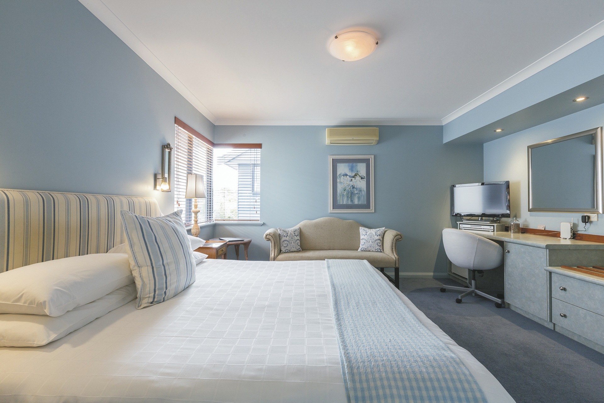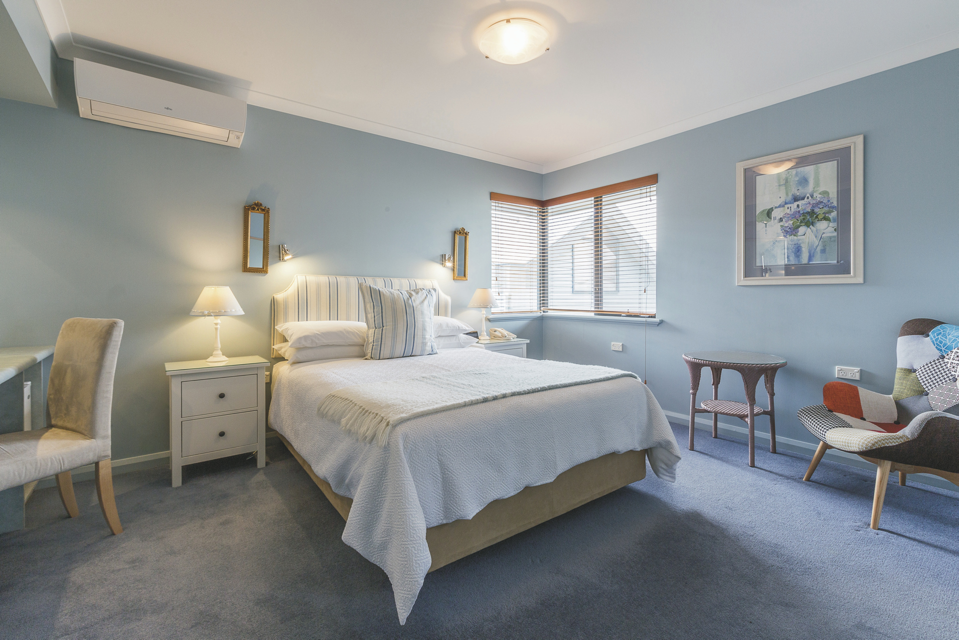 2 Zimmer im Haupthaus, 4 im Colonnade Wing und 1 Garten Suite. Alle u.a. mit Klimaanlage/Heizung, Telefon, TV und DVD, Minibar und Dusche/WC. Colonnade Zimmer zusätzlich mit einer Sitzecke. Die Garten Suite mit Wohnraum im Erdgeschoss, Schlafzimmer im oberen Stock und Bad mit Wanne und Dusche.