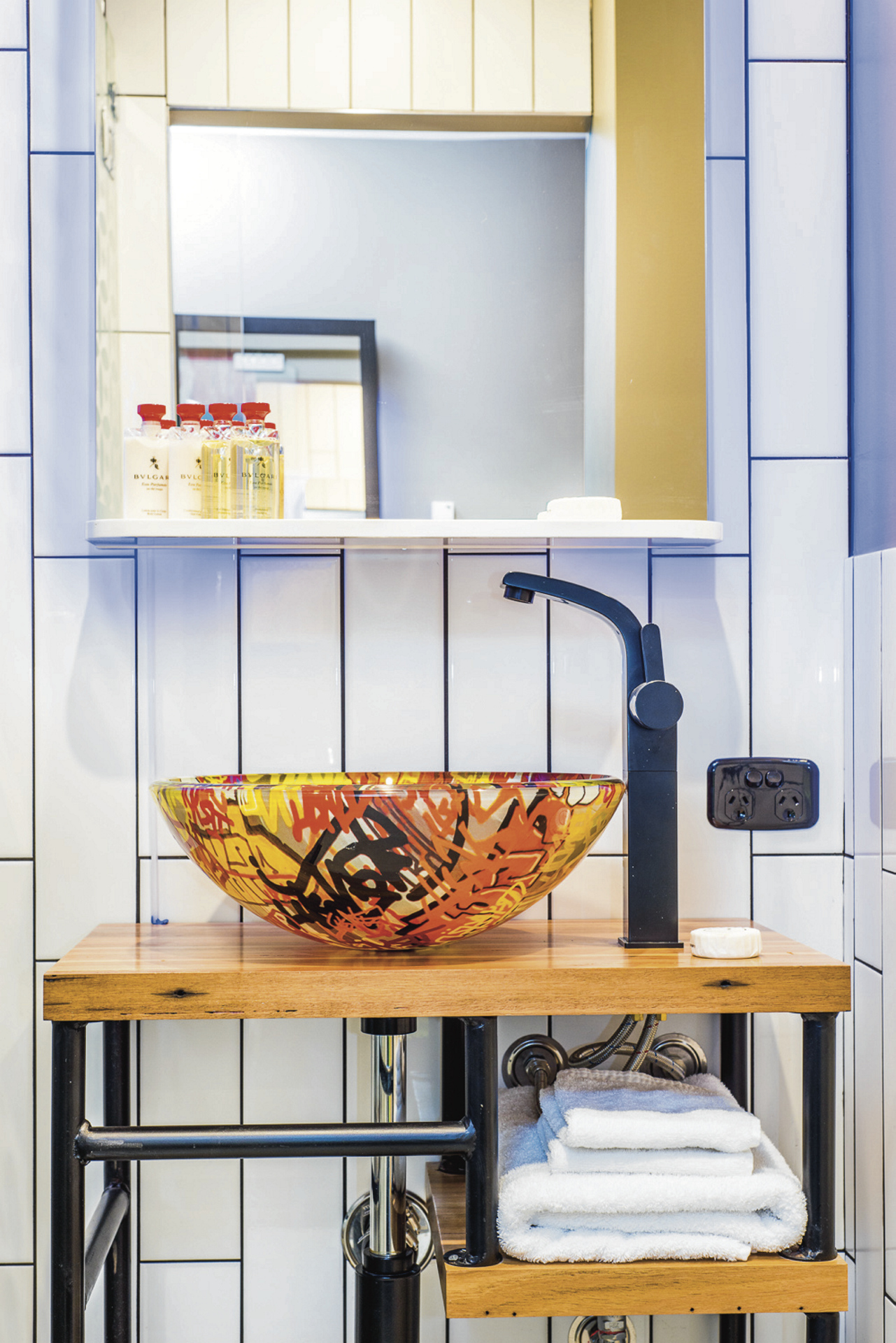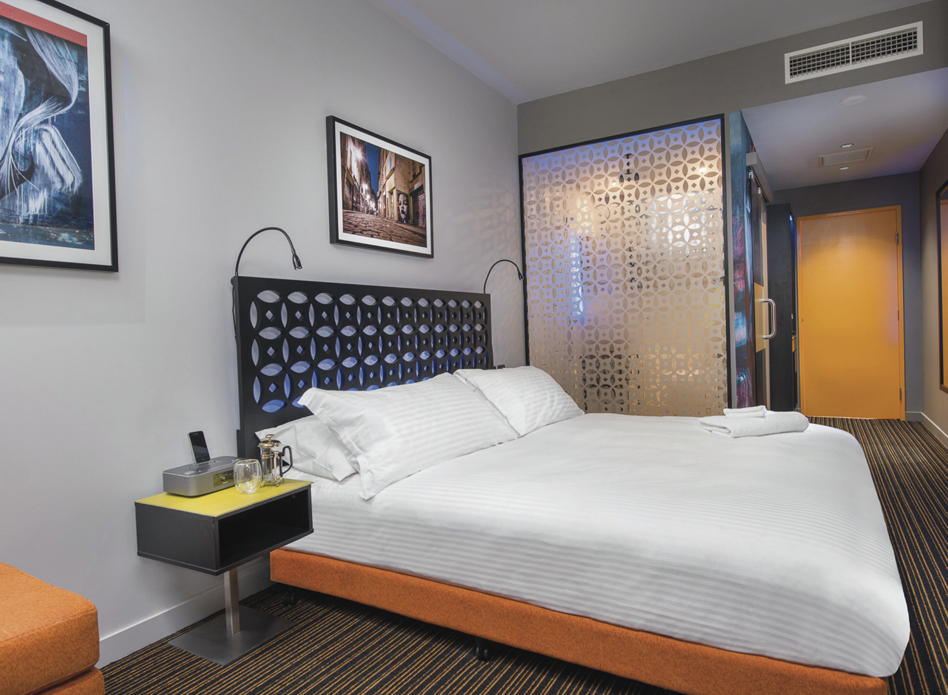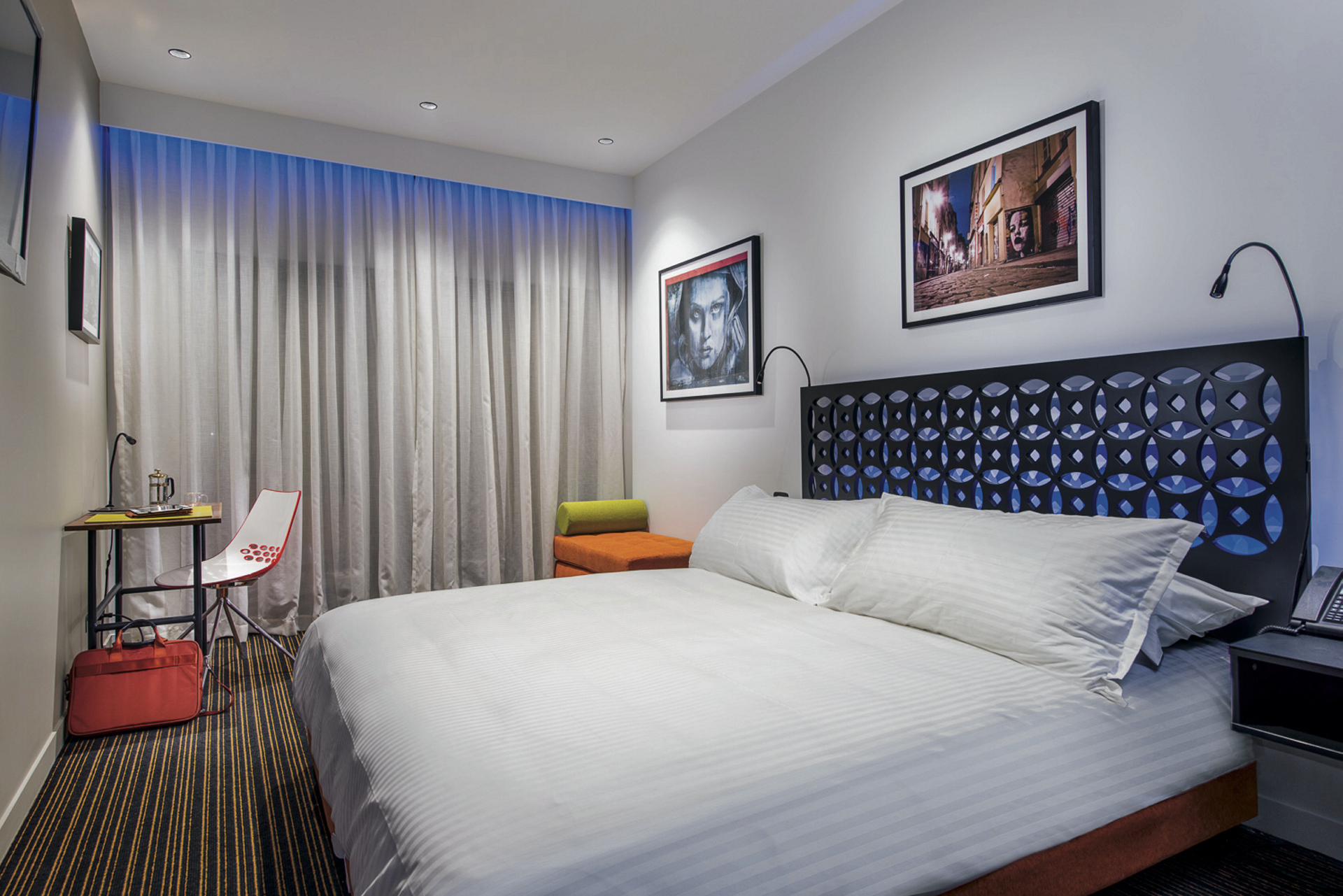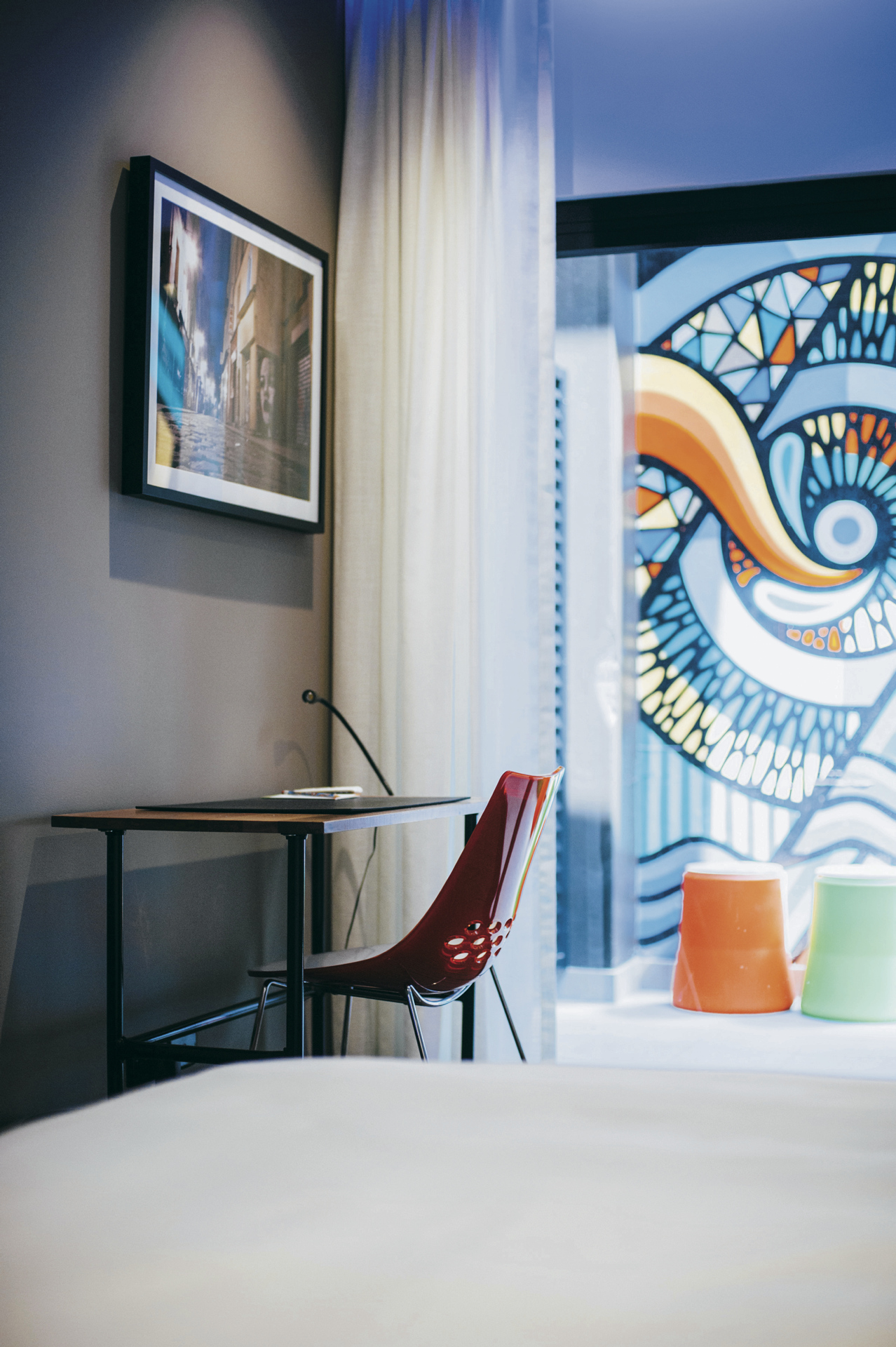 65 klimatisierte Zimmer auf 4 Etagen, individuell mit Street Art dekoriert. Ausgestattet u.a. iPod-Dockingstation, Kaffeepadmaschine und Bad mit Regendusche. King-Zimmer mit größerem King-Size Bett.