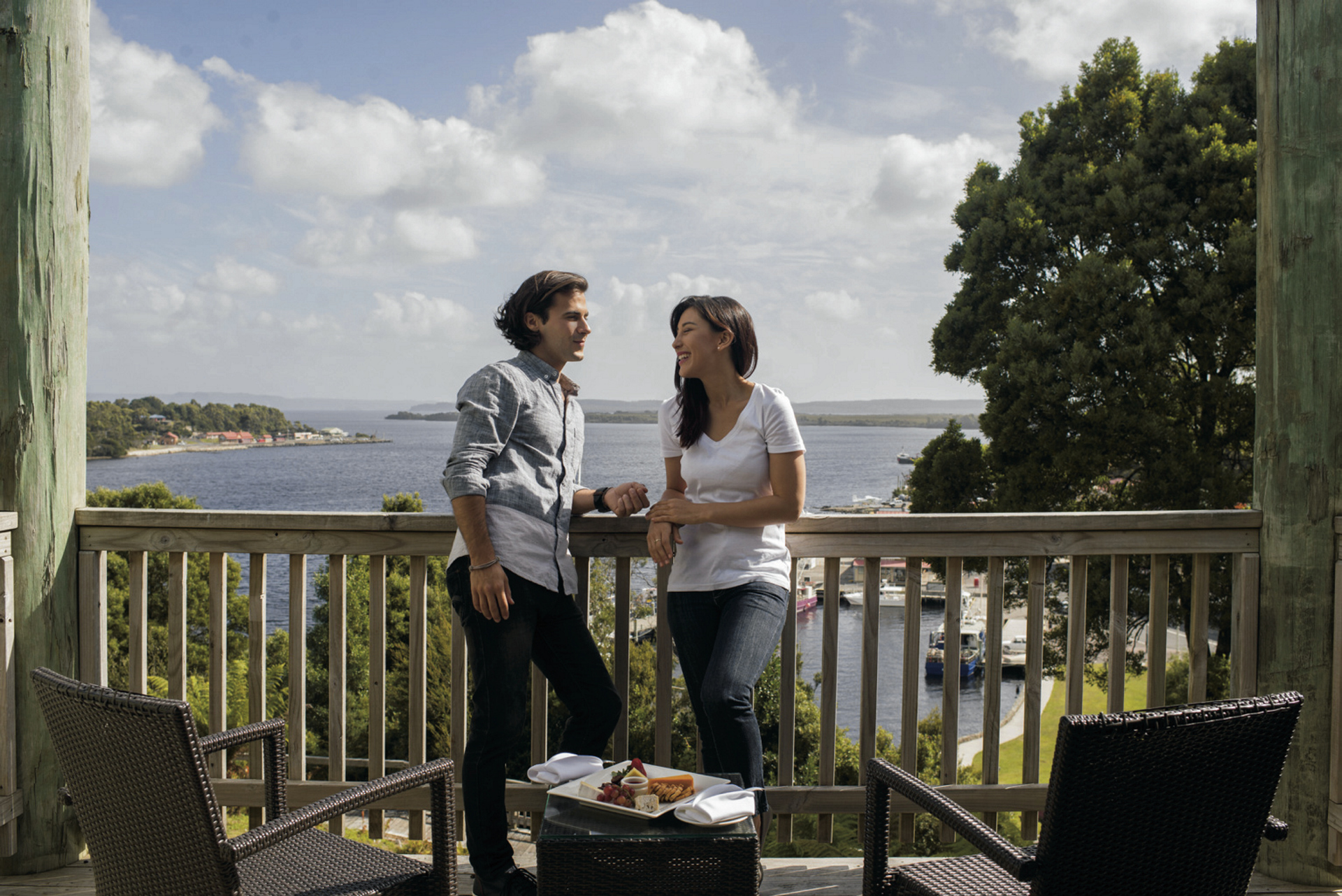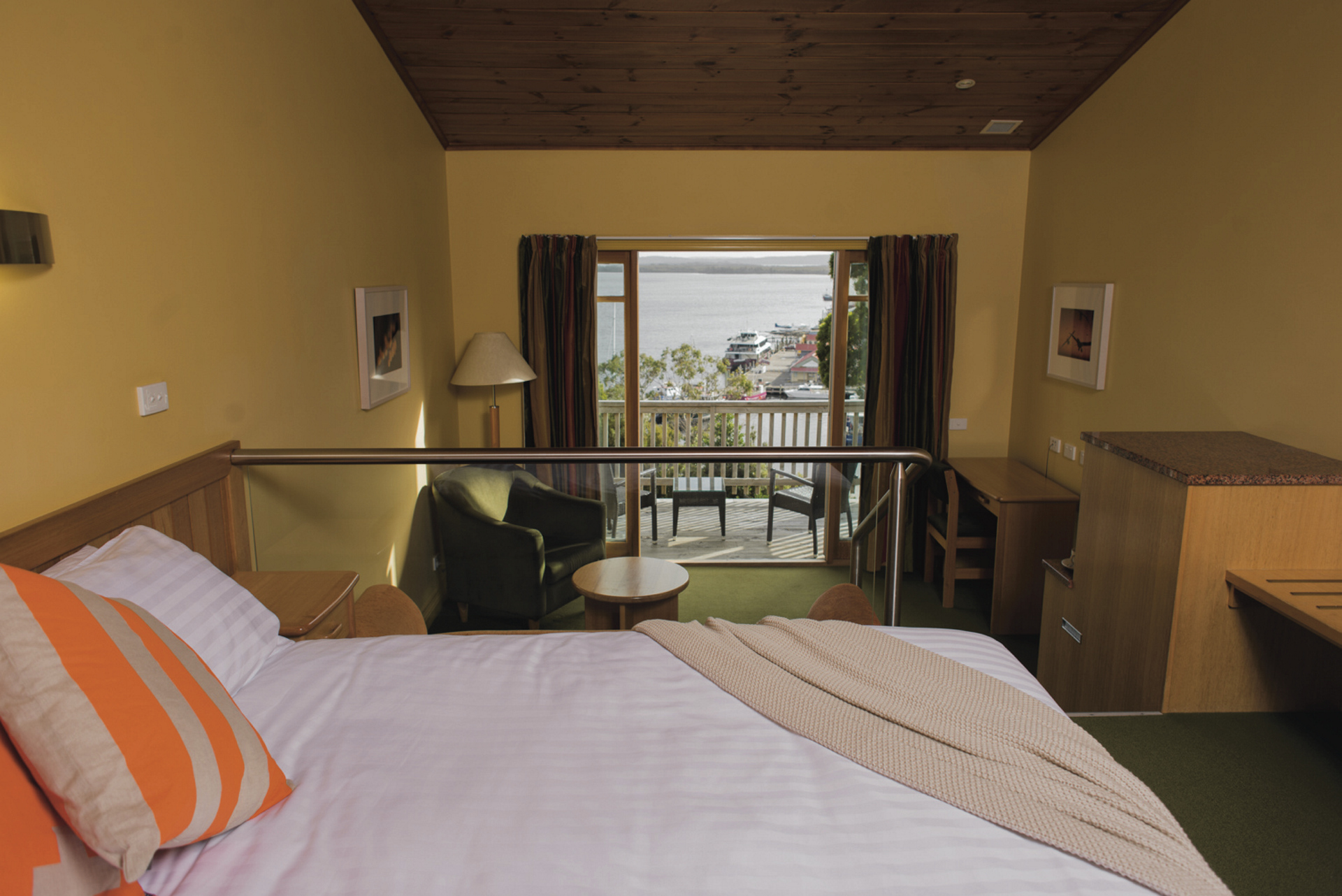 Die Rezeption des Strahan Village liegt an der schmucken Uferpromenade, die Hilltop-Zimmer auf einem angrenzenden Hügel mit herrlichem Blick über Promenade und Hafen.