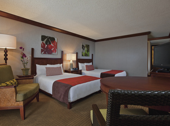 Die 806 luxuriösen Zimmer mit Lanai haben eine Klimaanlage, Safe und kostenloses WLAN. In jedem Zimmer gibt es einen Schreibtisch, Telefon, Kabel-TV mit Spielen und Pay-TV, einen Kühlschrank und Kaffee-/Teezubereiter. Die Badezimmer sind ausgestattet mit Badewannen-/Duschkombination, Bademantel und Fön.
