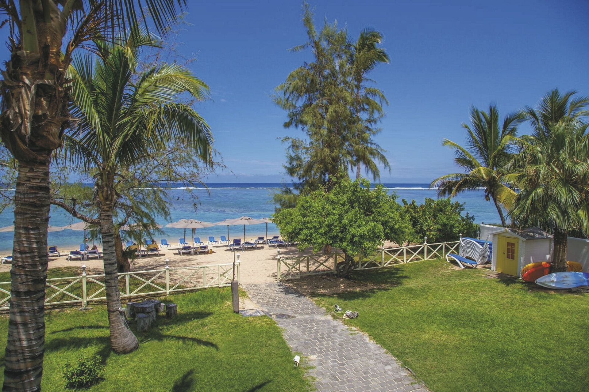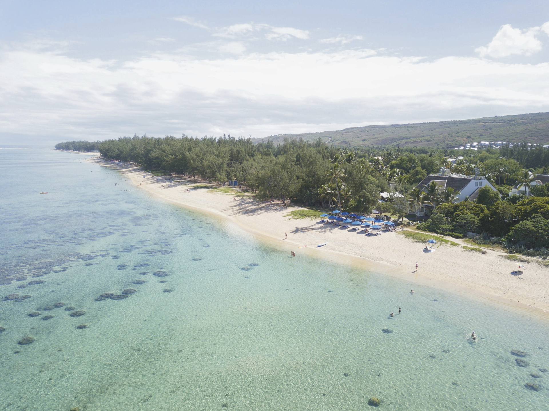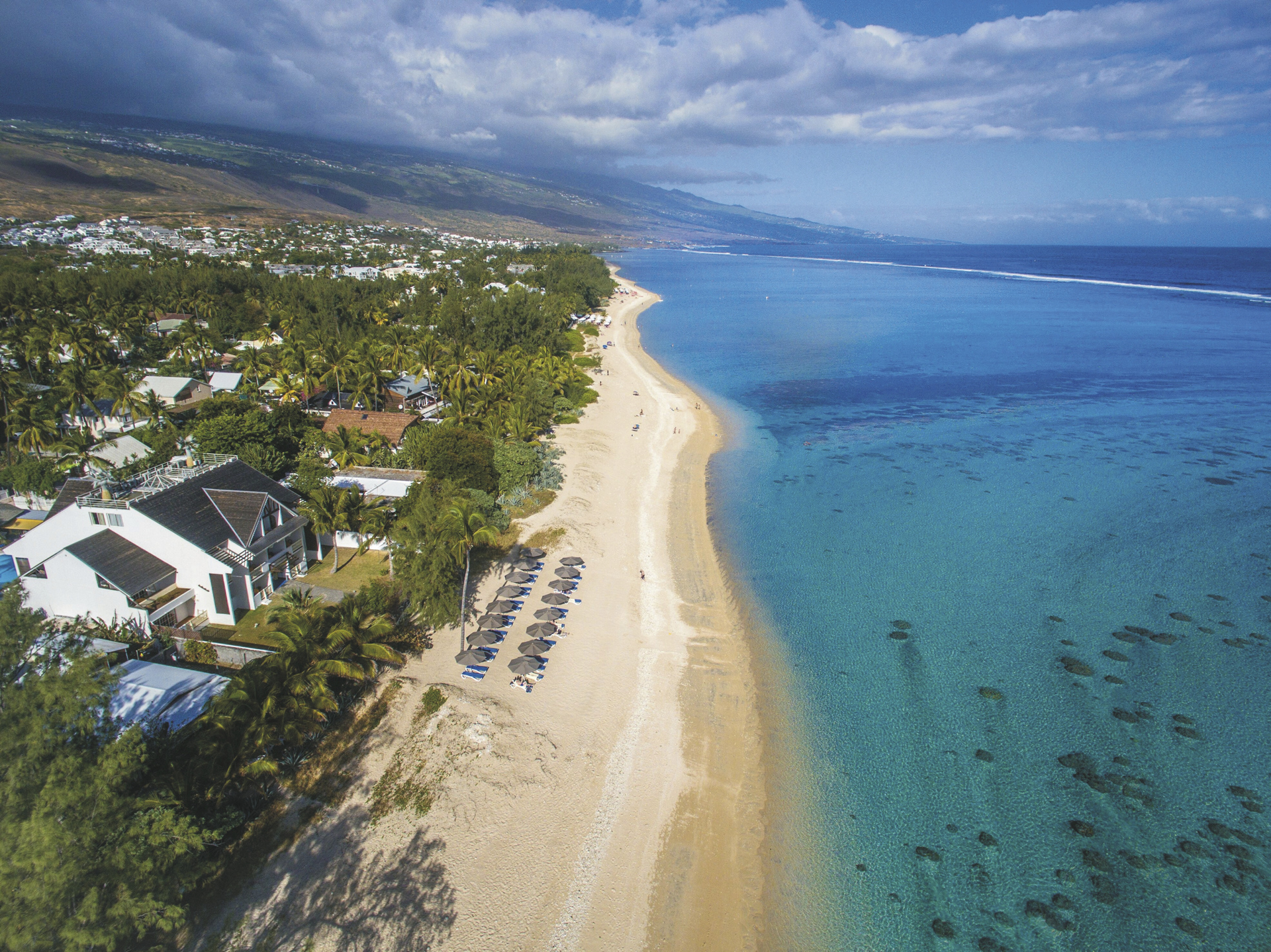 Umgeben von herrlich grüner Landschaft und Kokospalmen direkt am Sandstrand der Lagune von l'Ermitage-Les-Bains. Diese ist aufgrund ihrer reichhaltigen Flora und Fauna geschützt und das farbenprächtige Korallenriff ist ideal zum Schnorcheln.