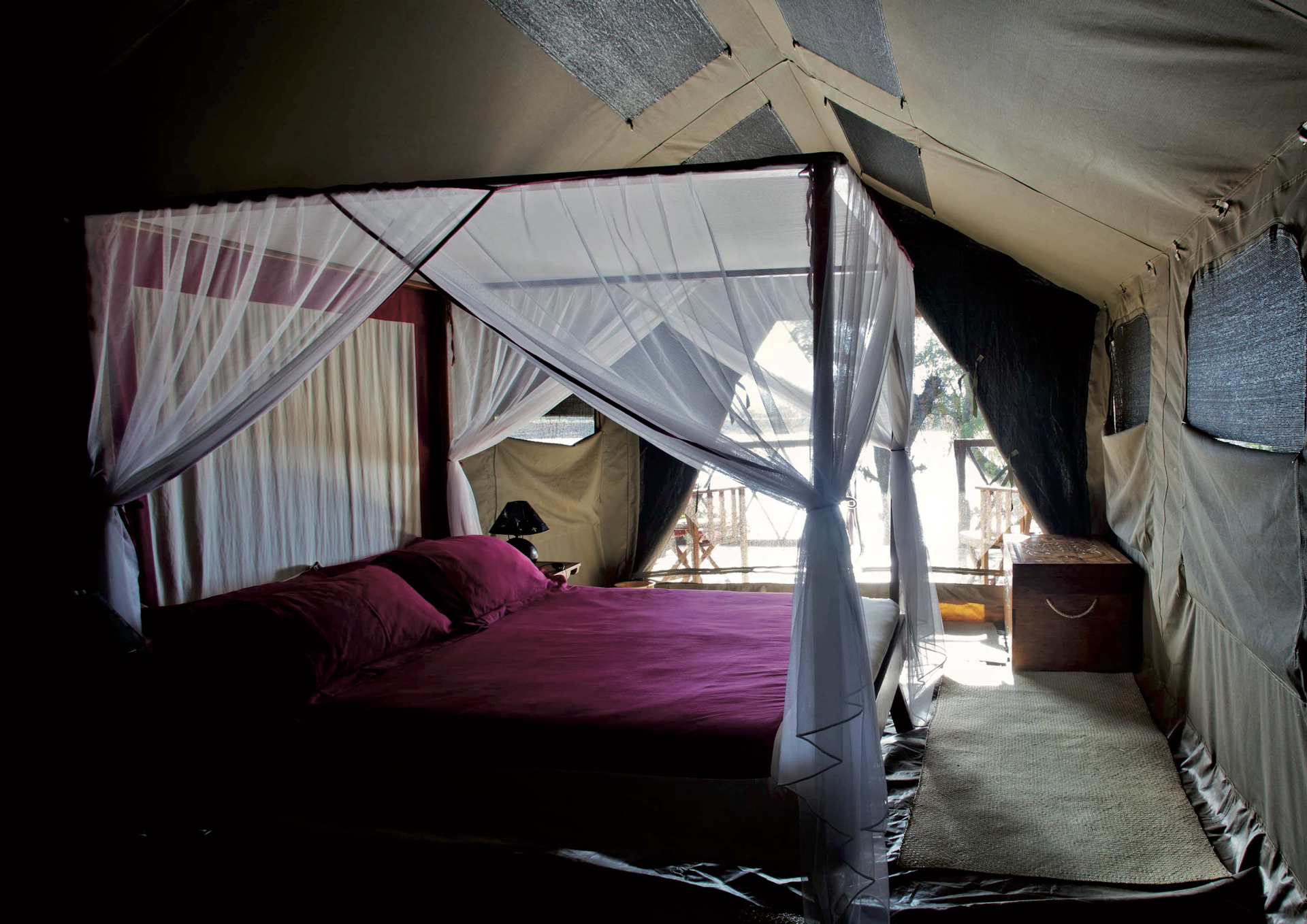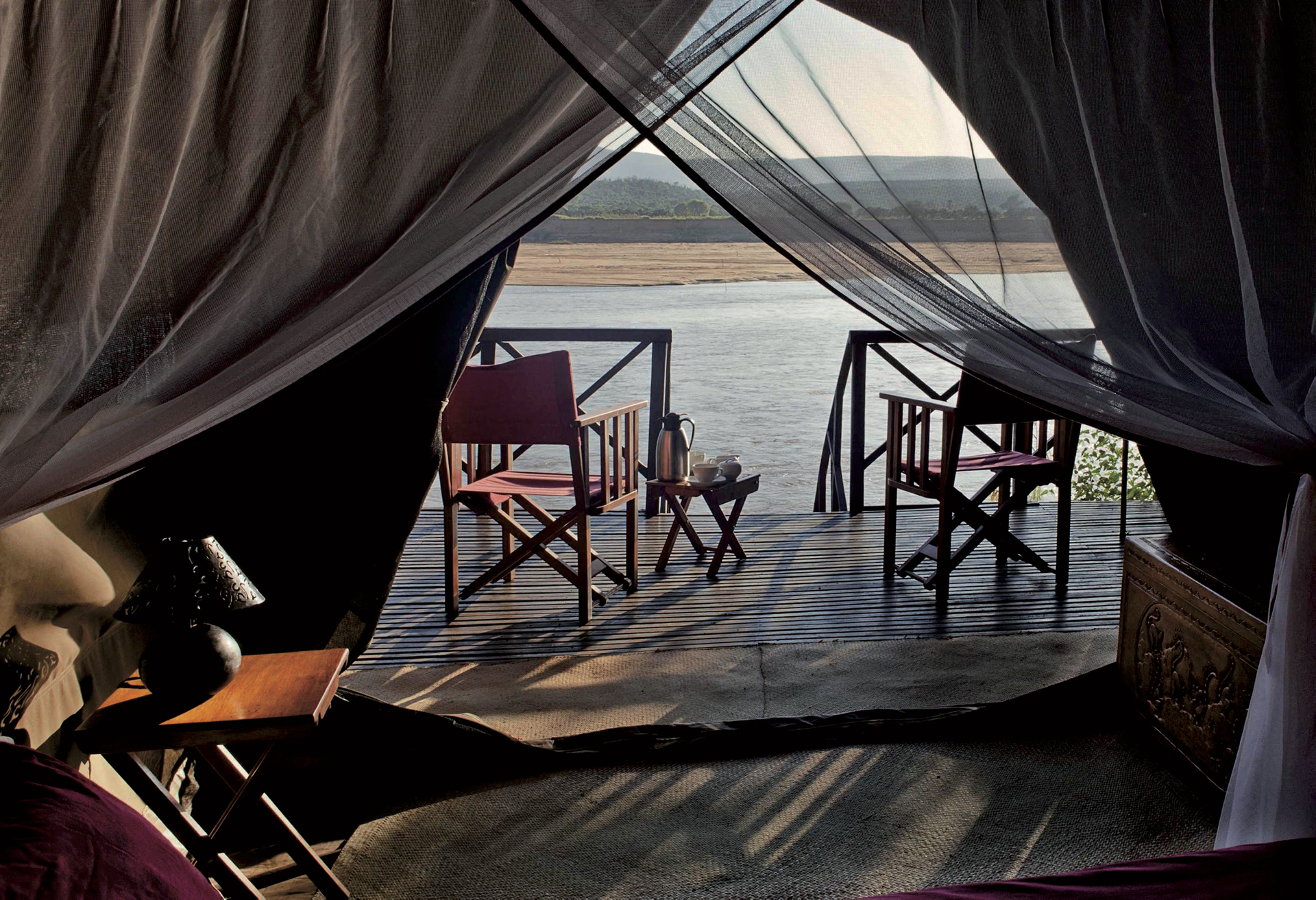 Alle 6 Zelte haben eine private Terrasse, ein Bett mit Moskitonetz, Holzmöbel, sowie 24 Std. Solarbeleuchtung und Warmwasser. Jedes der Zimmer verfügt über einen einzigartigen Blick auf den ruhigen Mandrare Fluss - der perfekte Ort um sich nach einer aufregenden Reise zu erholen.