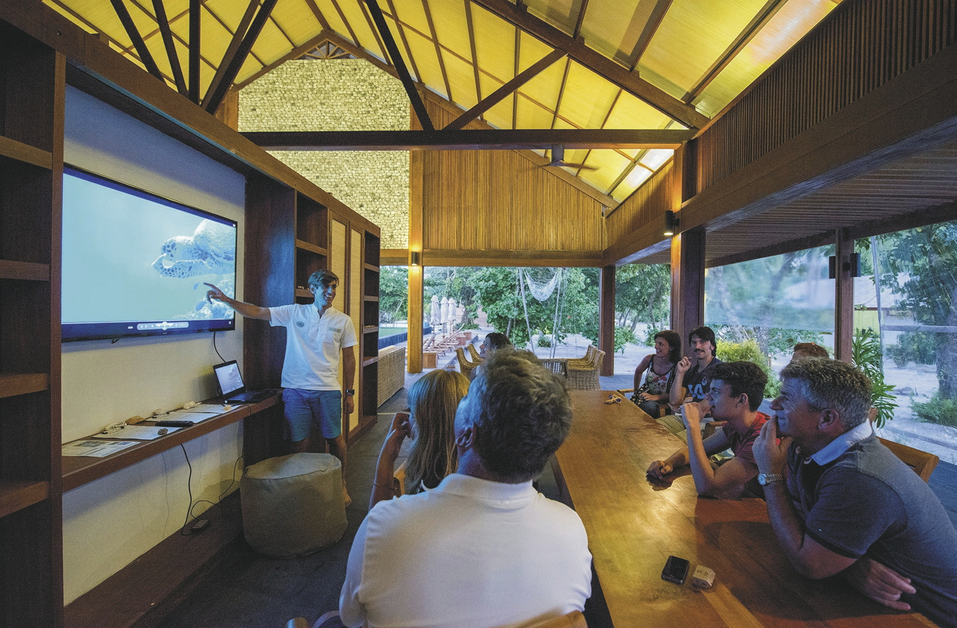 Der ökologische Aspekt spielt im Resort eine große Rolle, so wird der Strom durch Solarpanels erzeugt und das Meerwasser wird entsalzt. Im Restaurant wird der Fang von lokalen Fischern angeboten und Alkohol ist - wie auf der ganzen Insel - verboten, fast, denn der findige Besitzer hat ein altes Schiff restauriert, welches jetzt vorm Strand auf Anker liegt und als Lounge und Bar dient.Für die Gäste des Resorts gibt es außerdem ein Spa, ein Fitnesscenter, eine Boutique, ein Tauchzentrum und Ausflüge über die Insel.