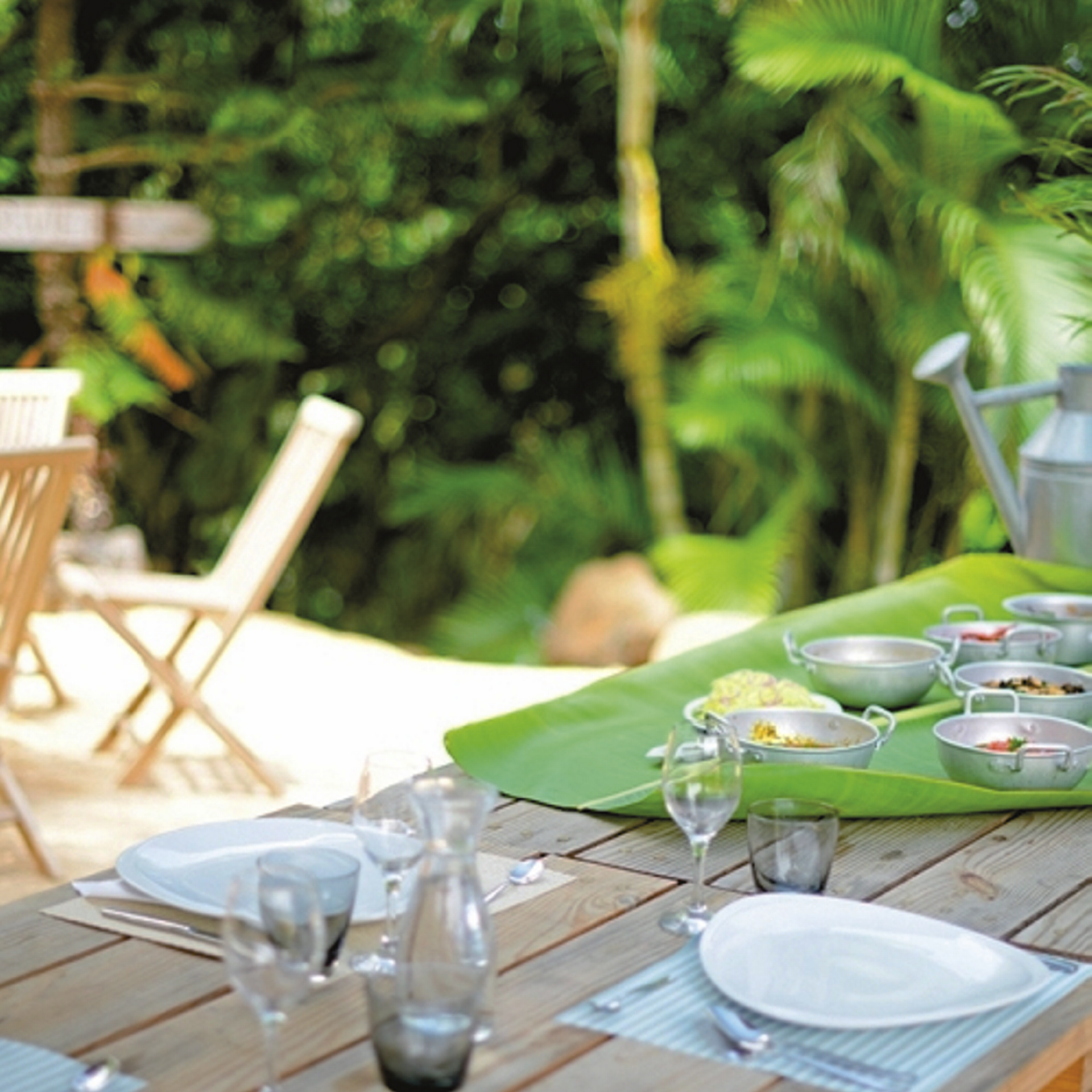 Nachhaltigkeit wird in der Otentic Eco Logde gelebt - alles wurde aus Holz oder Recyclingmaterial erbaut und Sonnenenergie dient der Stromerzeugung und Wassererwärmung. Hier ist alles weniger luxuriös aber dafür authentisch: Die Küche des La Kaz Mané ist lokalen Straßenrestaurants nachempfunden, serviert typisch kreolisches Essen und gegessen wird an einfachen Holztischen unter freiem Himmel mit Blick auf den Fluss.