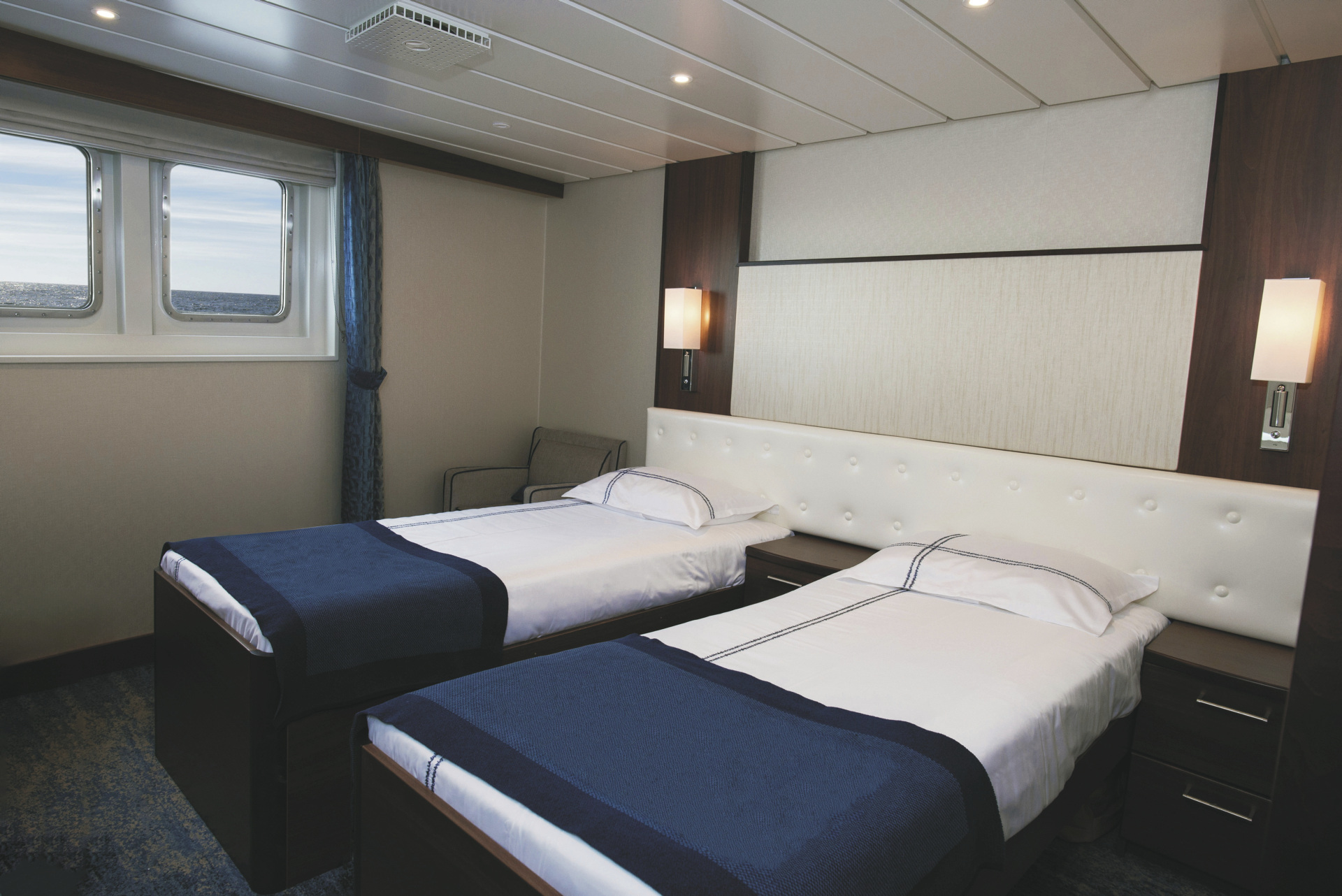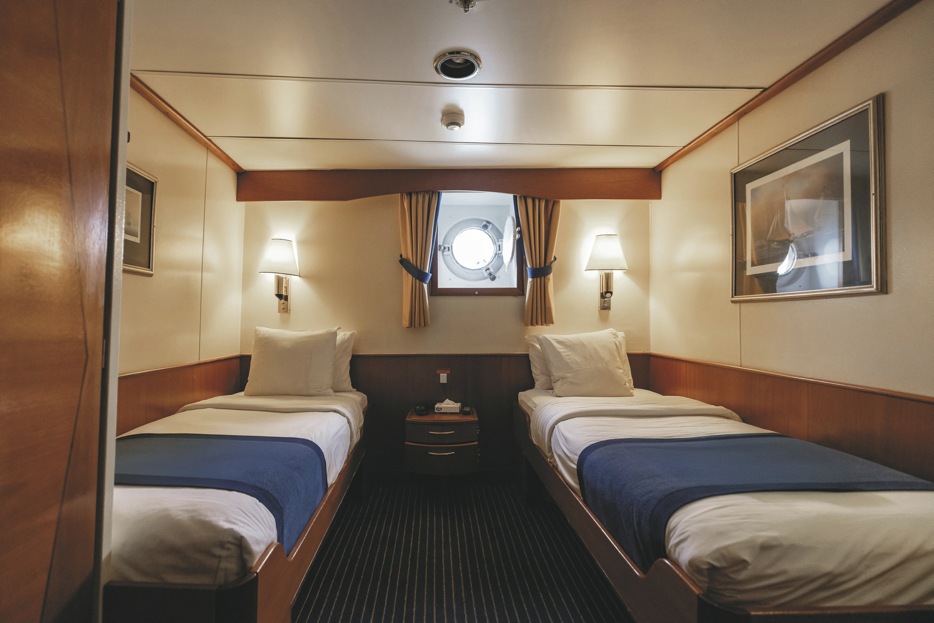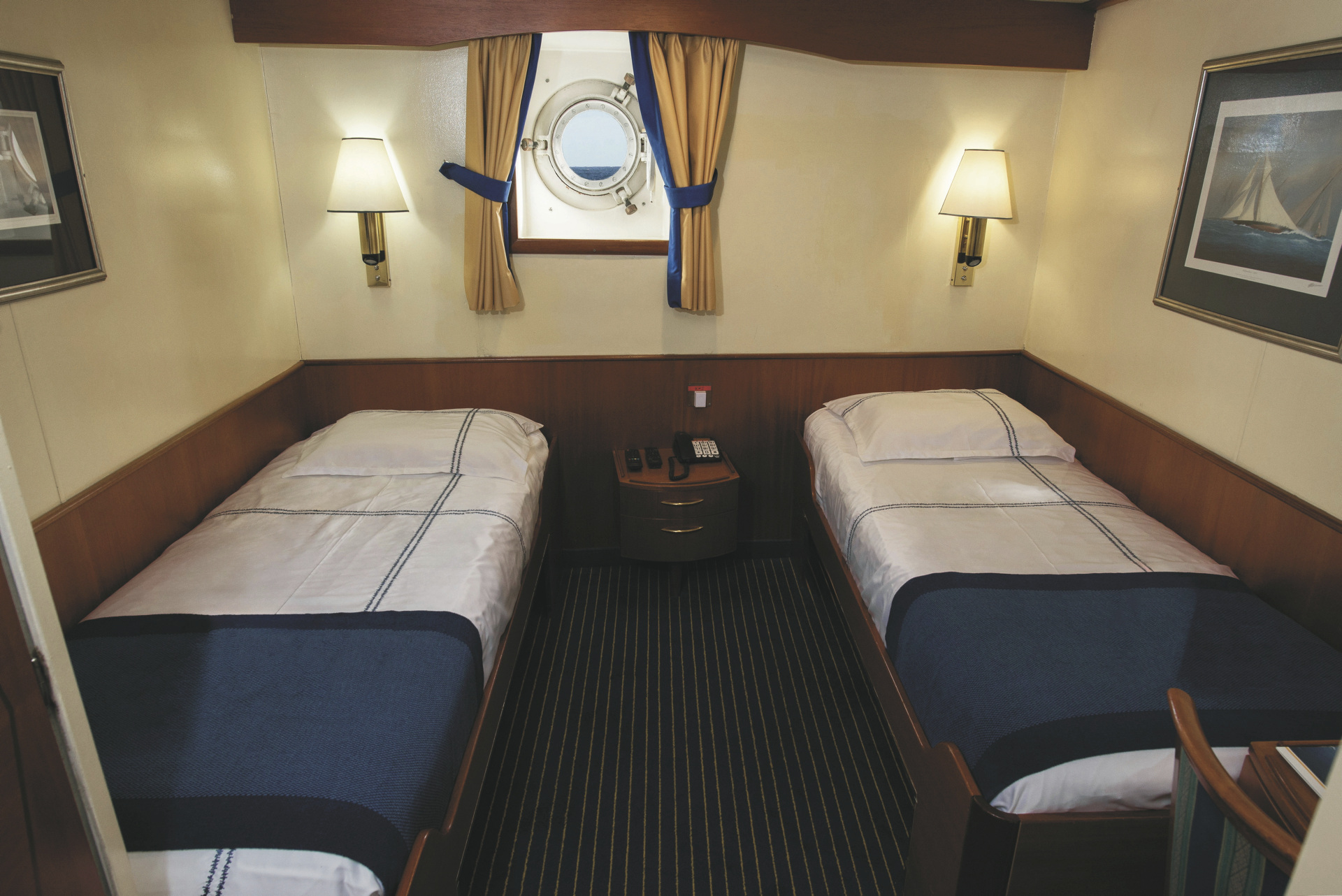 Hauptdeck-Kabine mit Fenster: 11 m², 2 untere Betten, eigenes Bad, 2 Fenster.
