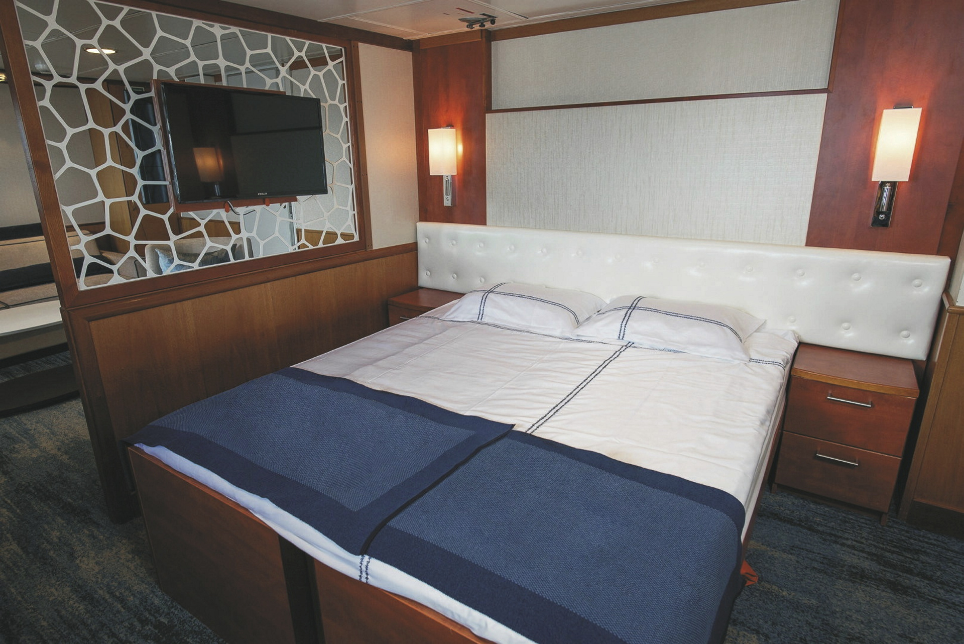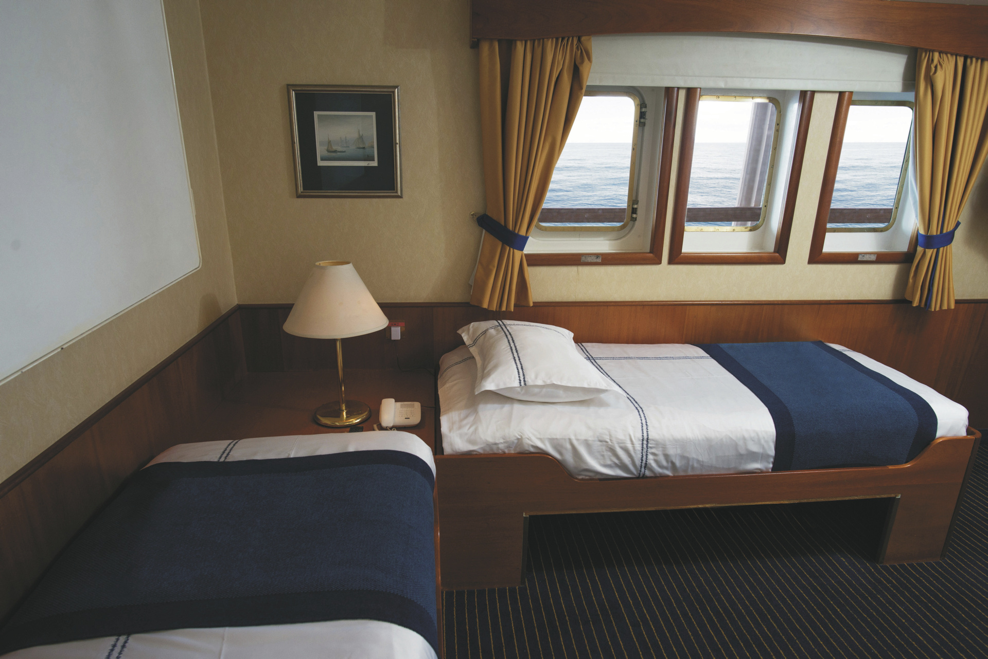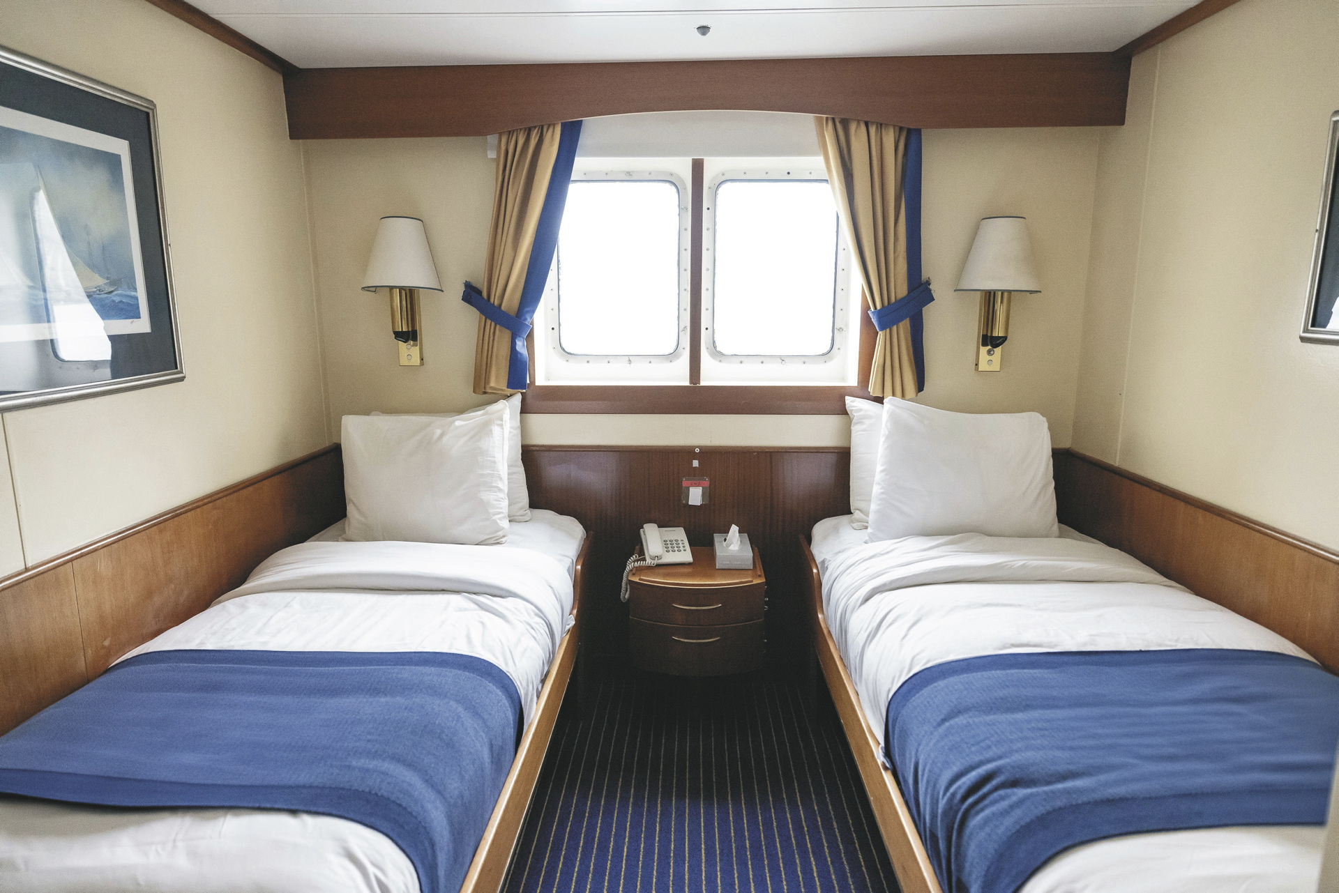Hauptdeck-Kabine mit Fenster: 11 m², 2 untere Betten, eigenes Bad, 2 Fenster.