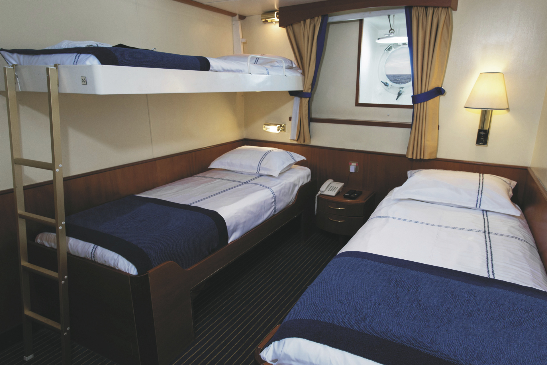 Triple Kabine: 13,5 m², 1 oberes, 2 untere Betten, eigenes Bad, Bullauge.