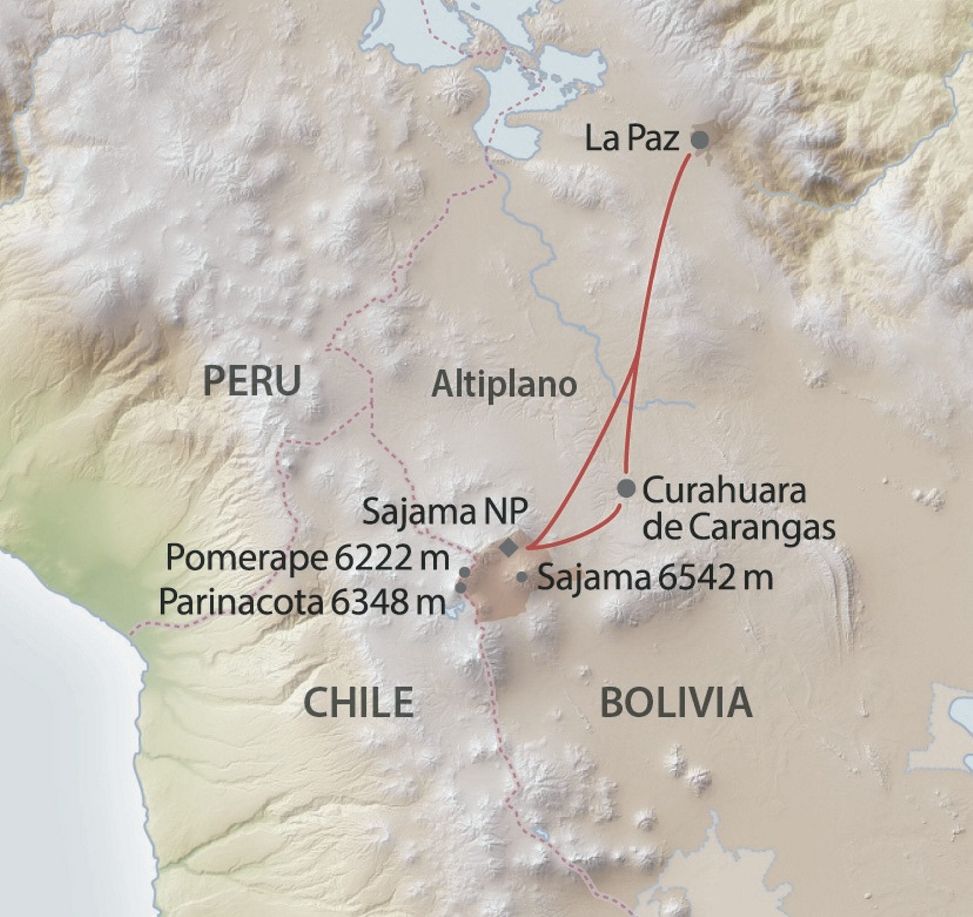 La Paz – Sajama Nationalpark (A).Am Morgen brechen Sie von La Paz in Richtung Sajama-Nationalpark auf. Unterwegs besuchen Sie die beeindruckende Kirche von Curahuara de Carangas – bekannt als die „Sixtinische Kapelle des Altiplano“. Sie durchqueren die weiten Ebenen des Hochlands, besichtigen geheimnisvolle Grabtürme, die sogenannten Chullpas, und halten an den spektakulären Felsformationen des Valle de Rocas. Am frühen Nachmittag erreichen Sie den Sajama-Nationalpark. Nachmittags steht ein Spaziergang durch den geschützten Quenua-Wald auf dem Programm, ein Naturwunder und einer der höchst gelegenen der Erde.