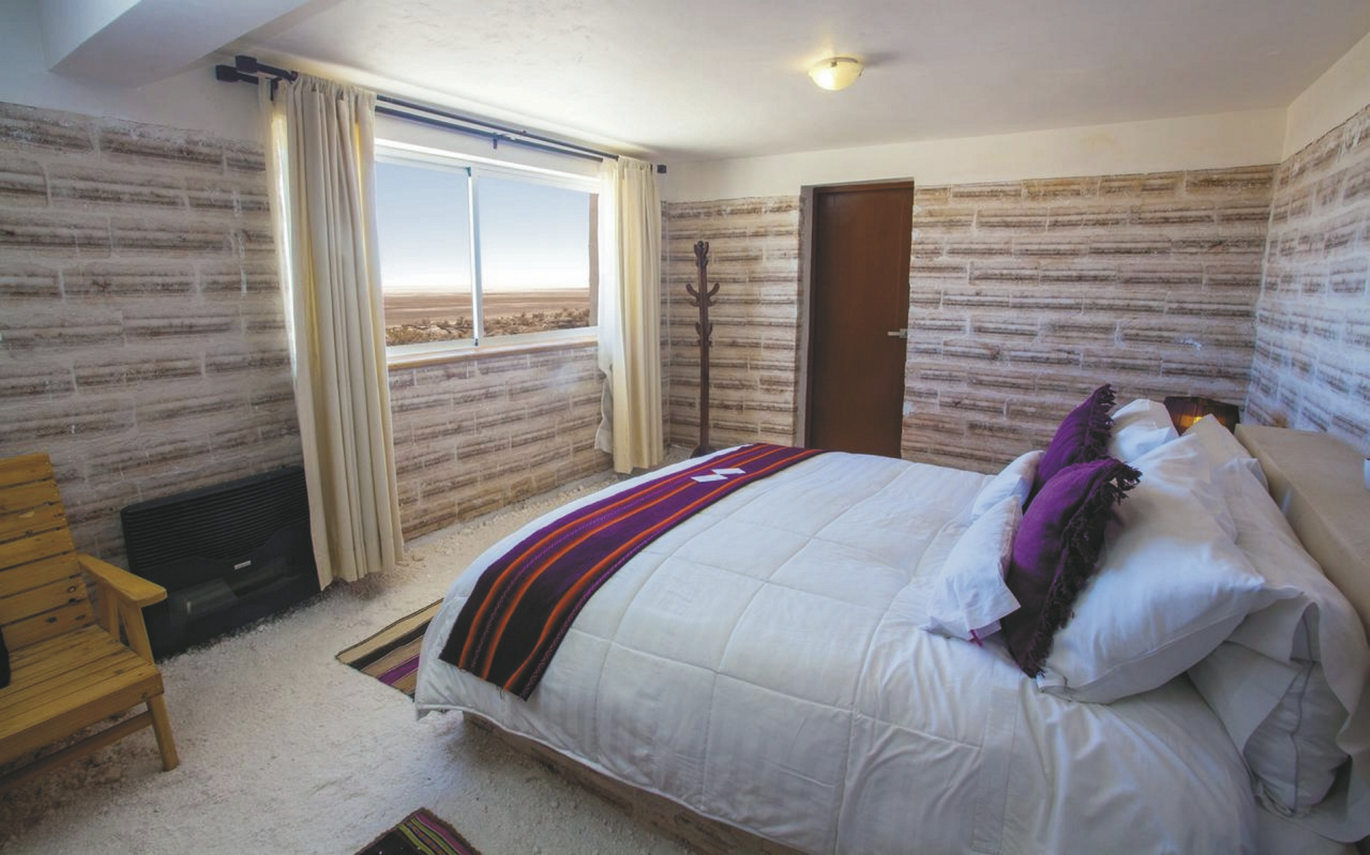 Die 49 fast komplett aus Salz erbauten Zimmer sind einfach, aber einladend eingerichtet. Sie verfügen über eine Heizung, Telefon, Föhn und ein Bad mit DU/WC. Die Deluxe-Zimmer haben größere Fenster und einen Holzfußboden.