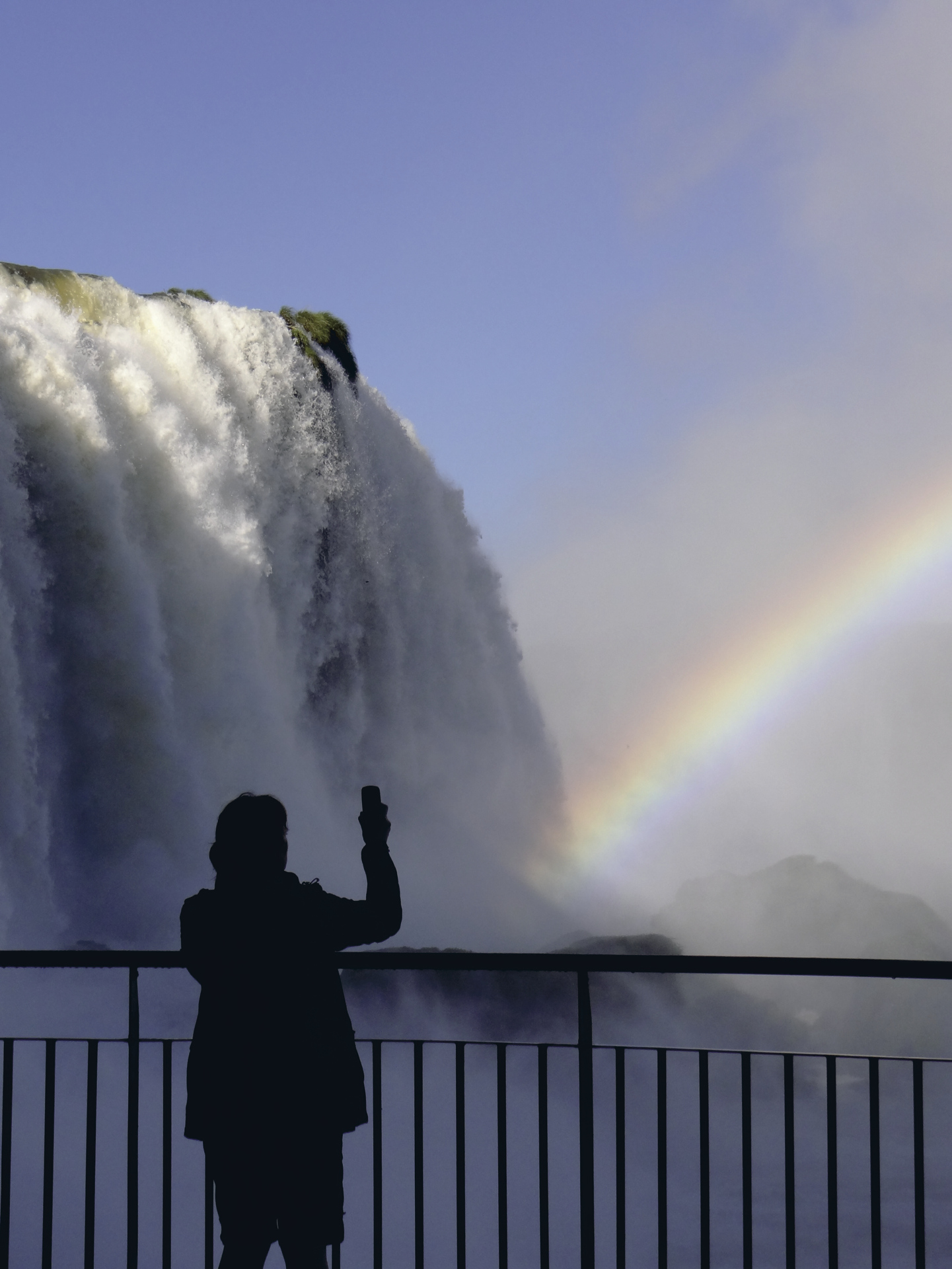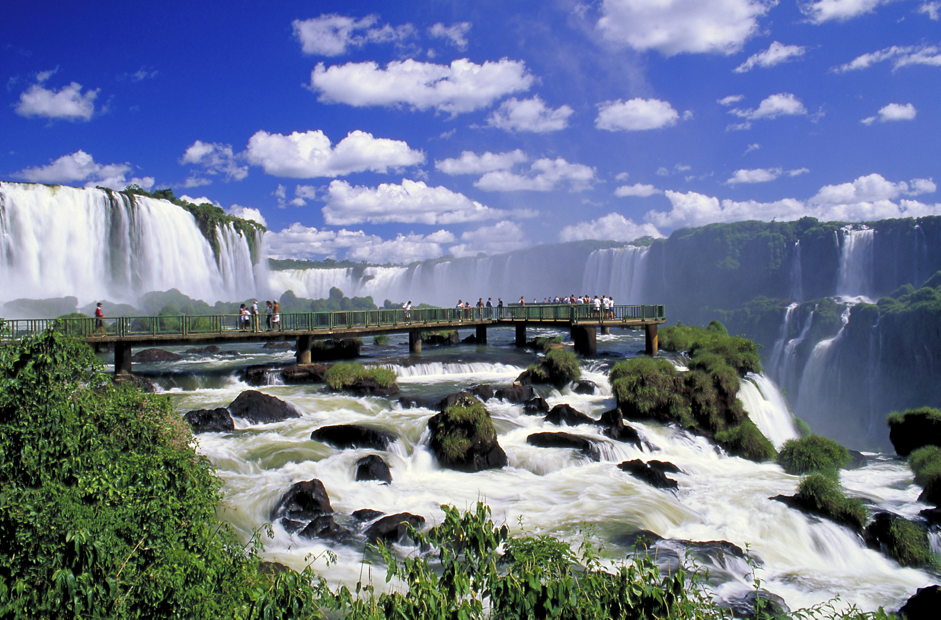 hinabstürzt. Die Iguaçu-Wasserfälle sind die spektakulärsten von ganz Südamerika: Insgesamt 275 Wasserfälle donnern einen 3 km breiten Abgrund hinab, wodurch eine ewige Wand aus Sprühnebel entsteht, in der zahllose Regenbögen schillern.