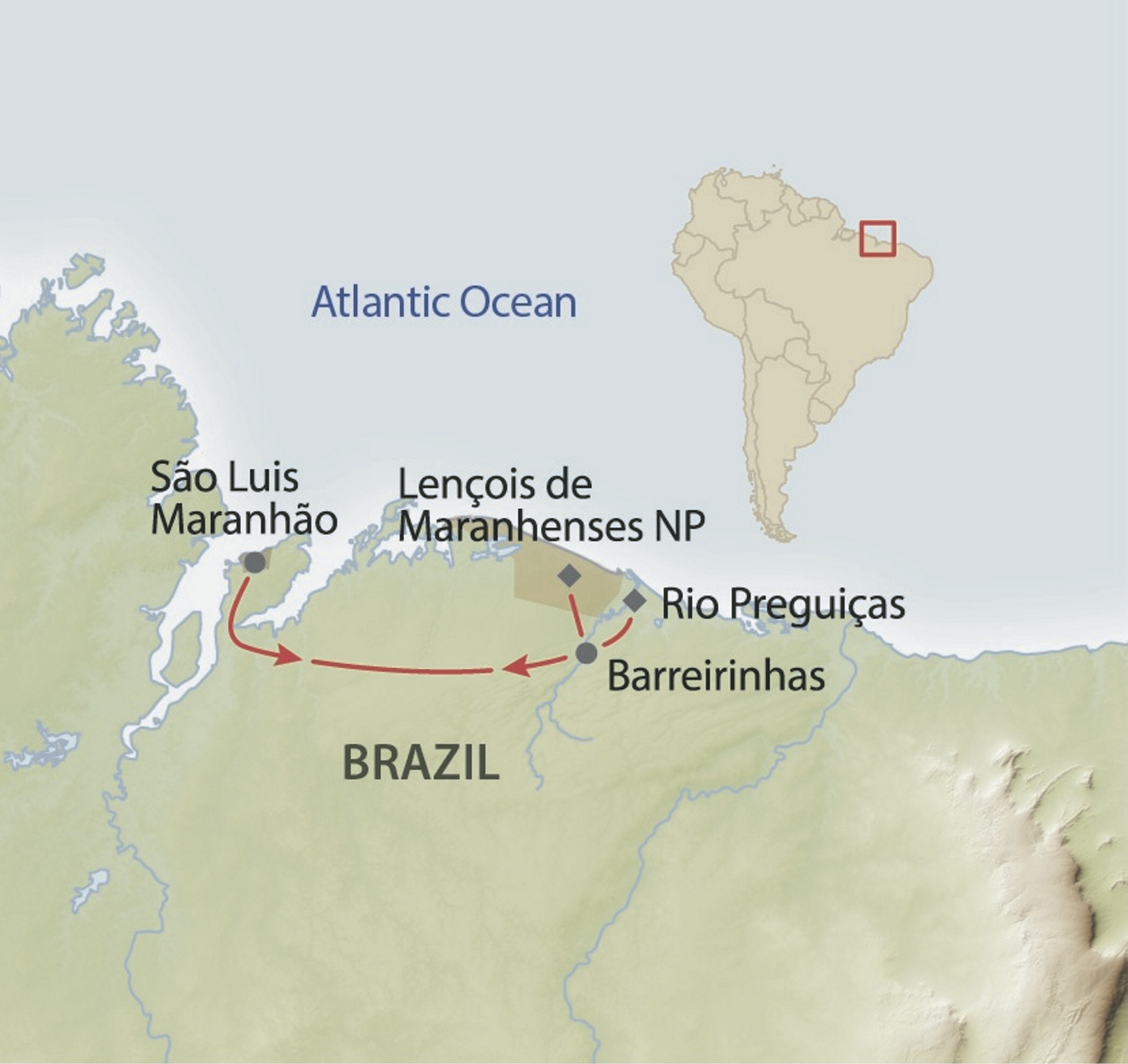 Atins - Sao Luis (F).Am Vormittag unternehmen Sie einen Ausflug mit dem Allrad-Fahrzeug zu den Dünen von Lençóis Maranhenses. Sie gelten als eines der sieben Weltwunder der Natur und beherbergen eine Vielzahl von bislang unbekannten Lebewesen. Am Nachmittag Sammeltransfer zurück nach Sao Luis.