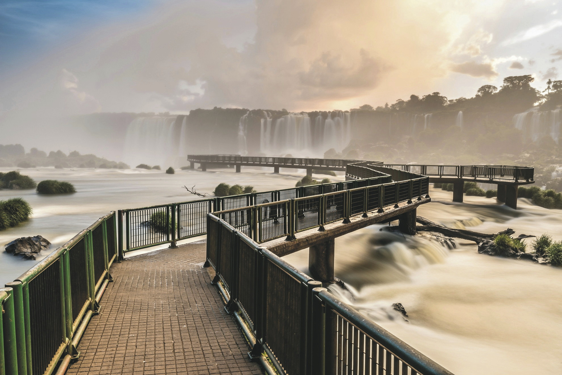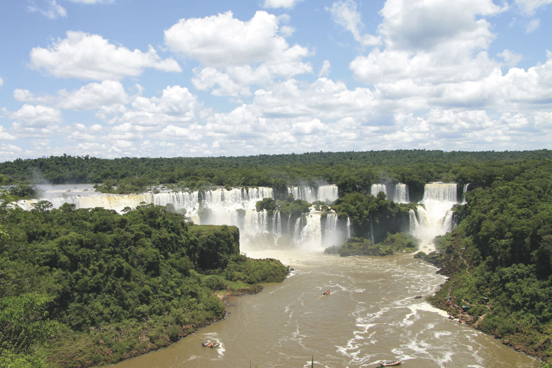 Die Iguaçu-Wasserfälle – "Großes Wasser" in der Sprache der Guarani – sind eines der Naturwunder Brasiliens. Die 275 Wasserfälle erstrecken sich über eine Breite von drei Kilometern und fallen bis zu 80 Meter in die Tiefe. Dadurch sind sie breiter als die Victoria-Fälle und höher als die Niagara-Fälle. Weder Worte noch Fotos werden ihnen gerecht, man muss sie gesehen und gehört haben. Ehe sie durch den weißen Mann entdeckt wurden, waren die Wasserfälle jahrtausendelang eine heilige Begräbnisstätte für die Stämme der Tupi-Guarani und der Paraguás. Die Gegend umfasst außerdem eine der am besten erhaltenen Regenwälder des Landes, reich an Bromelien, Orchideen, Zedern und Araukarien. Im Nationalpark von Foz do Iguaçu gibt es auch interessante Vögel wie Sperber, Spechte, Eulen, Tukane und Reiher, sowie Nasenbären und Affen zu sehen, und mit etwas Glück bekommen die Besucher einige dieser Tiere auch zu Gesicht. Andere hier heimisch Tiere wie Tapire, Otter und sogar Jaguare werden in aller Regel nicht gesichtet.