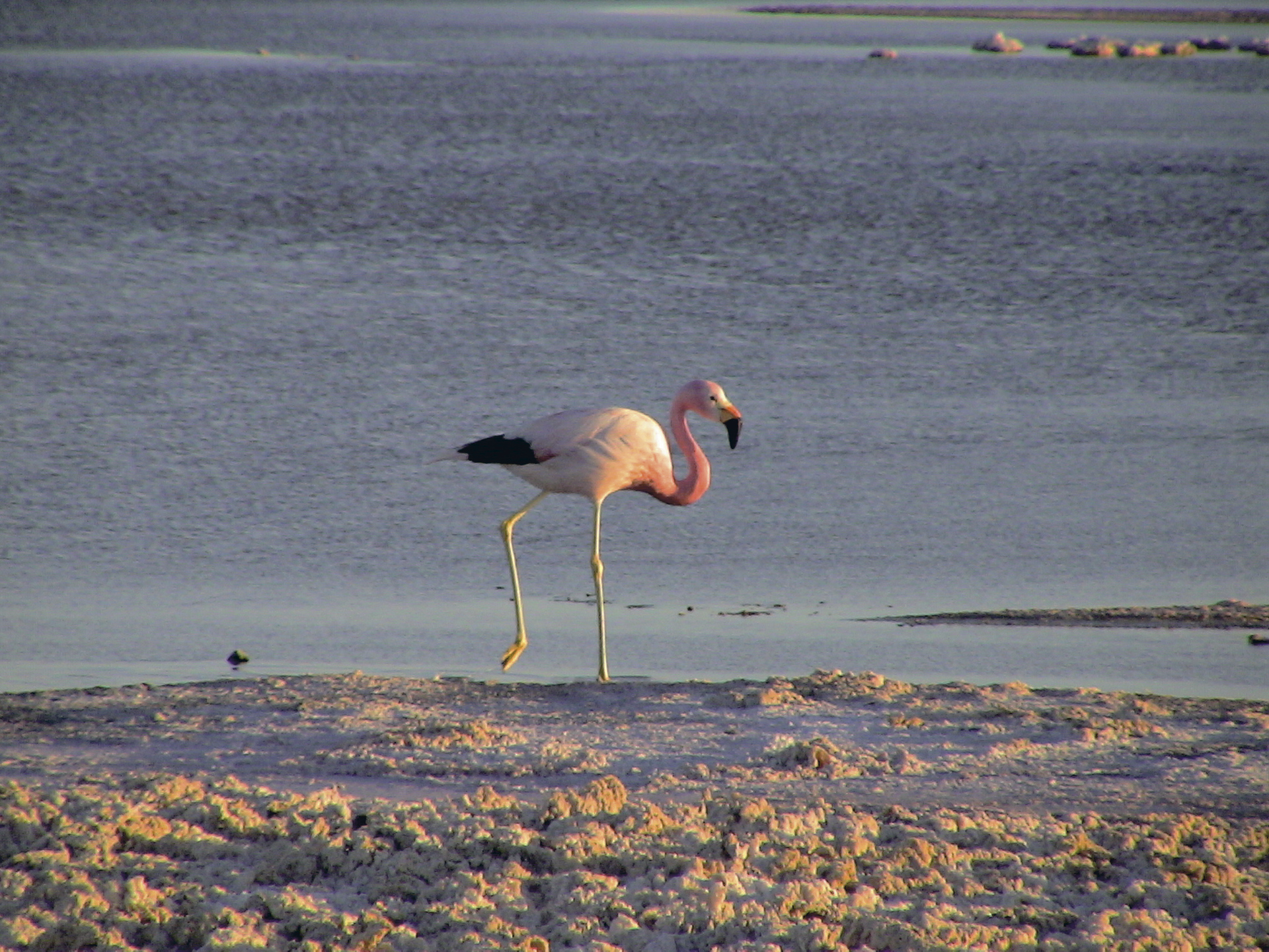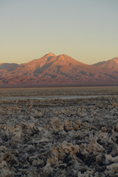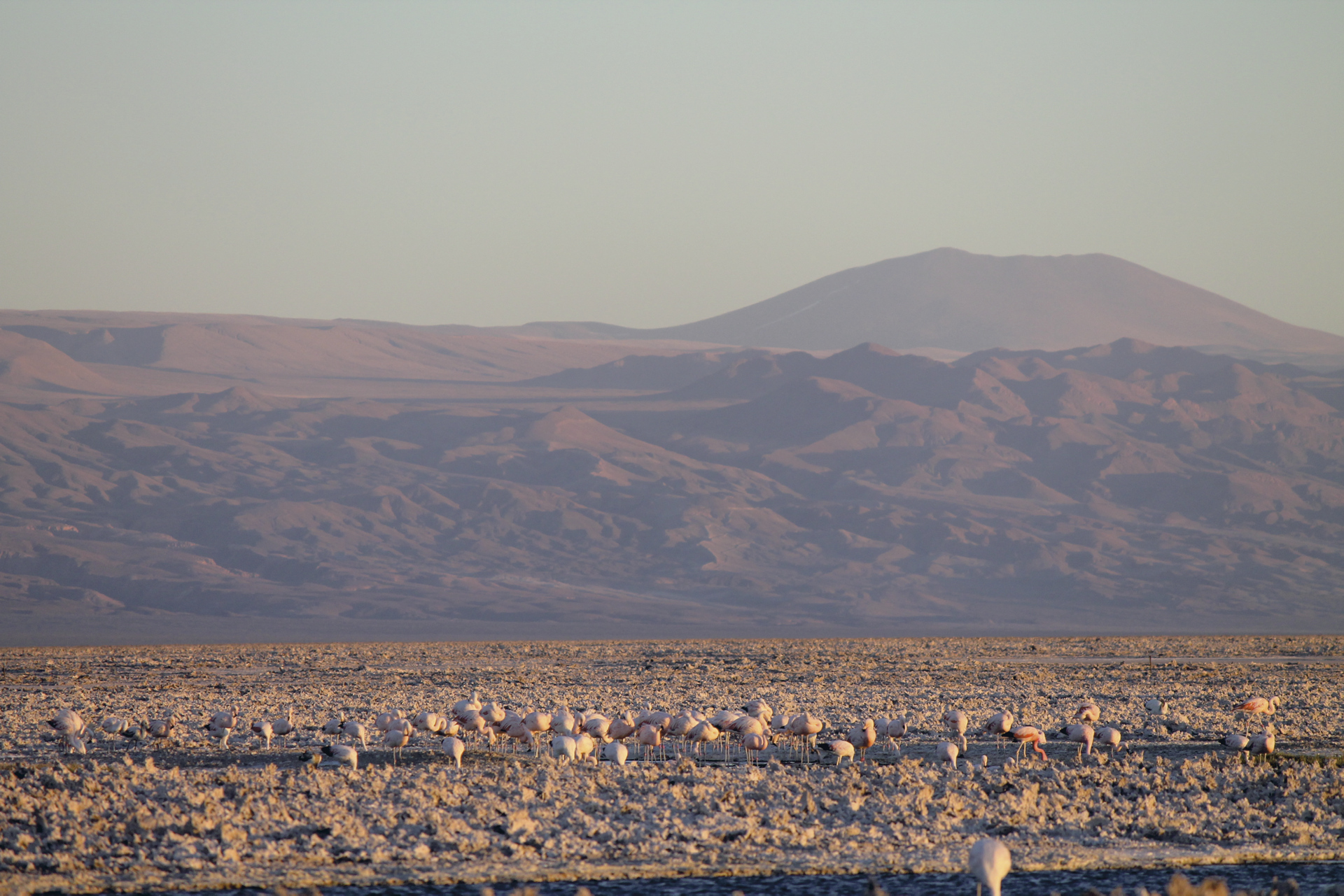 Nachmittags, auf dem Weg zum Salzsee Salar de Atacama, besuchen Sie das kleine Dorf Toconao. Die meisten Gebäude sind dort aus weißem Vulkangestein erbaut. Der Salzsee ist Lebensraum für Flamingos und verschiedene Vogelarten. Die riesige Ebene aus Salzkristallen vor der Kulisse der Anden ist ein einzigartiges Erlebnis. An der Lagune Chaxa können Sie Flamingos aus nächster Nähe beobachten und zum Abschluss einen faszinierenden Sonnenuntergang erleben, der die Andenkette in Rot- und Violett-Töne taucht.