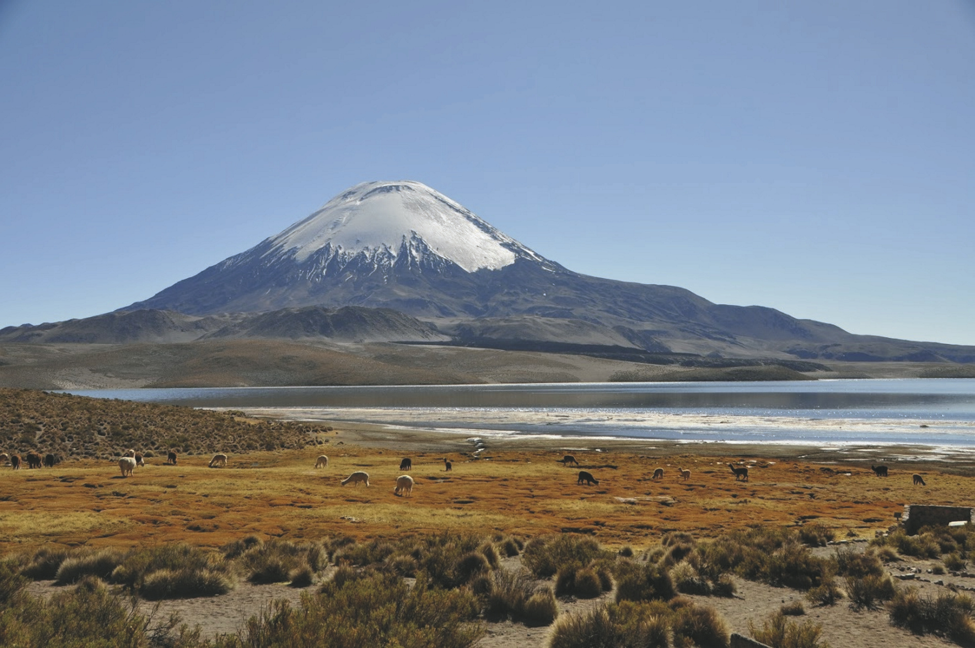 Nationalpark Lauca (F).Die einzigartige und für das harte Hochlandklima erstaunlich reichhaltige Flora und Fauna wird Sie in ihren Bann ziehen. Flamingos, Guanacos, Lamas, Alpacas, Vicunas, Kondore, Vizcachas (Hasenmäuse) und viele andere Tierarten leben in dieser surrealen Landschaft, die geprägt ist von Vulkanen und Seen. Mit etwas Glück sehen Sie, wie sich auf dem Wasser des Lago Chungara (4.500 m), dem höchstgelegenen See der Erde, der imposante Vulkan Parinacota (6.110 m) spiegelt. Interessant ist auch der Besuch des kleinen Dorfes Parinacota mit seiner Kirche aus dem 17. Jahrhundert.