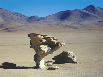 Siloli-Wüste - San Pedro de Atacama (F/M).Vorbei am Arbol de Piedra (Steinbaum), einer von Erosion geschaffenen Steinfigur, erreichen Sie die von Algen rotgefärbte Laguna Colorada, Heimat unzähliger Flamingos. Viele landschaftliche Höhepunkte warten noch auf Sie: das Geysirfeld Sol de Manana mit zischenden Wasserdampfsäulen und blubbernden Erdlöchern, die Thermalquellen von Polques, wo Sie in einer herrlichen Landschaft unbedingt ein Bad nehmen sollten, das Panorama der sog. Dali Wüste und als Höhepunkt die Laguna Verde, eine türkis schimmernde Lagune am Fuß des Vulkans Licancabur. An der Grenzstation Hito Cajon verabschiedet sich Ihr Reiseleiter und ein Fahrer erwartet Sie, um Sie zu Ihrem Hotel in San Pedro de Atacama zu bringen