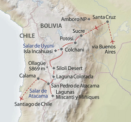 Die Reise führt durch das bolivianische Hochland mit Höhen über 4.000 Metern. Höchster Übernachtungspunkt auf 4.520 Meter. Die Nächte können hier sehr kalt werden. Strom in den Hotels (Tag 6-8) ist nur wenige Stunden abends verfügbar, Warmwasser i.d.R. nur abends, da dieses durch Sonnenwärme erhitzt wird.Bei wetterbedingter Grenzschließung (Bolivien/Chile) erfolgt die Fahrt über eine Alternativroute. Entstehende Mehrkosten sind nicht eingeschlossen und müssen vor Ort von den Reisenden selbst bezahlt werden!