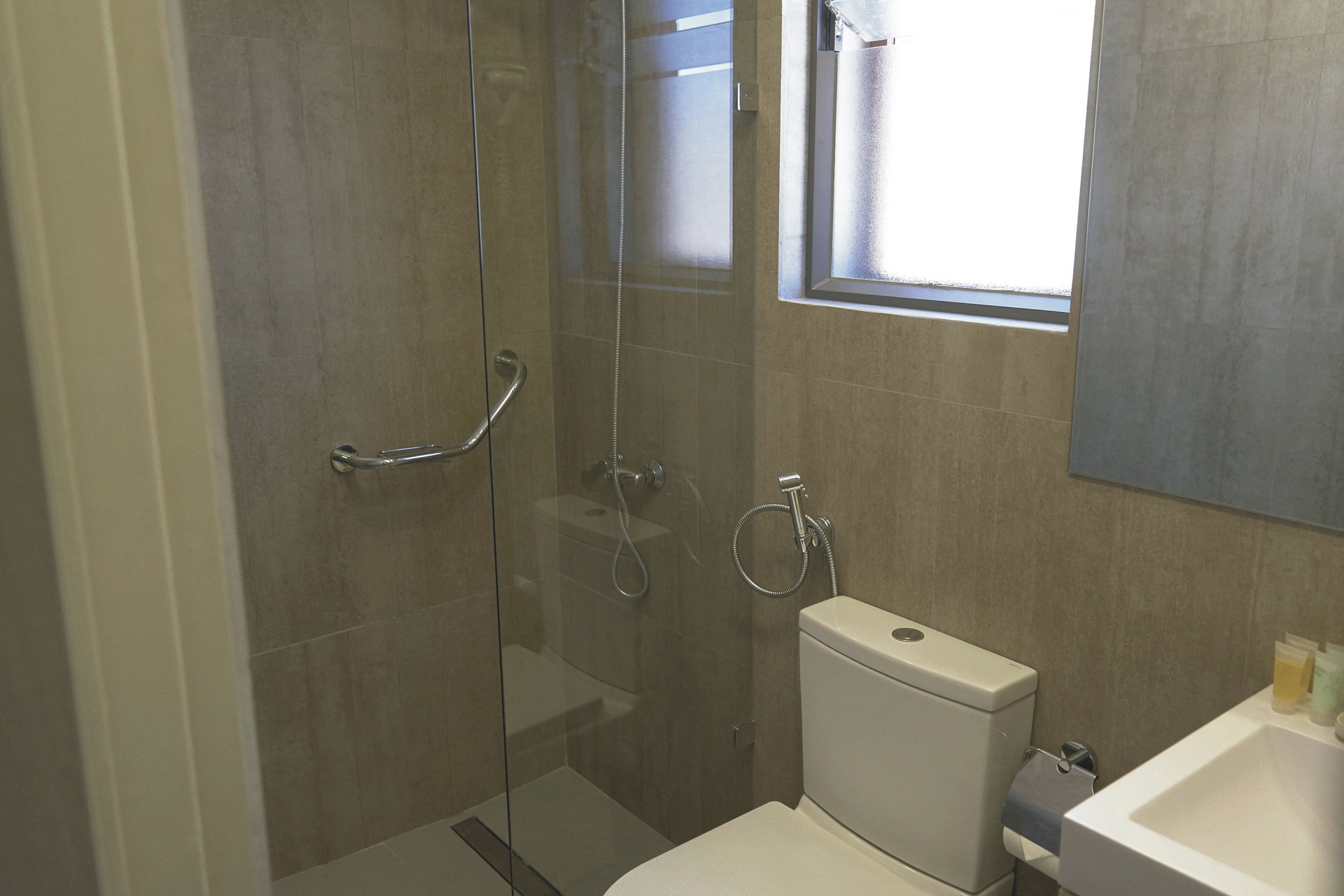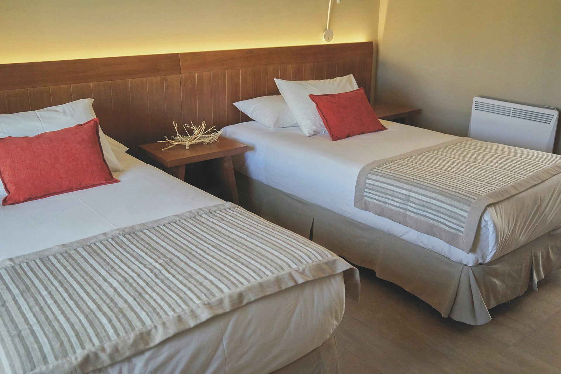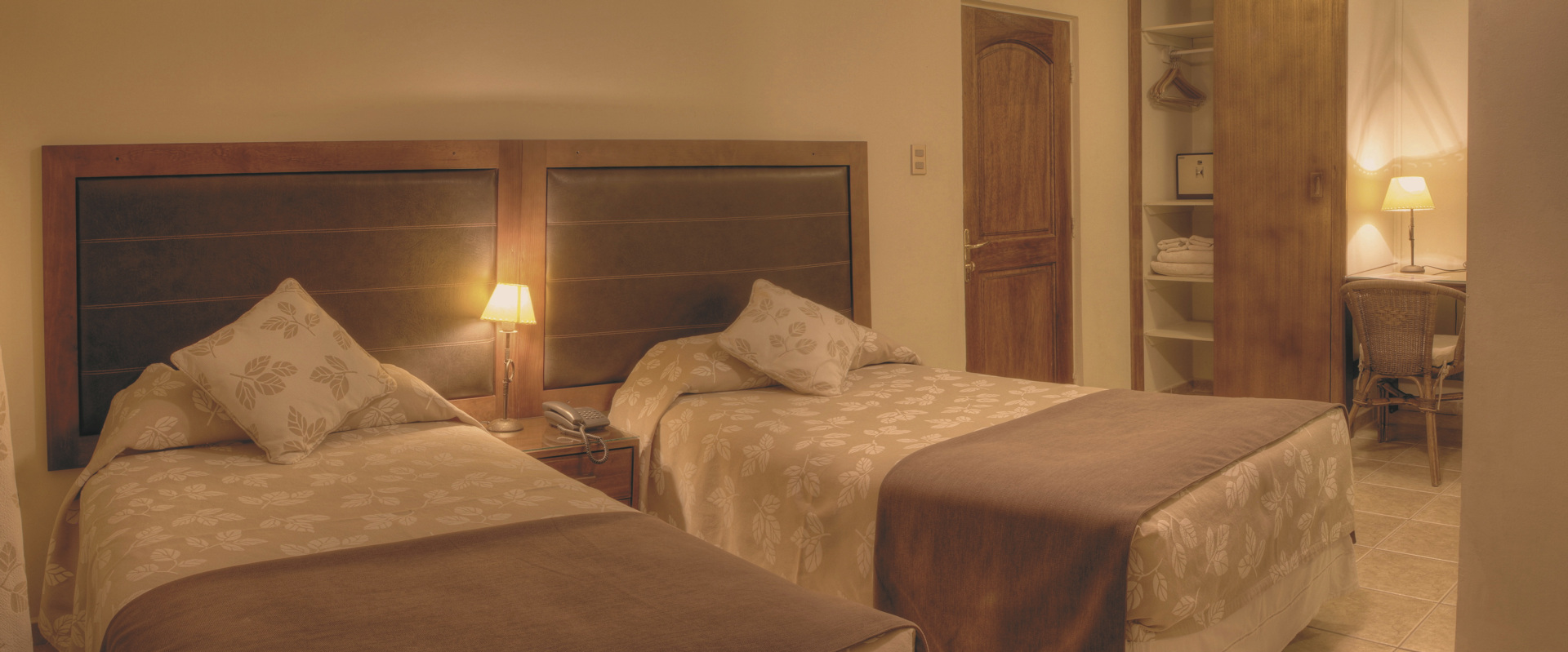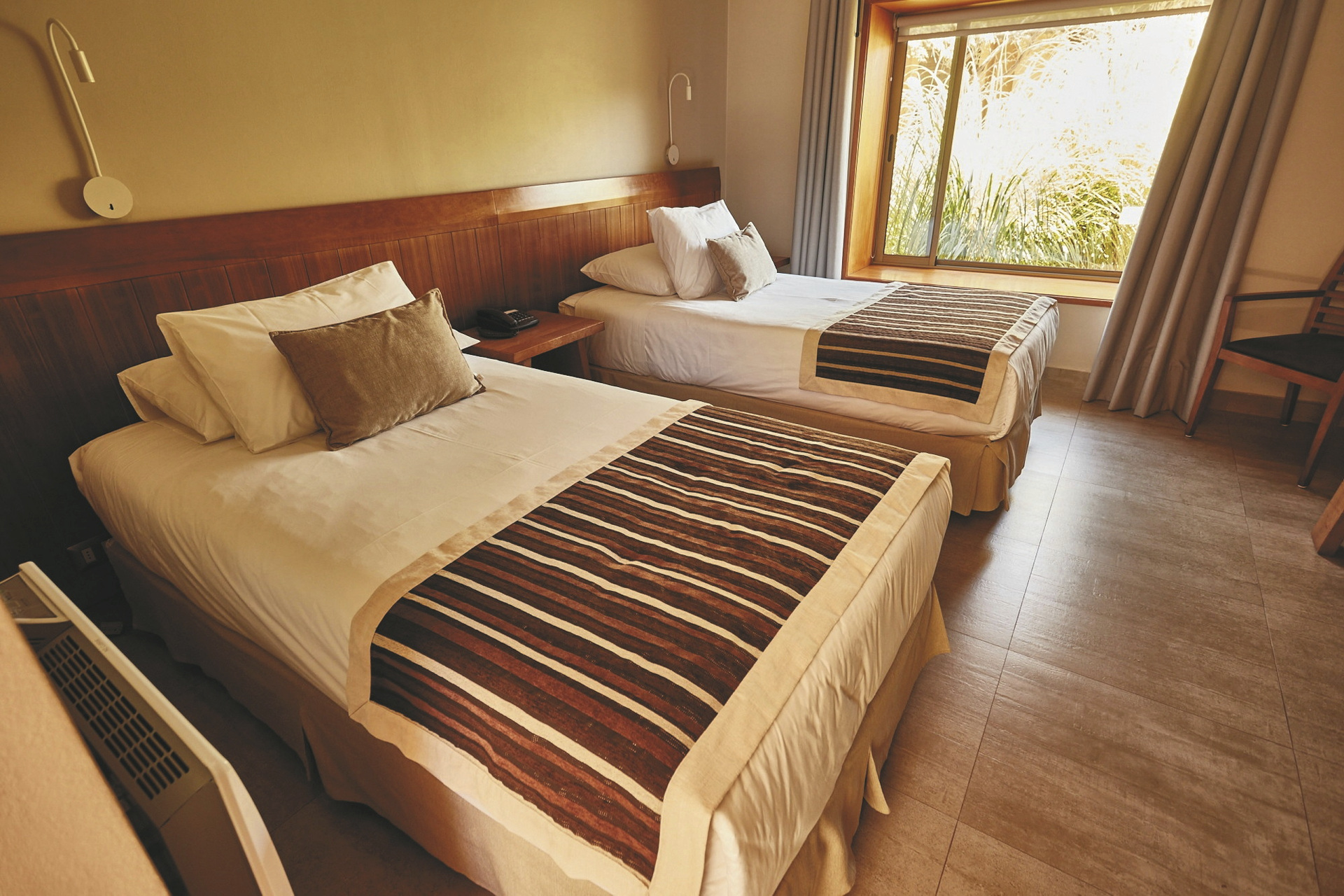 Erdfarben dominieren in den 49 geräumigen Zimmern, die einfach, aber einladend eingerichtet sind. Sie sind ausgestattet mit Telefon, Heizung, Safe, WLAN, einem kleinen Schreibtisch, einem Bad mit DU/WC und einer kleinen Terrasse.