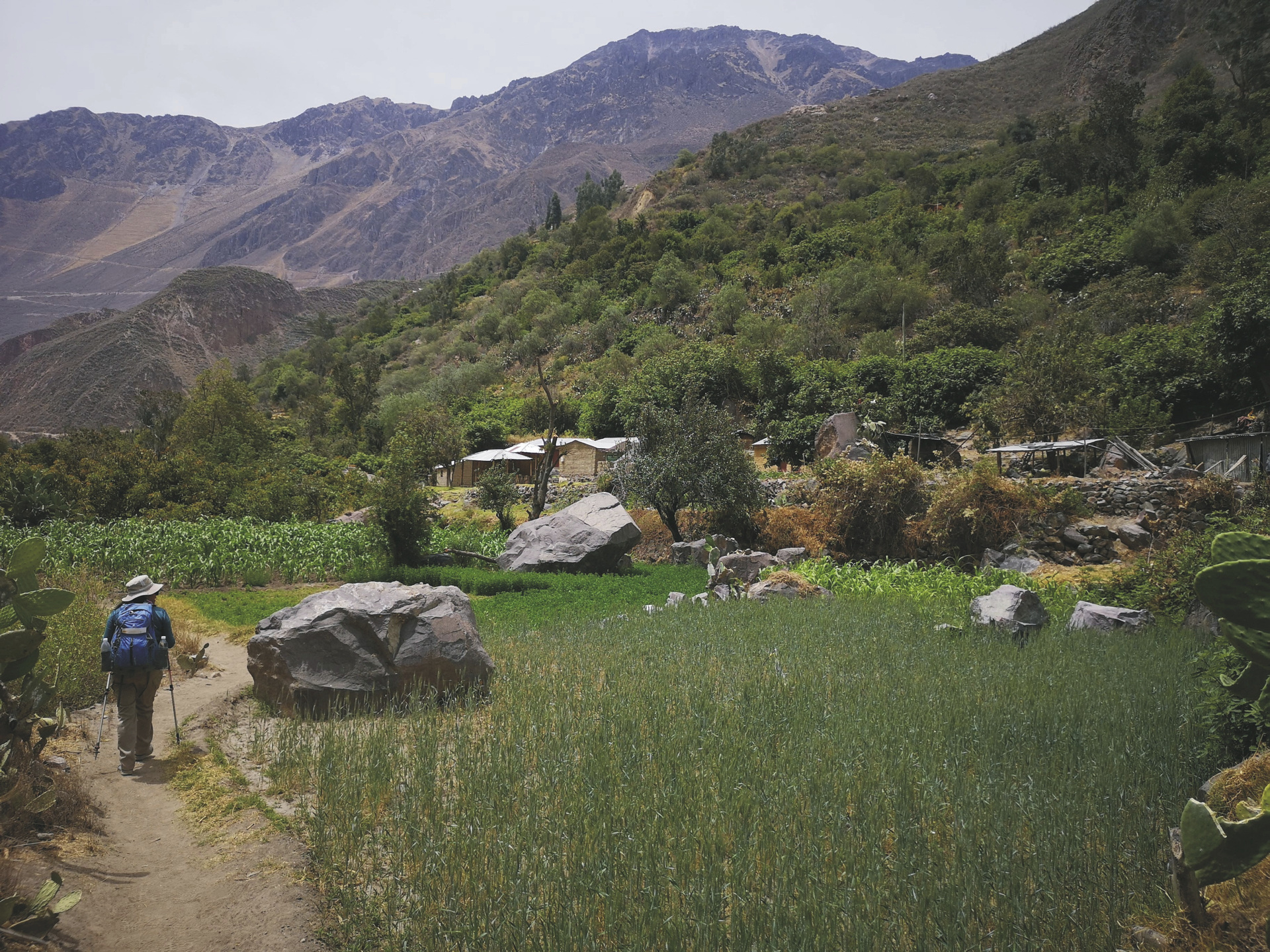 San Juan de Chuccho - Sangalle (F/M/A).Nach dem Frühstück führt Sie die heutige Tagesetappe durch Felder und kleine Dörfer bis nach Sangalle. Zuerst geht es ein Stück bergauf zu den Ortschaften Cosnirhua und Malata, die hauptsächlich von Landwirtschaft geprägt sind. Neben dem direkten Weg gibt es auch eine Variante über Tapay, den Hauptort des Bezirks (optional, ca. 3 Stunden zusätzliche Wanderzeit). Auf dem Weg durch das Tal erleben Sie immer wieder herrliche Ausblicke auf das grüne Tal und die umliegende karge, gewaltige Felslandschaft. Gegen Mittag erreichen Sie Sangalle, eine kleine Oase am Ufer des Colca. Entspannen Sie nachmittags am Pool Ihrer Lodge (8 km, Gehzeit 3,5-4 Std., 200 Hm auf, 400 Hm ab).