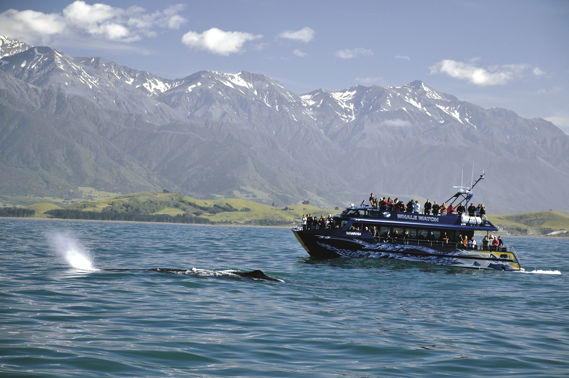 Das kleine Fischerdorf an der Ostküste der Südinsel ist aufgrund des reichen Nahrungsangebots seiner Küstengewässer ein Paradies für Wale. In der Sprache der Maori bedeutet Kaikoura „Ort, an dem man Langusten essen kann“.