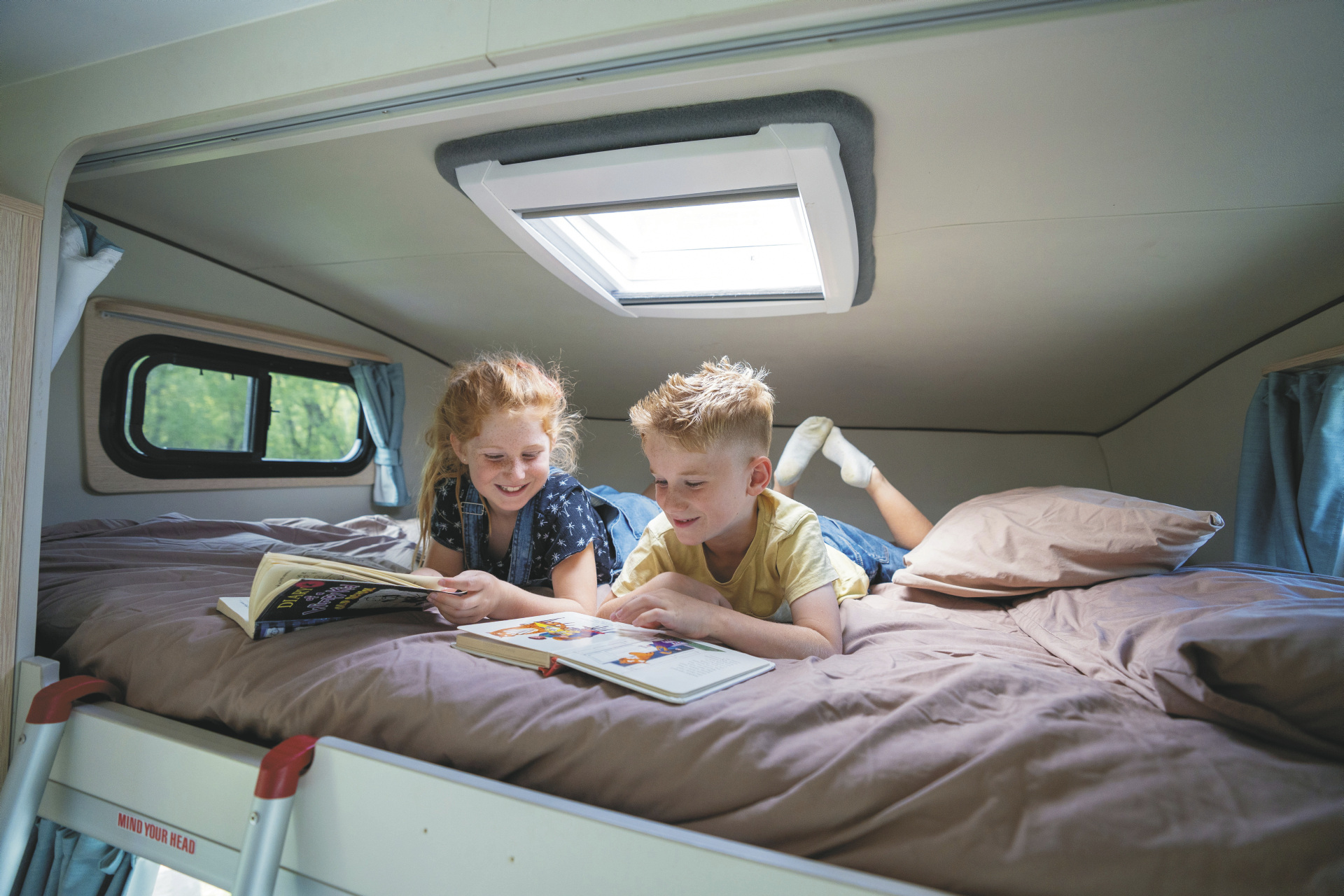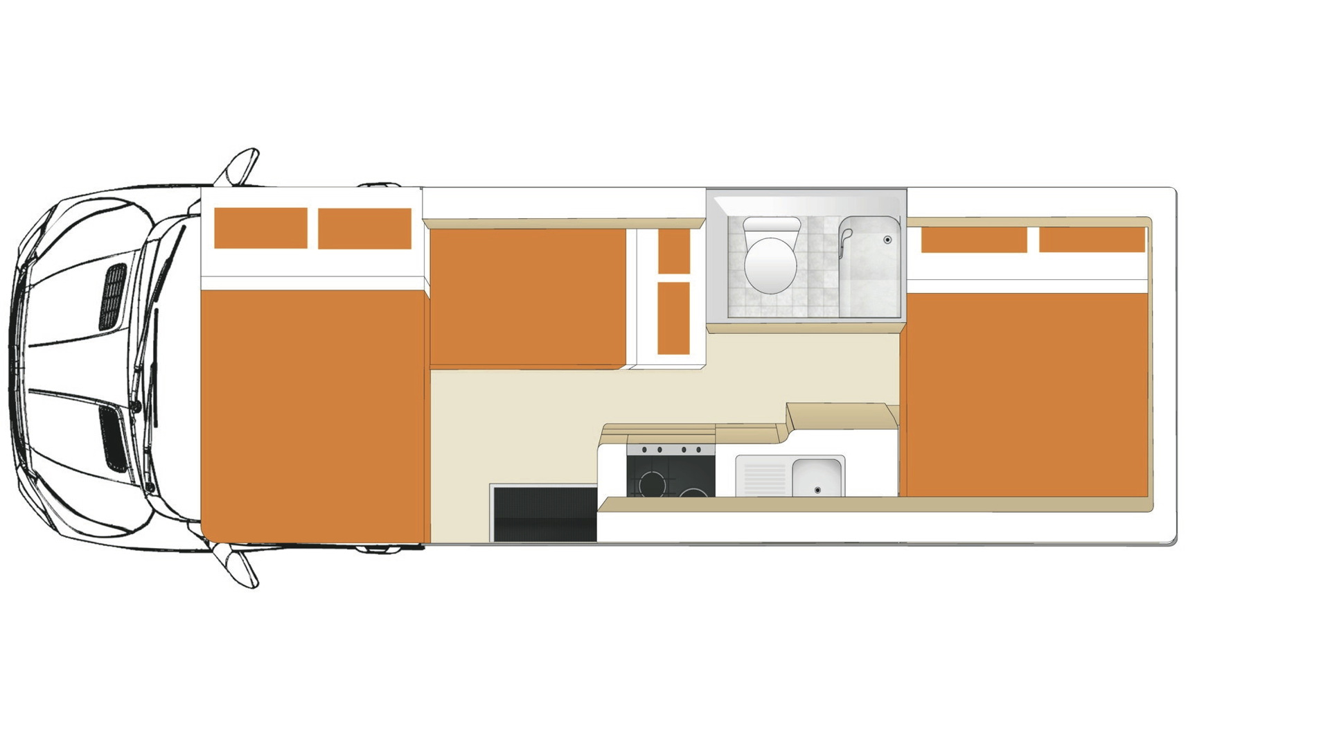 • Doppelbett über der Fahrerkabine 2,10 x 1,45 m (mit Sicherheitsnetz)• Mittelsitzgruppe, umbaubar zum schmalen Doppelbett 1,84 x 1,15 m