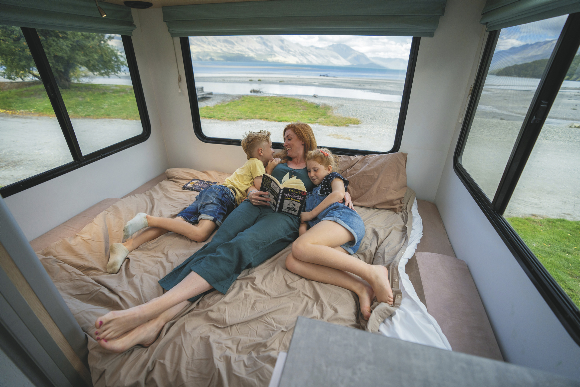 Mit großem Komfort und drei Betten ausgestattetes Wohnmobil. Ideal für 4, maximal für 5-6 Personen.