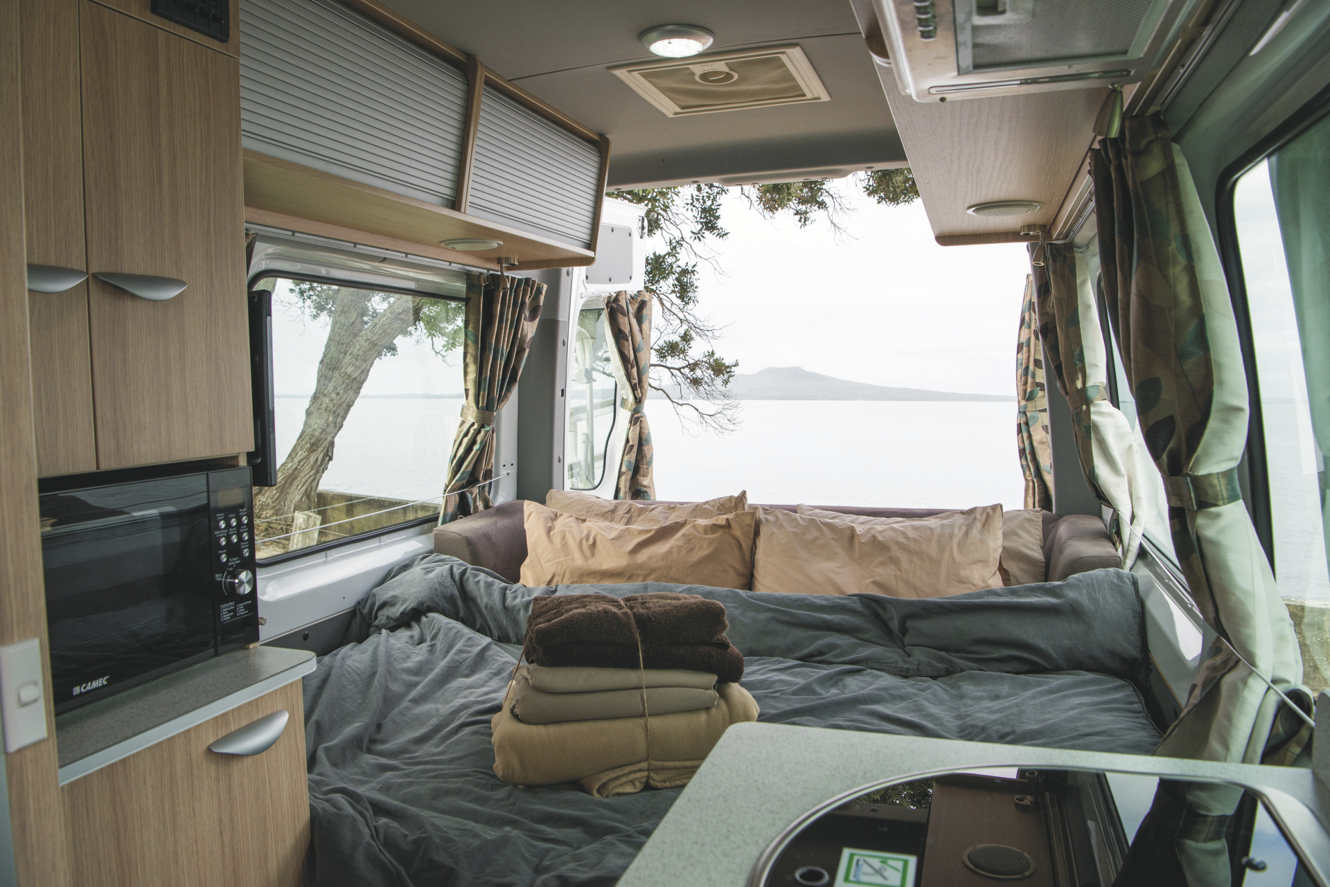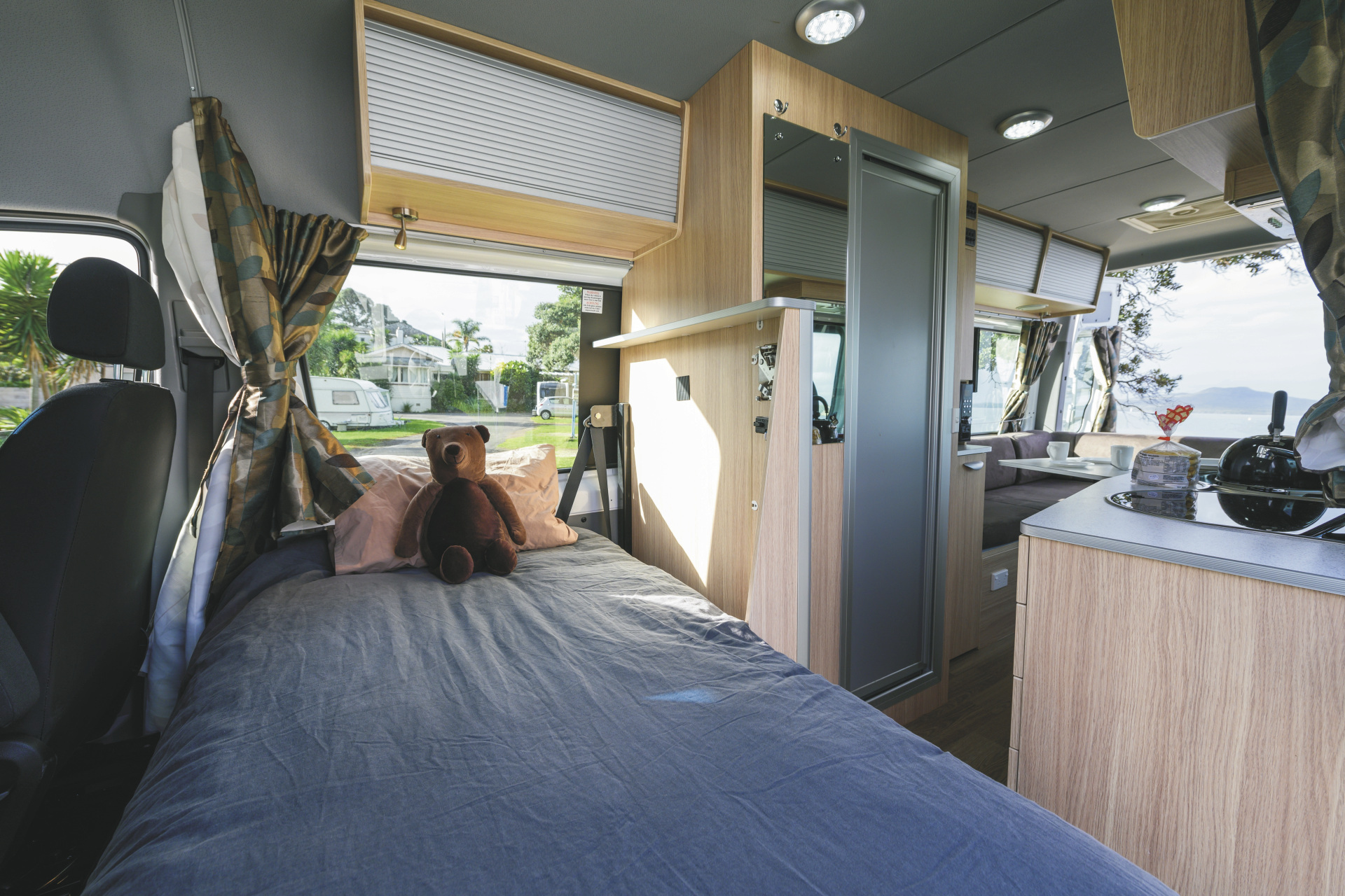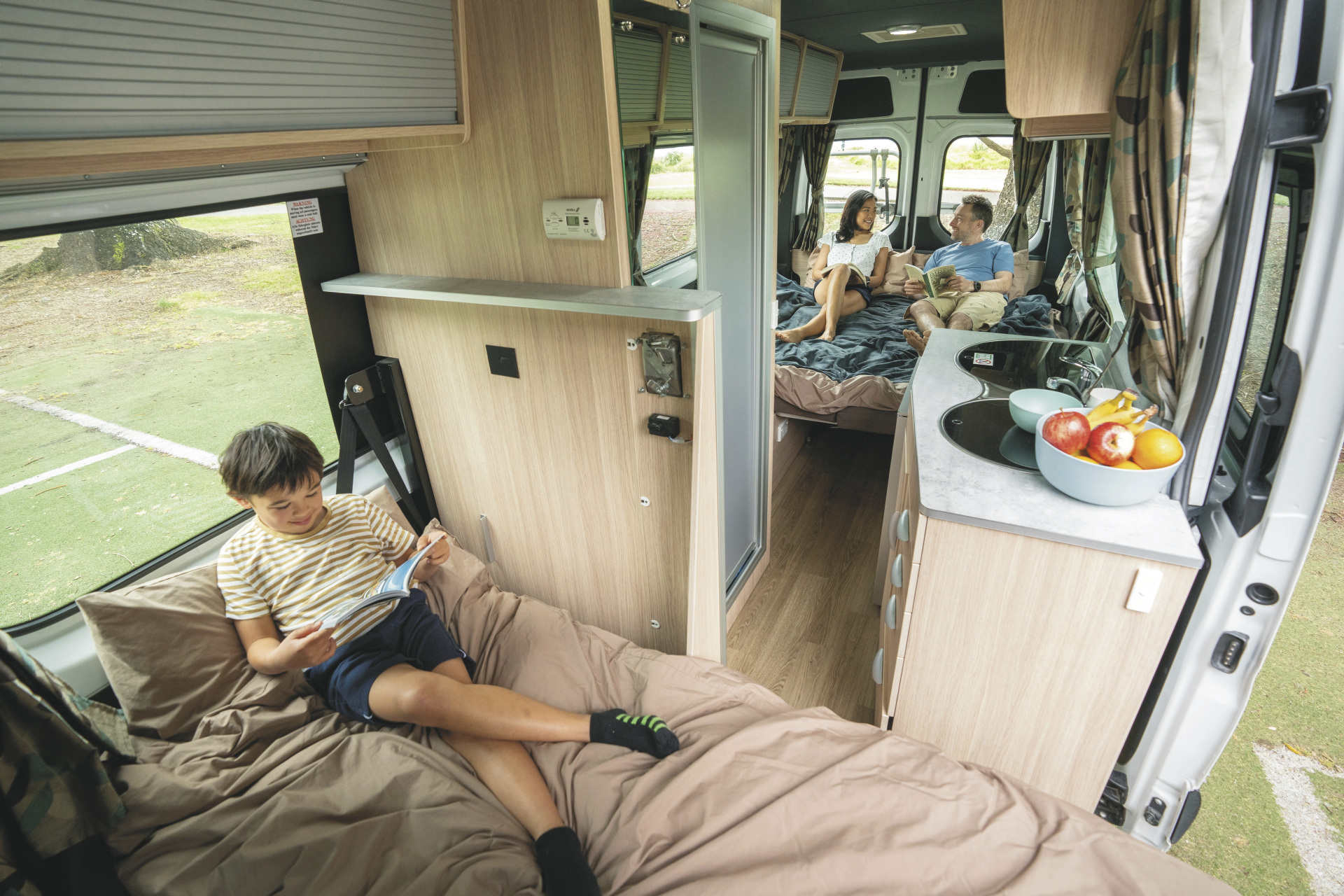 Geräumiger Camper mit großem Doppelbett und zusätzlichem Einzelbett. Ideal für 2 Erwachsene mit 1 Kind.