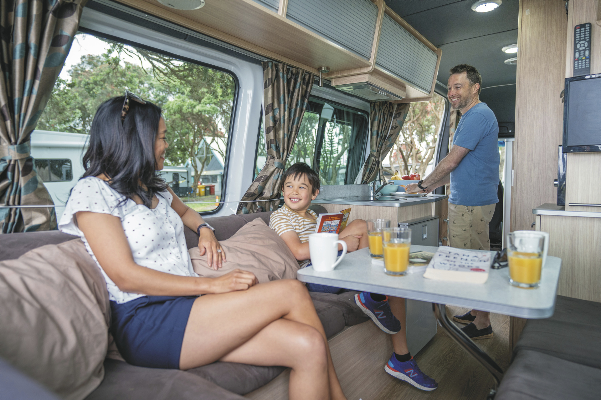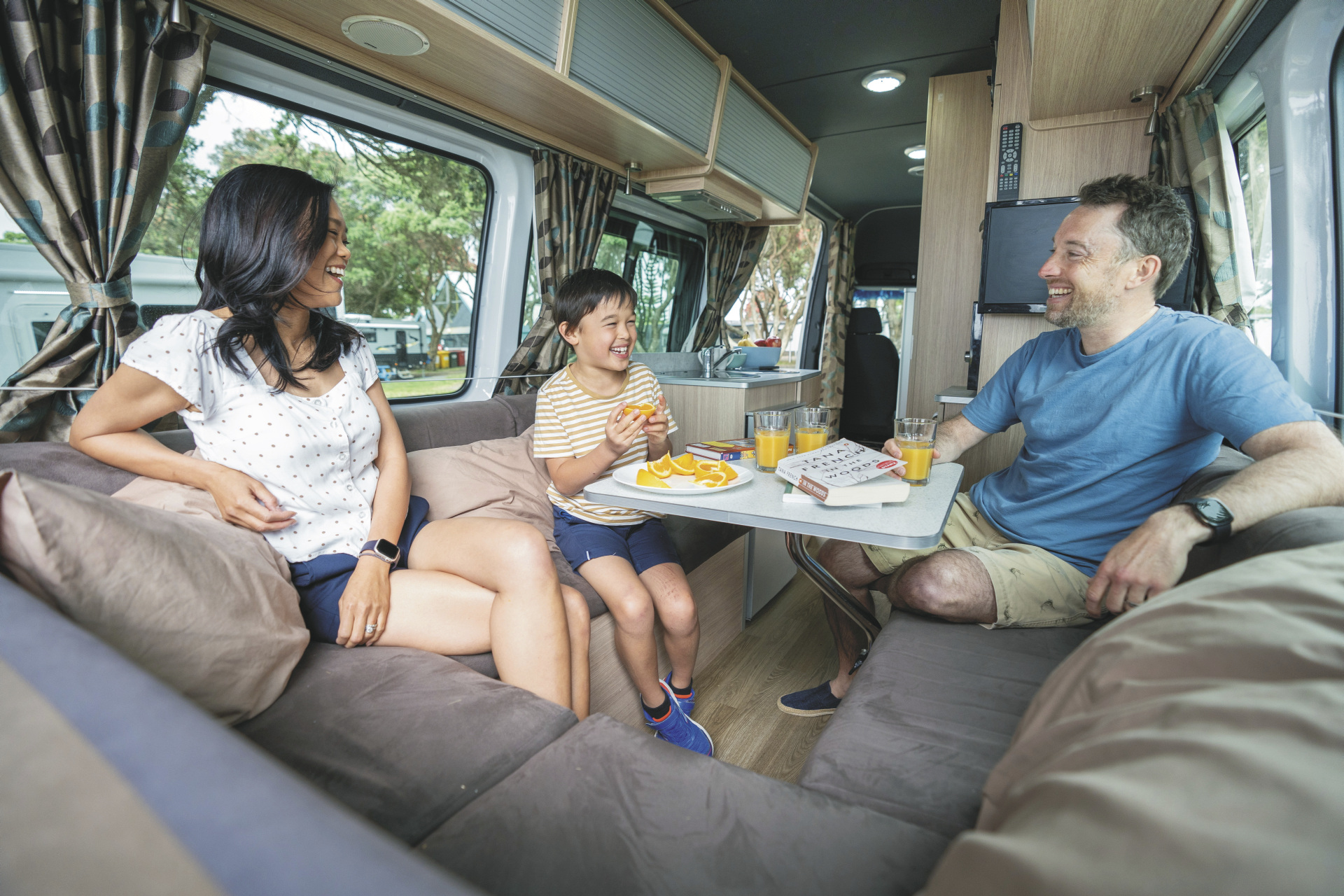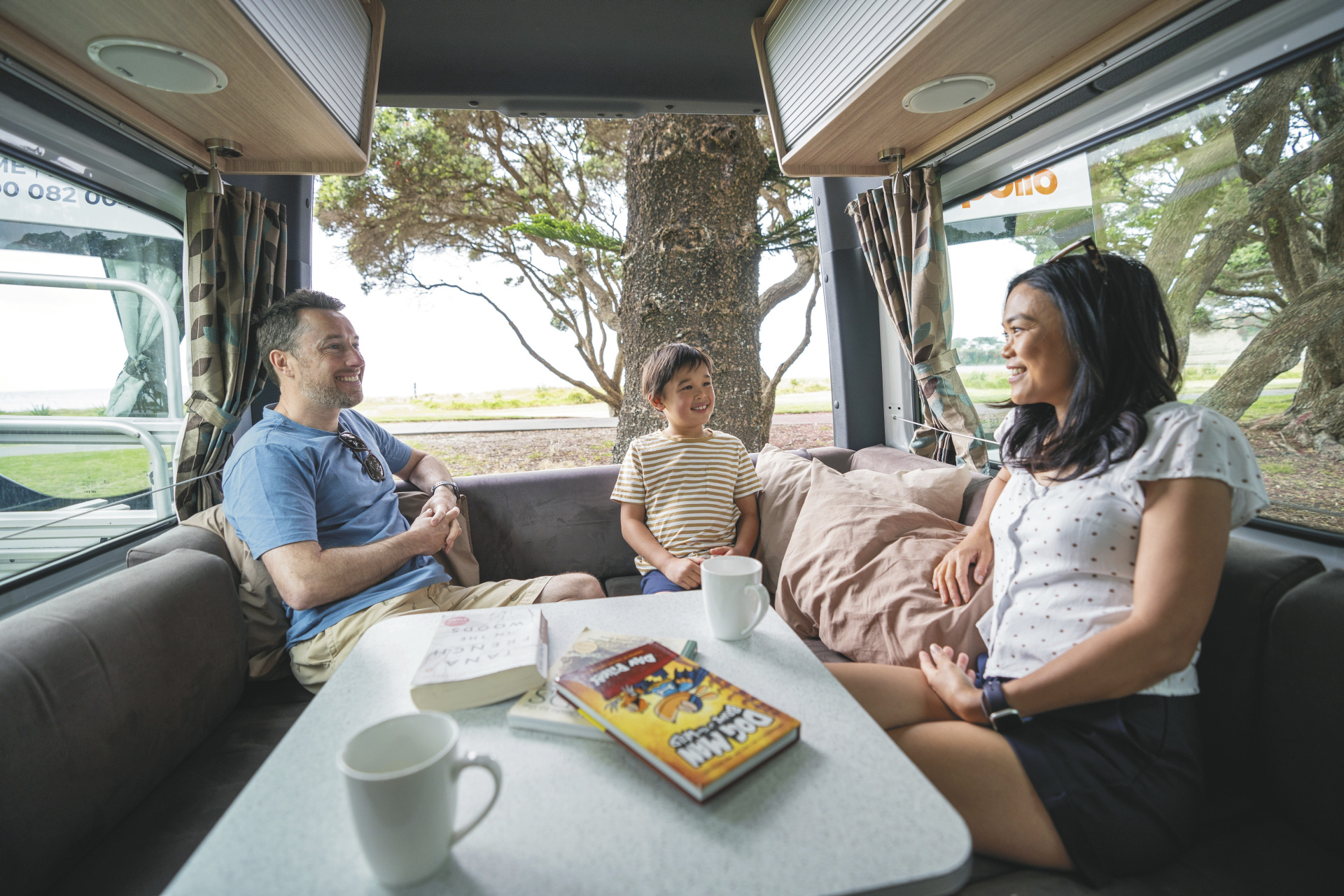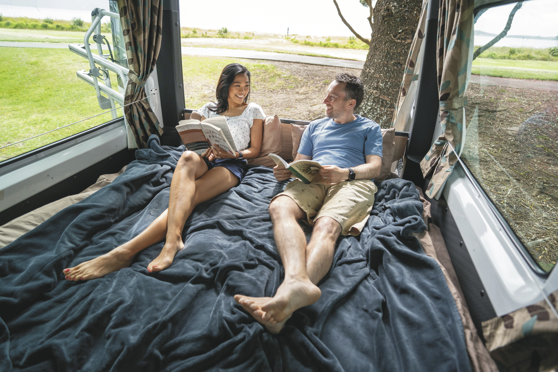 Geräumiger Camper mit großem Doppelbett und zusätzlichem Einzelbett. Ideal für 2 Erwachsene mit 1 Kind.