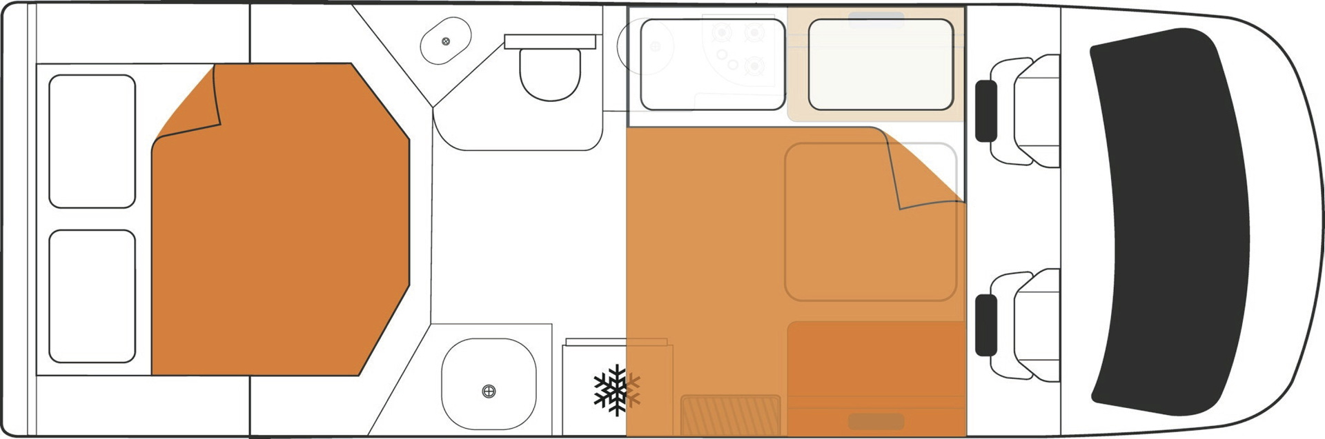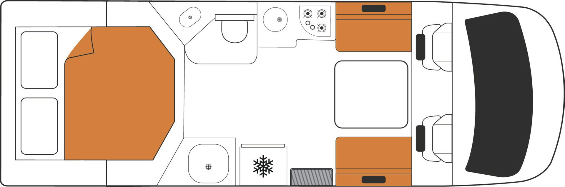• von der Decke absenkbares Doppelbett hinter der Fahrerkabine 1,90 x 1,16-1,39 m• festes Doppelbett im Heck (ca. 1,90 x 1,33 m; entweder im Inselstil oder quer zur Fahrtrichtung)