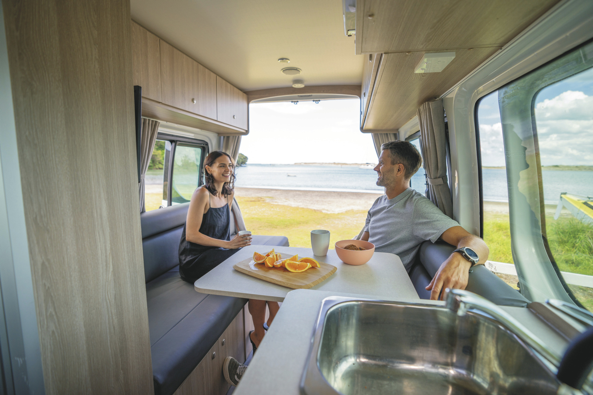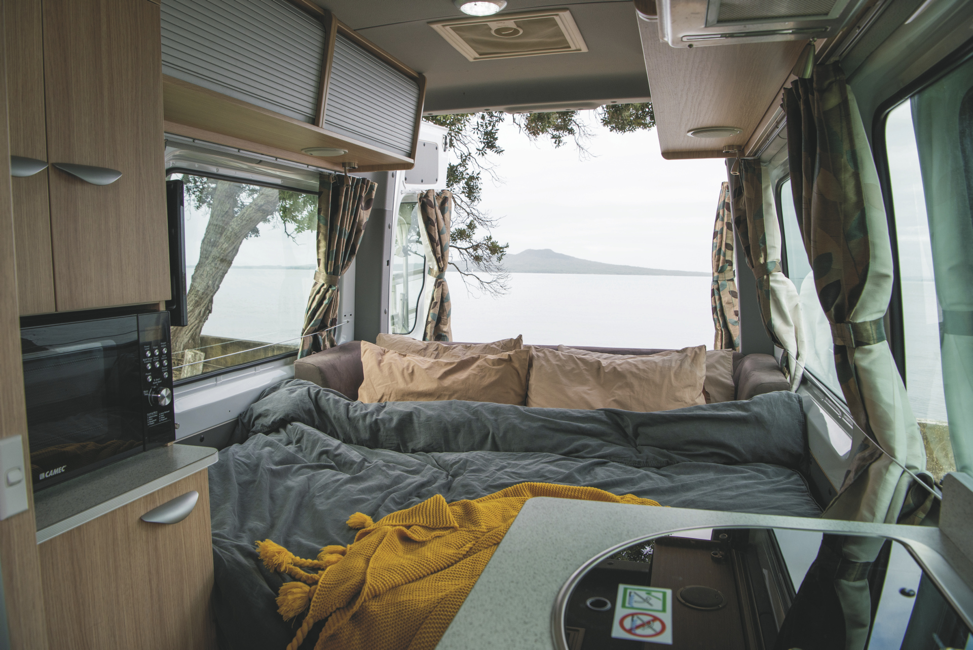 Ein geräumiger Camper mit großem Bett und Dusche/WC für komfortables Reisen zu Zweit.