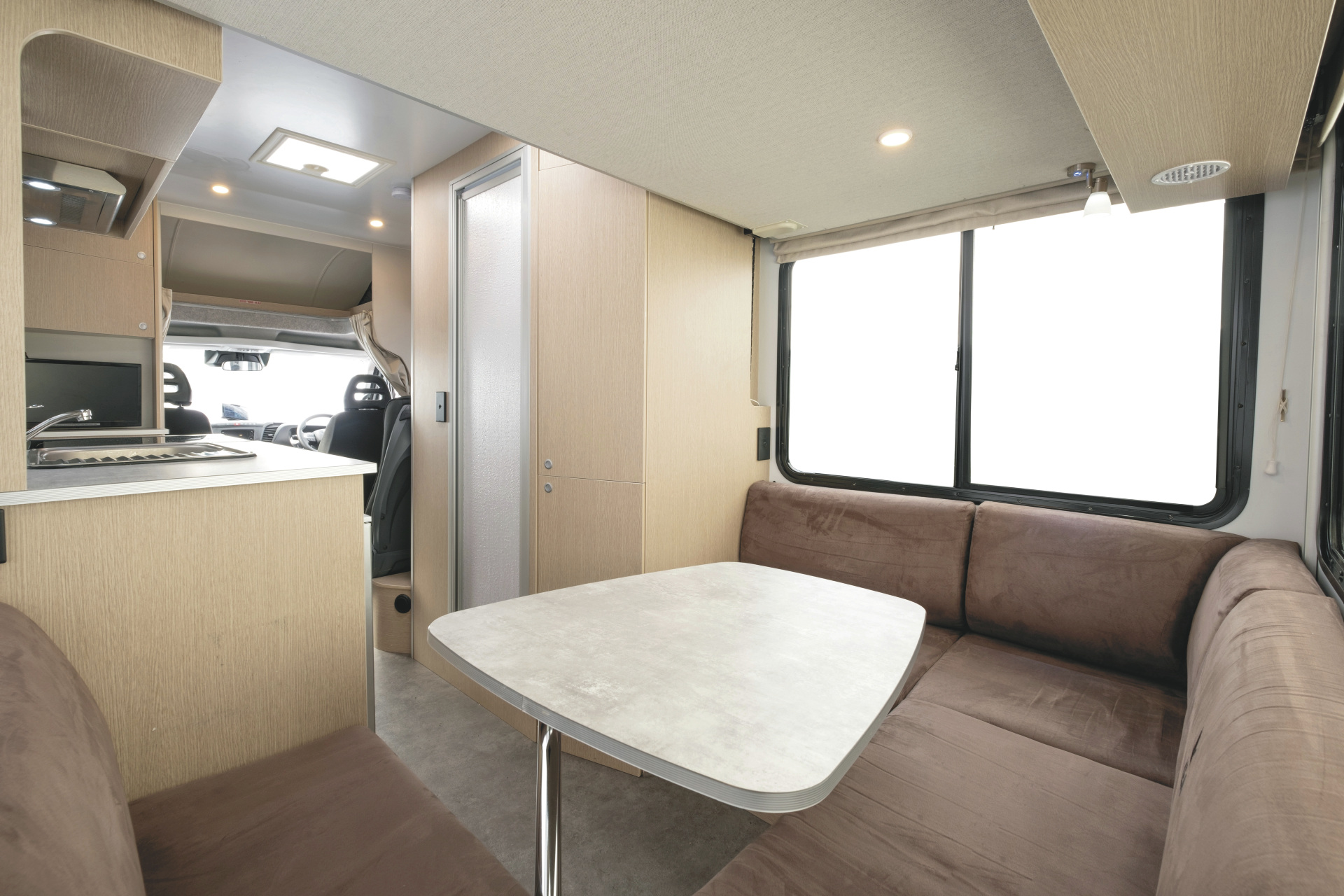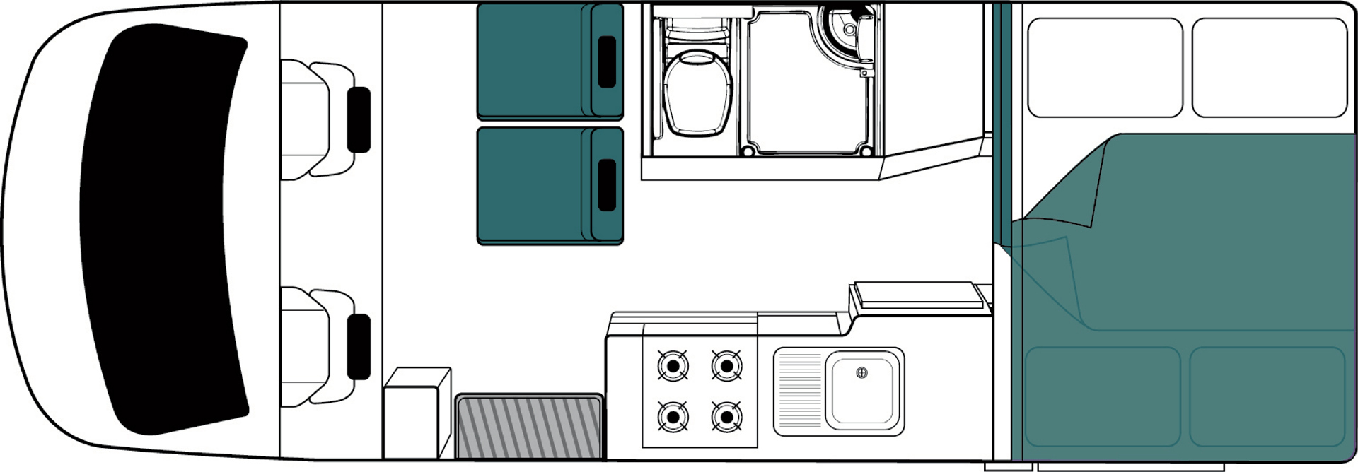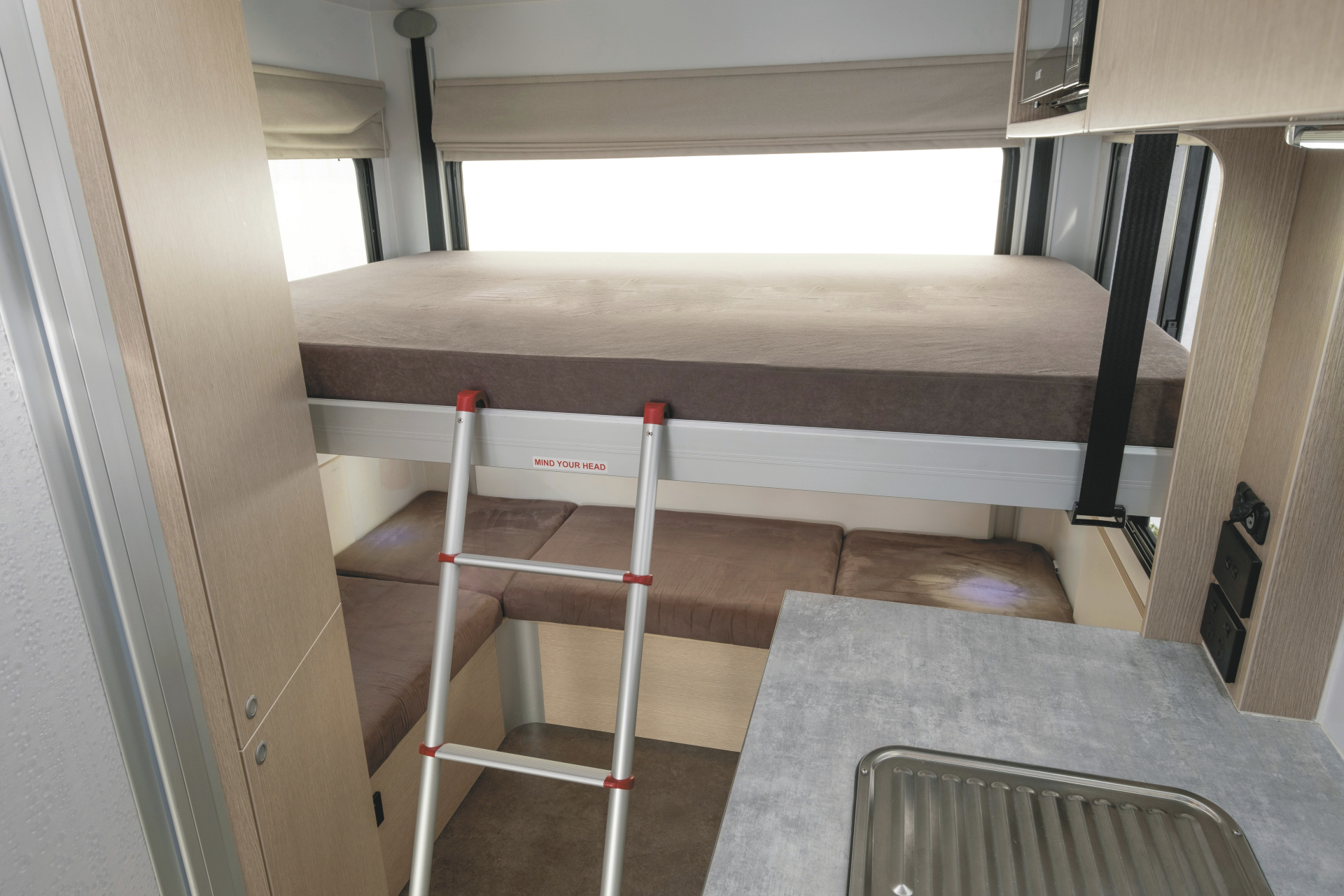 • Hecksitzgruppe, zum Doppelbett umbaubar 2,00 x 1,45 m• darüber, von der Fahrzeugdecke absenkbar, zweites Doppelbett 2,00 x 1,40 m
