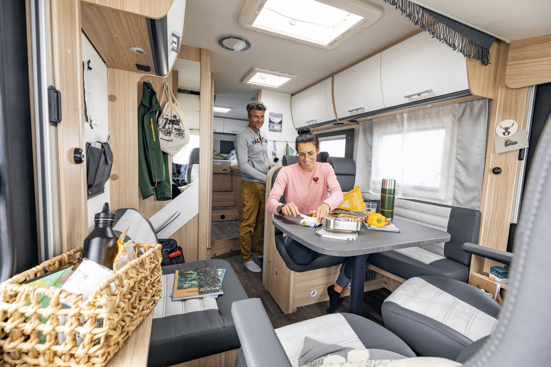 • 2 Sitzplätze in der Fahrerkabine (zum Wohnbereich drehbar) und zwei Sitzplätze im Wohnbereich