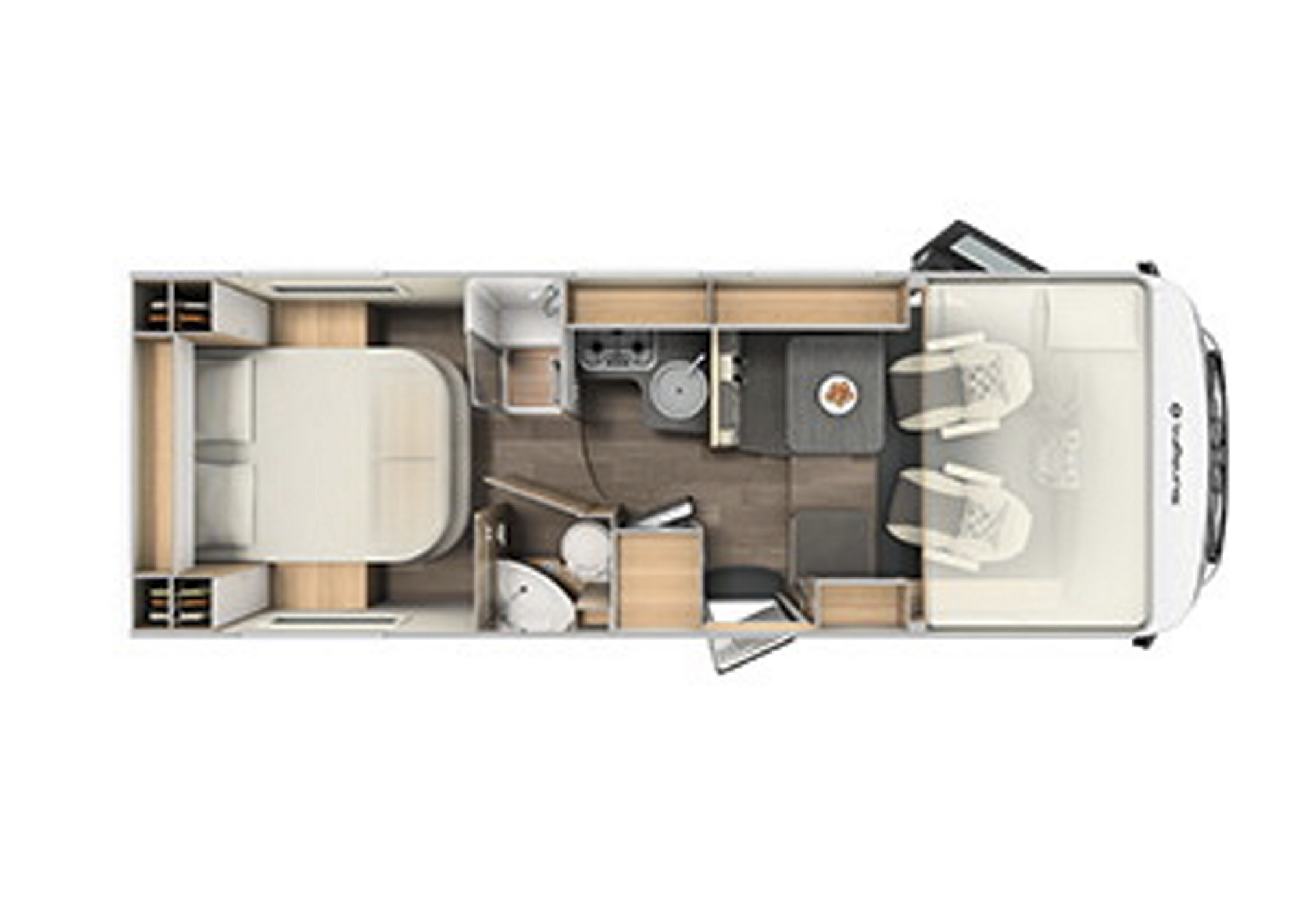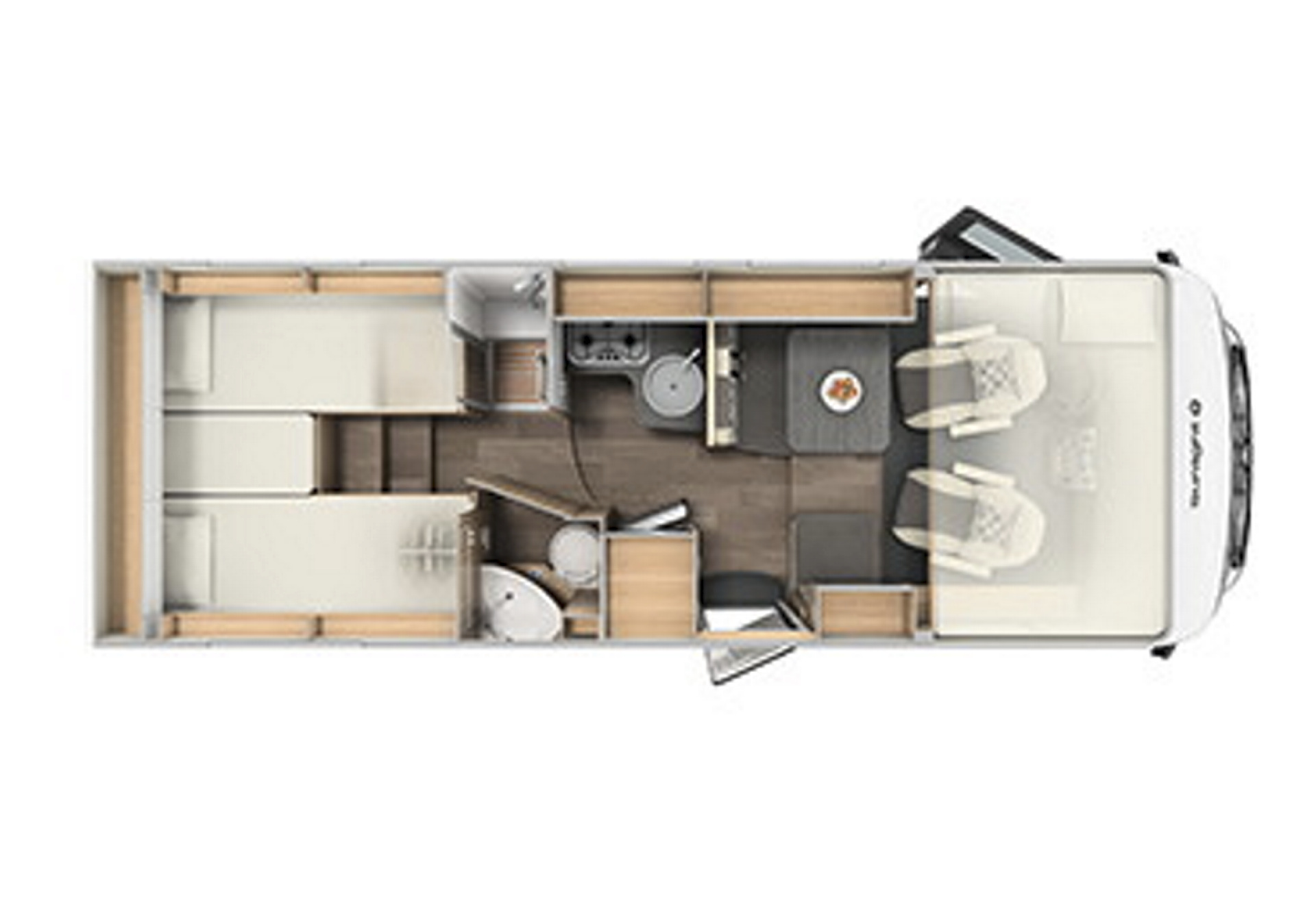 Ein luxuriös ausgestattetes, aufgrund der integrierten Bauweise besonders viel Platz bietendes Wohnmobil für anspruchsvolle Reisende. Die Panorama-Windschutzscheibe sorgt für ein außergewöhnliches Fahrerlebnis. Wahlweise auch mit Einzelbetten buchbar. Ideal für 2-3, max. für 4 Erwachsene.