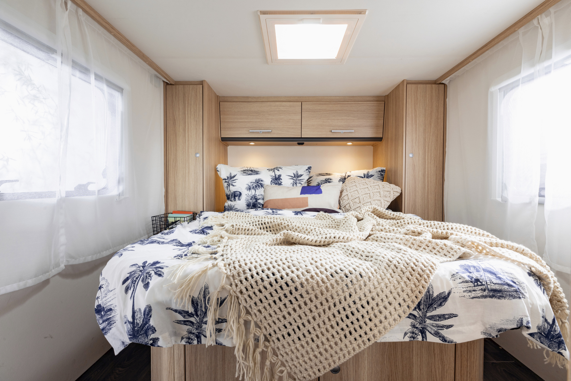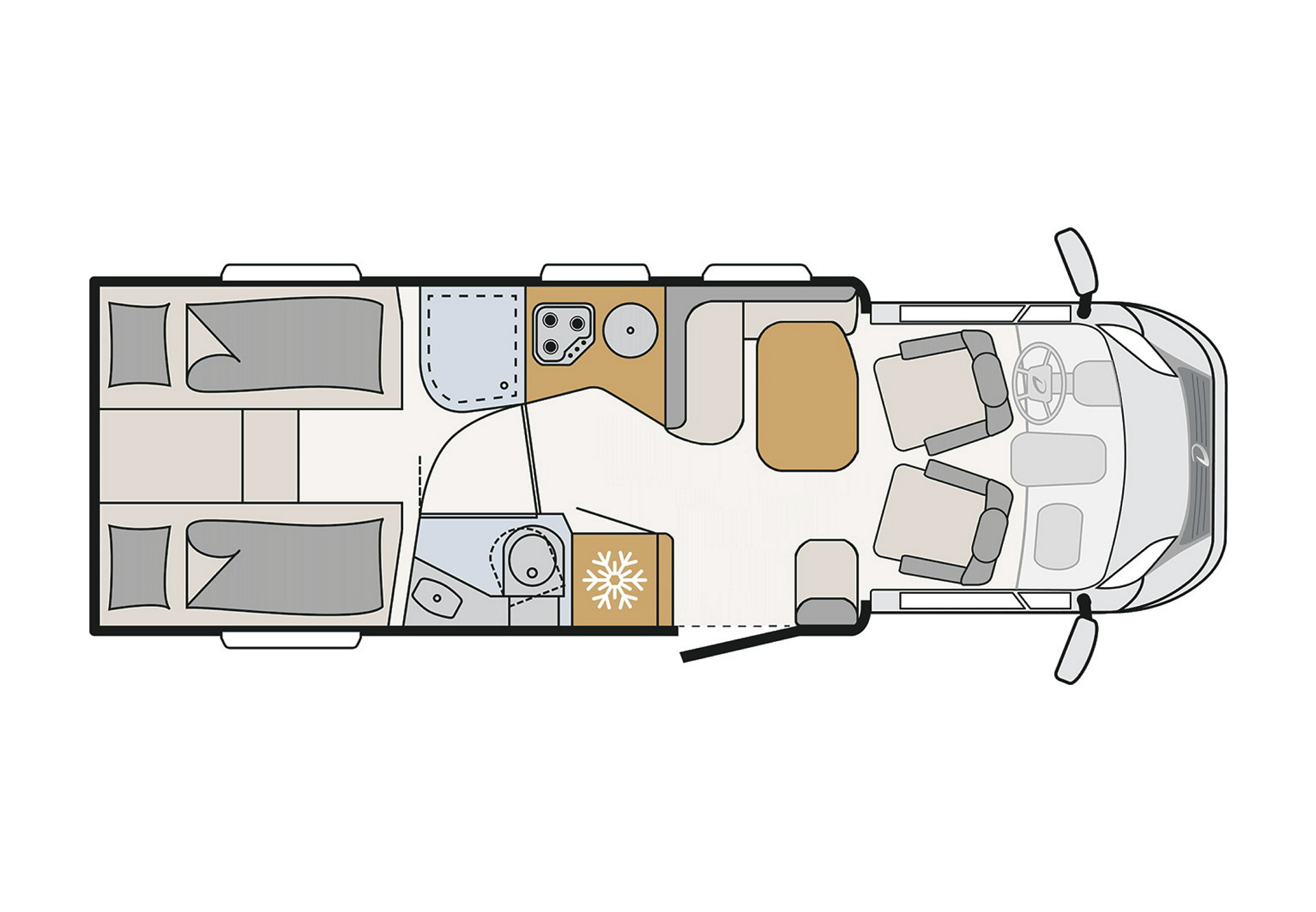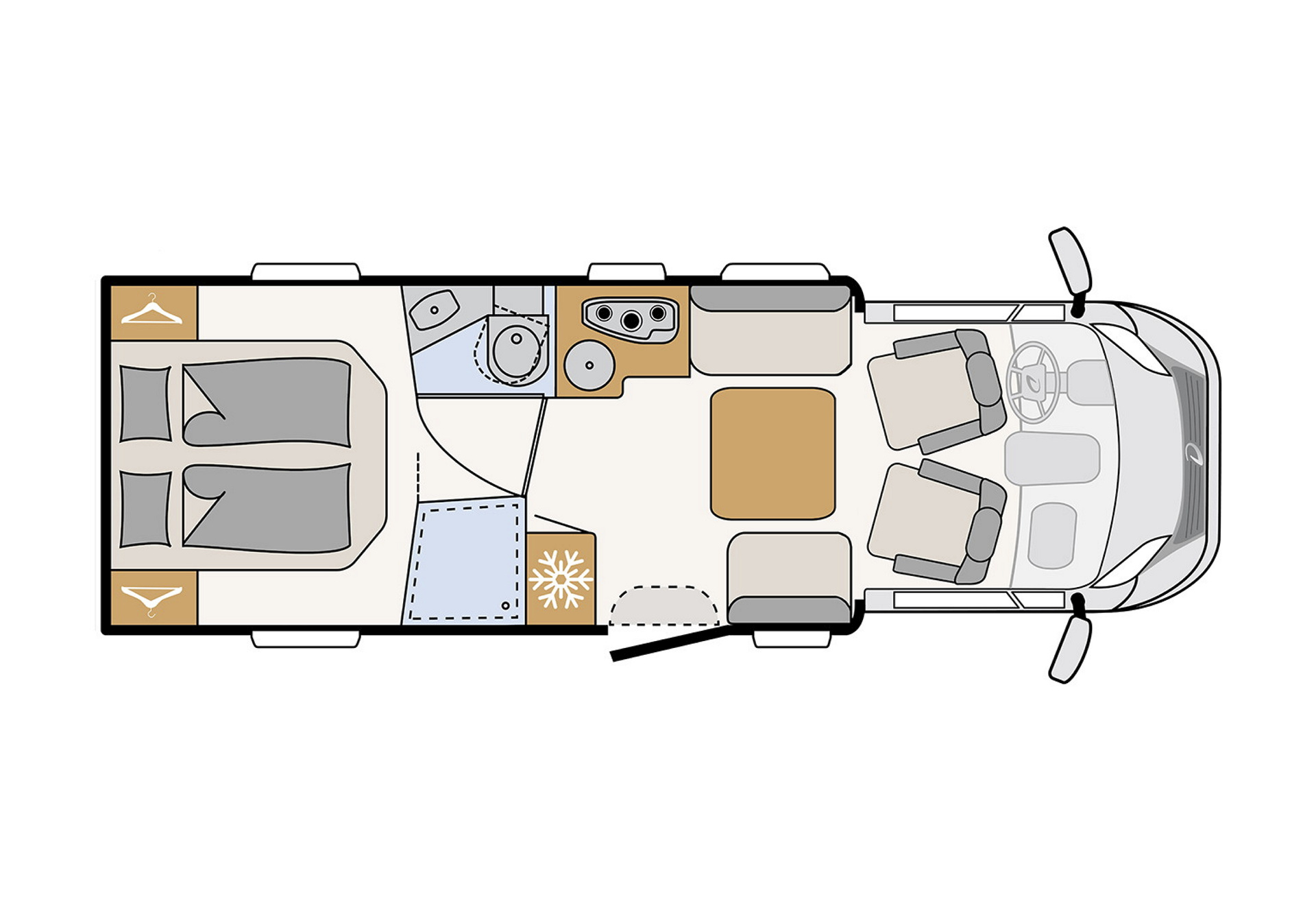 Ein geräumiges Wohnmobil für komfortables Reisen zu Zweit. Komplett und mit einem bequemen Doppelbett ausgestattet. Der ideale Reisebegleiter für max. 2 Erwachsene.