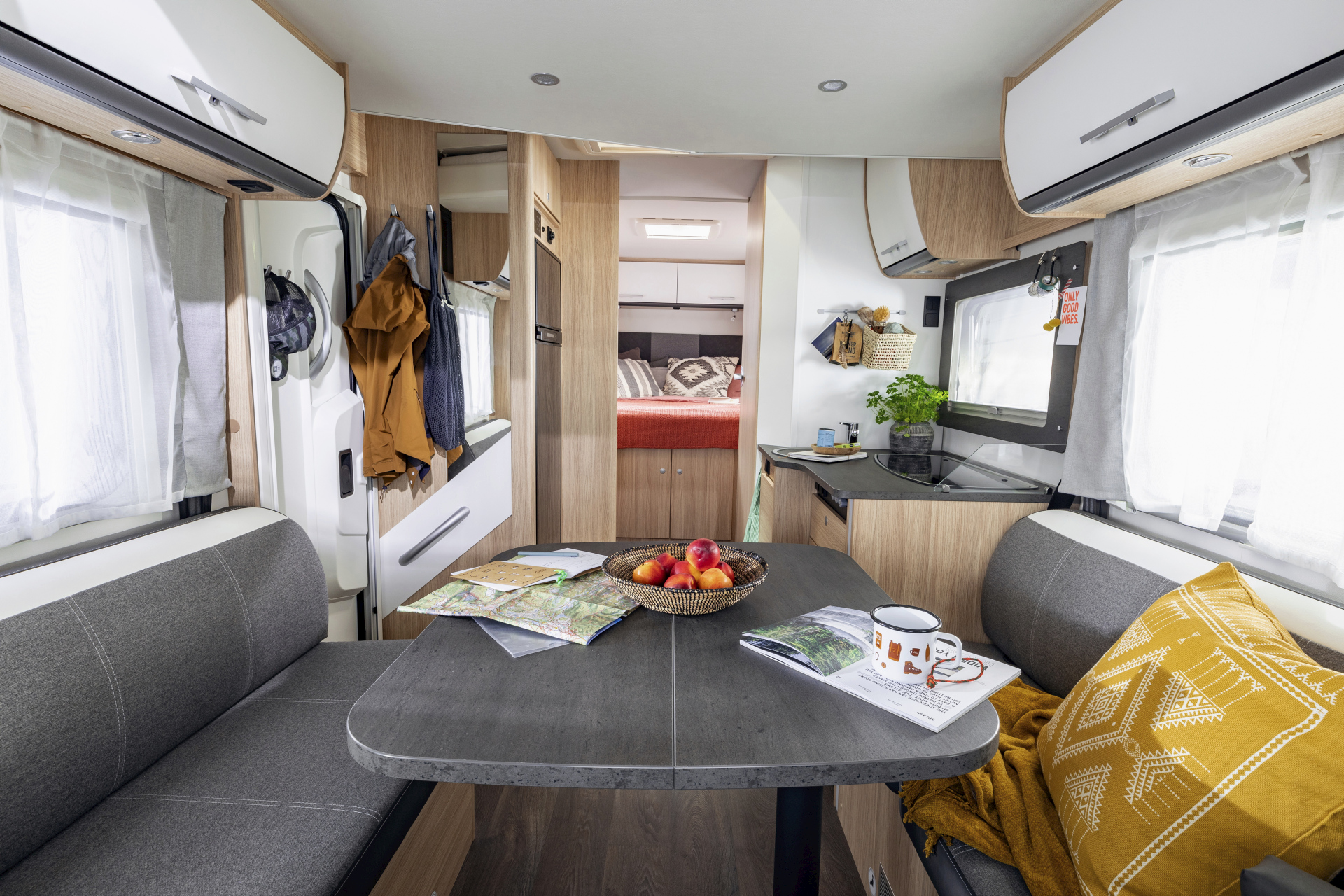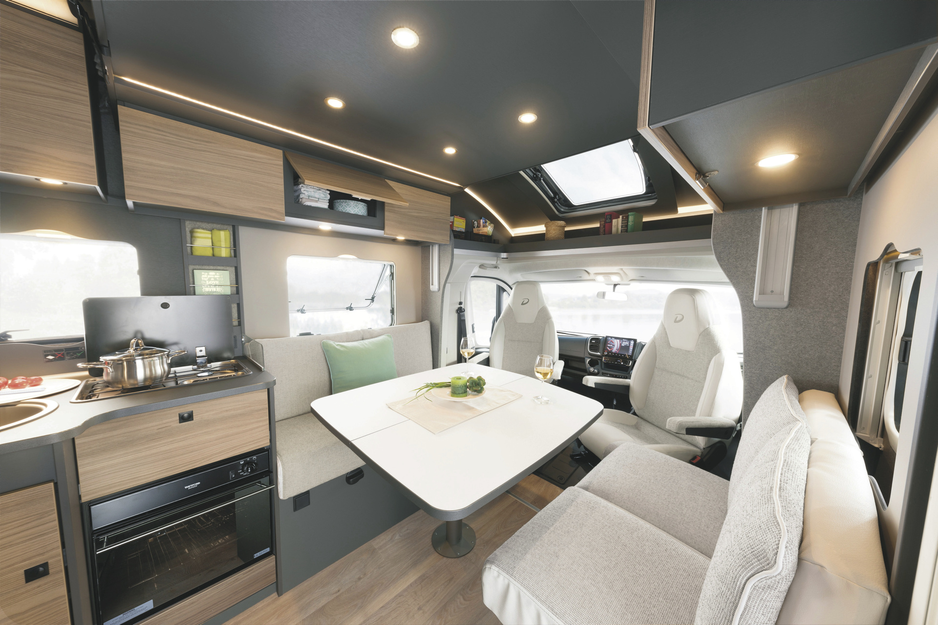• 2 Sitzplätze in der Fahrerkabine (zum Wohnbereich drehbar)