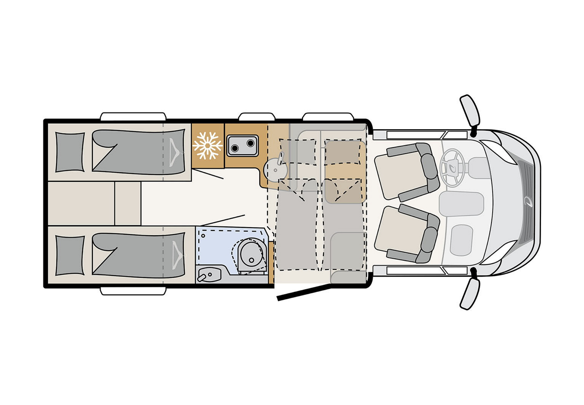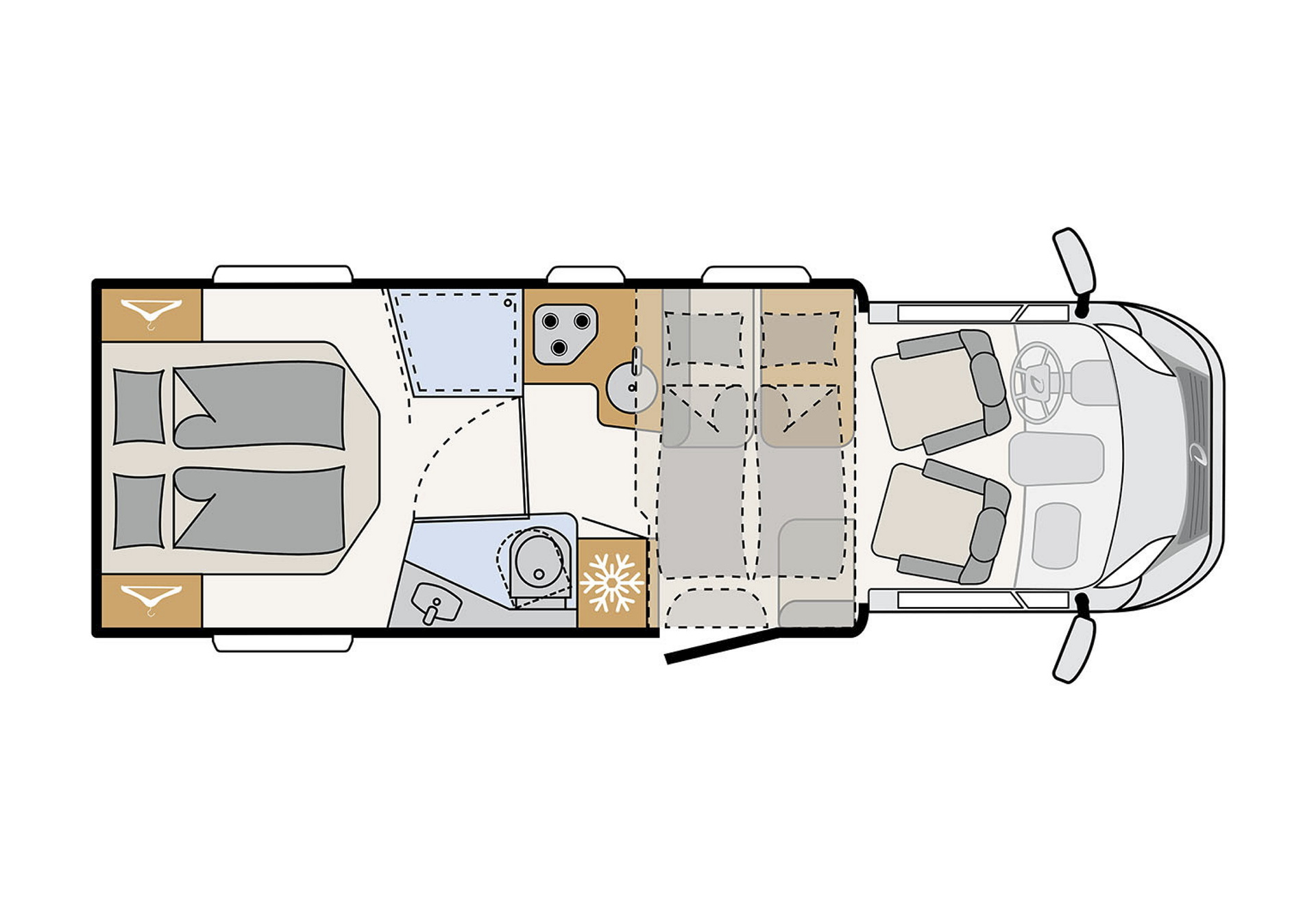 • 2 Sitzplätze in der Fahrerkabine (zum Wohnbereich drehbar) und zwei Sitzplätze im Wohnbereich