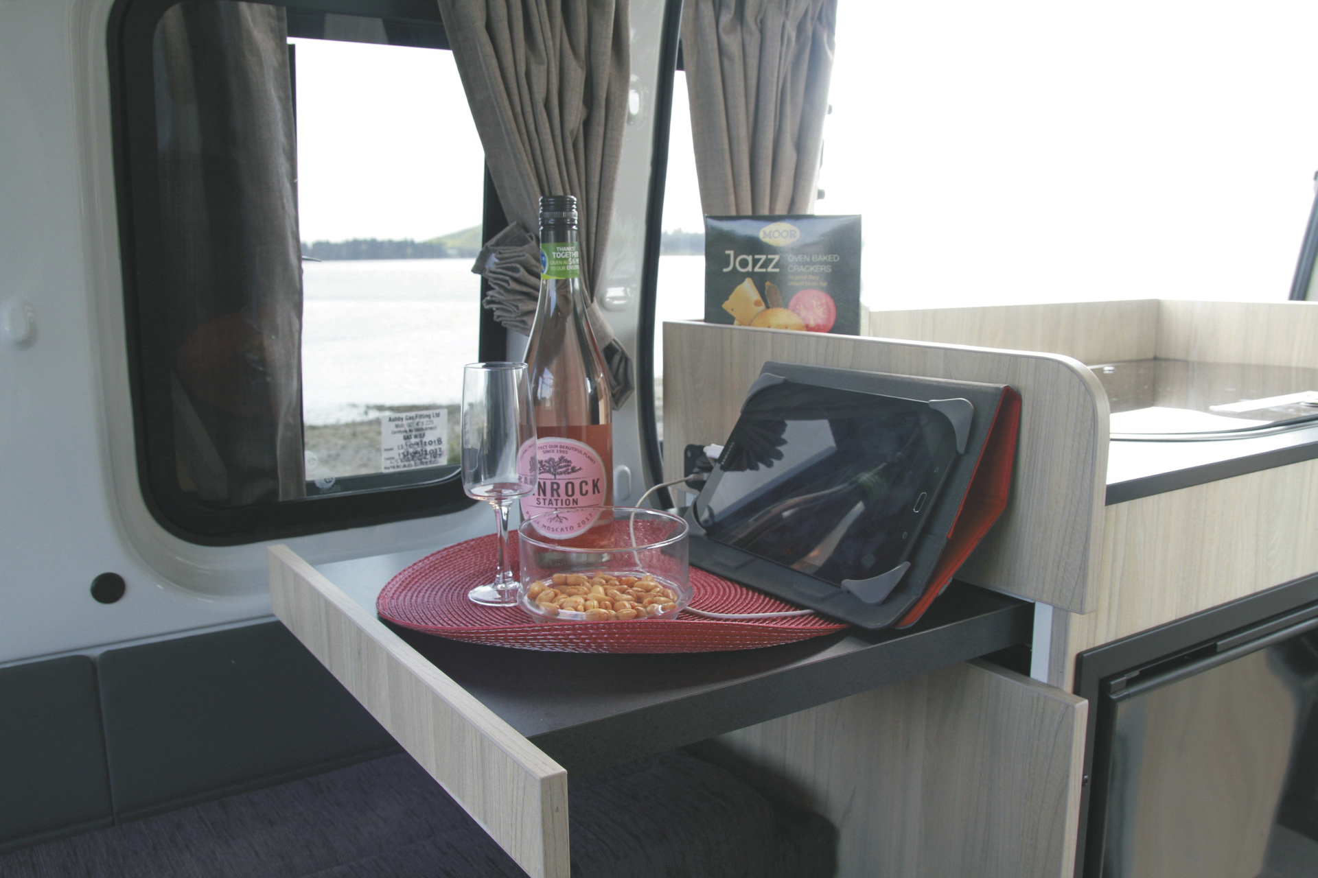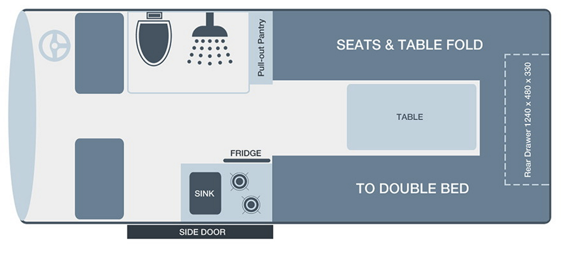 • Große Schublade im Heck (1,24 x 0,48 x 0,33 m)