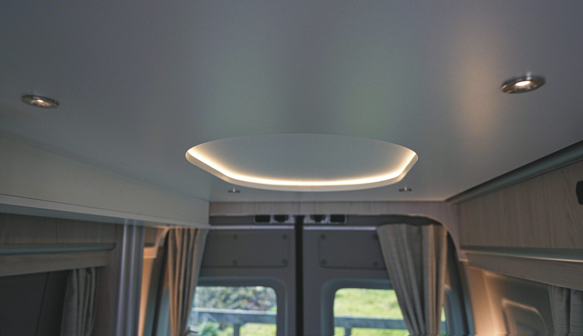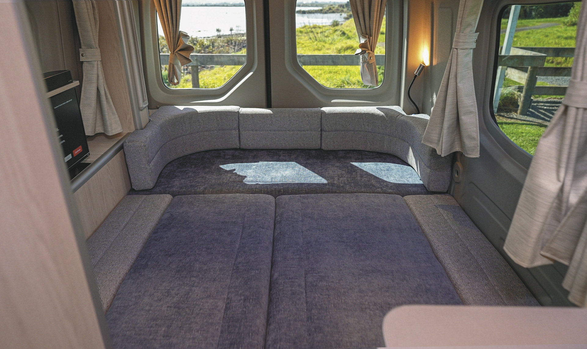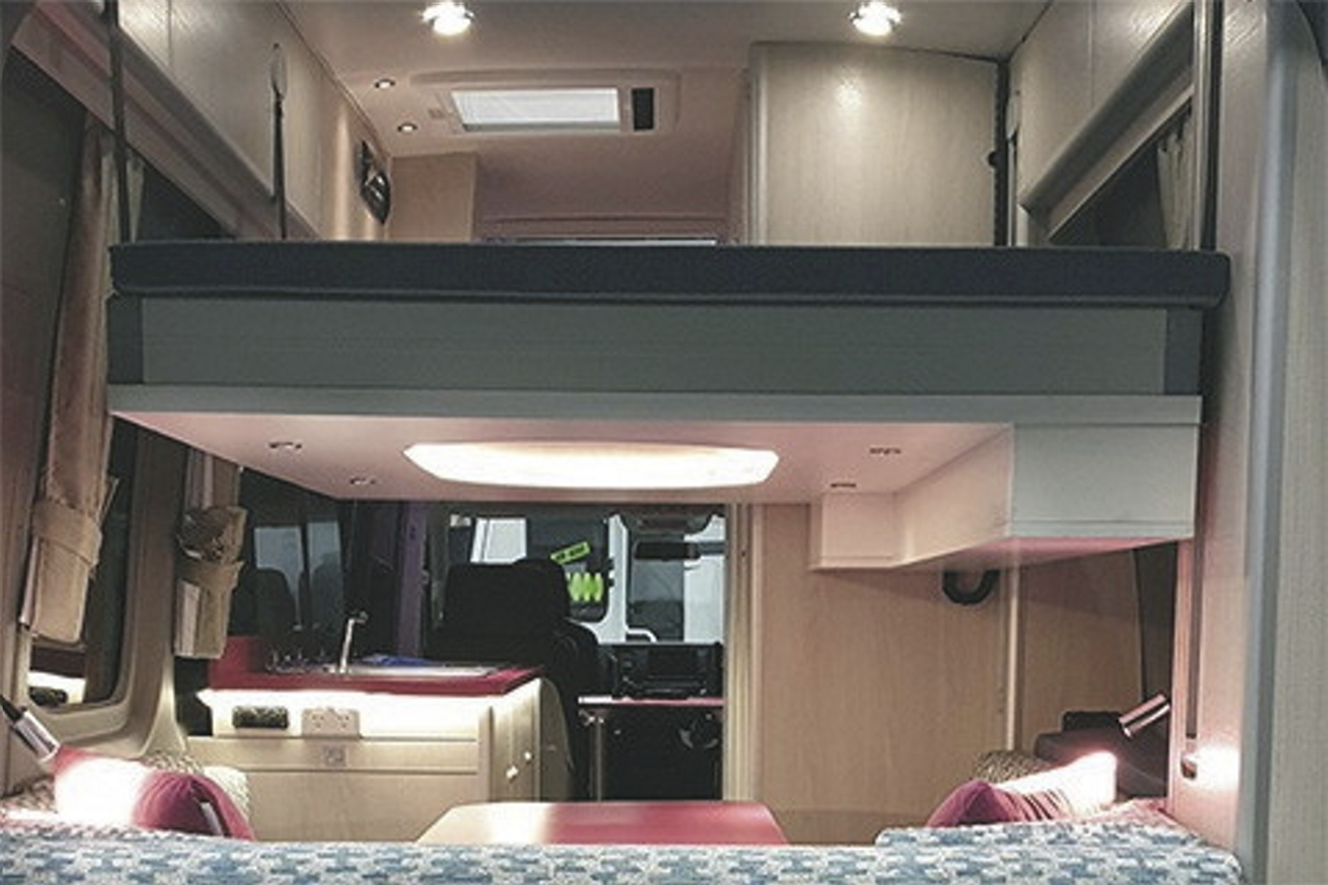 • Sitzgruppe im Heck, zum Doppelbett umbaubar (1,85 x 1,53 m)• darüber, von der Decke elektrisch absenkbares Doppelbett (1,83 x 1,20 m)