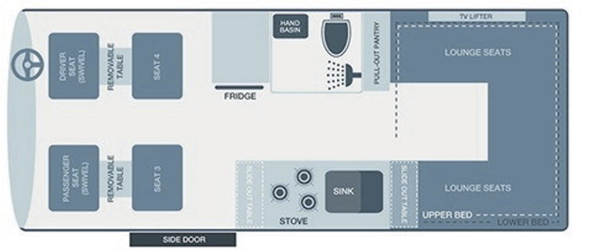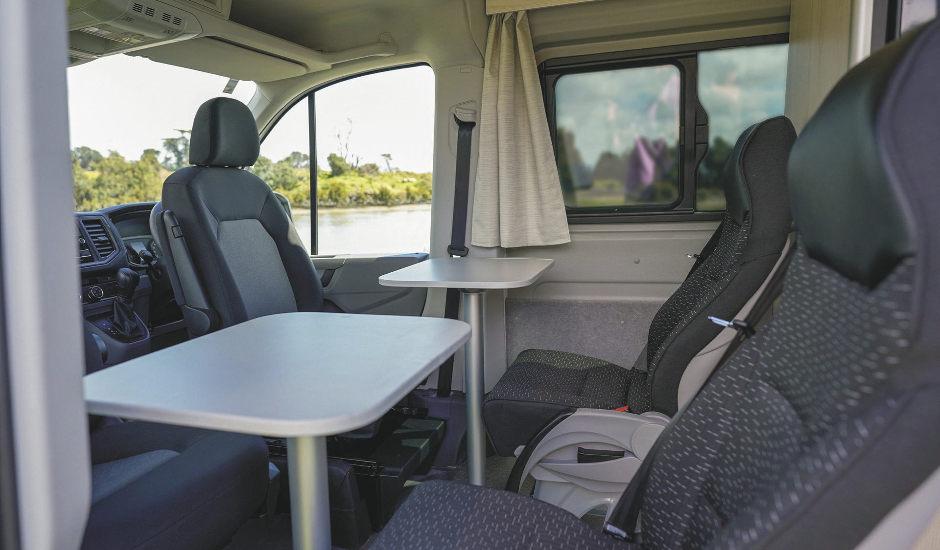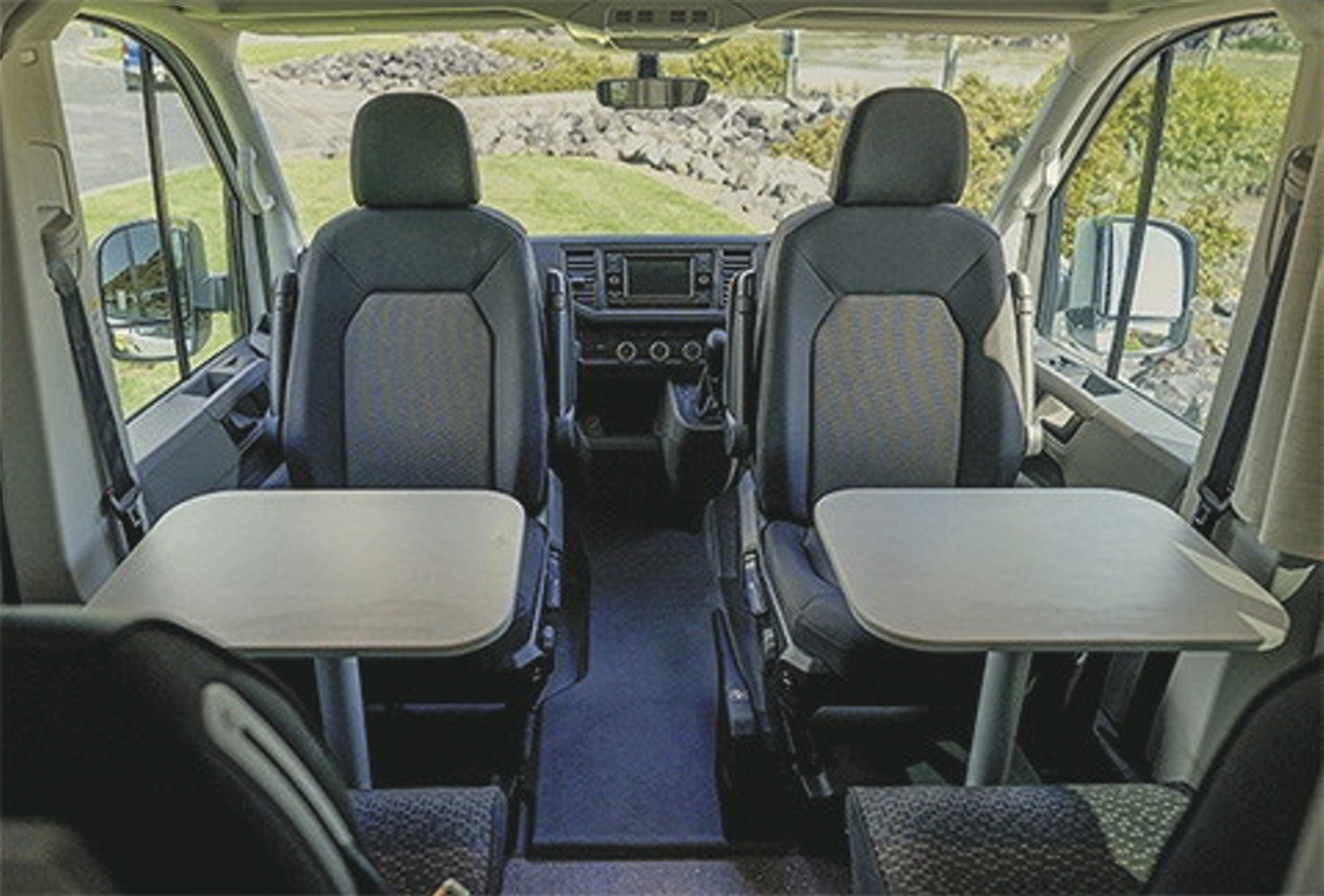 • 2 Sitzplätze in der Fahrerkabine (drehbar), zwei weitere Sitzplätze dahinter