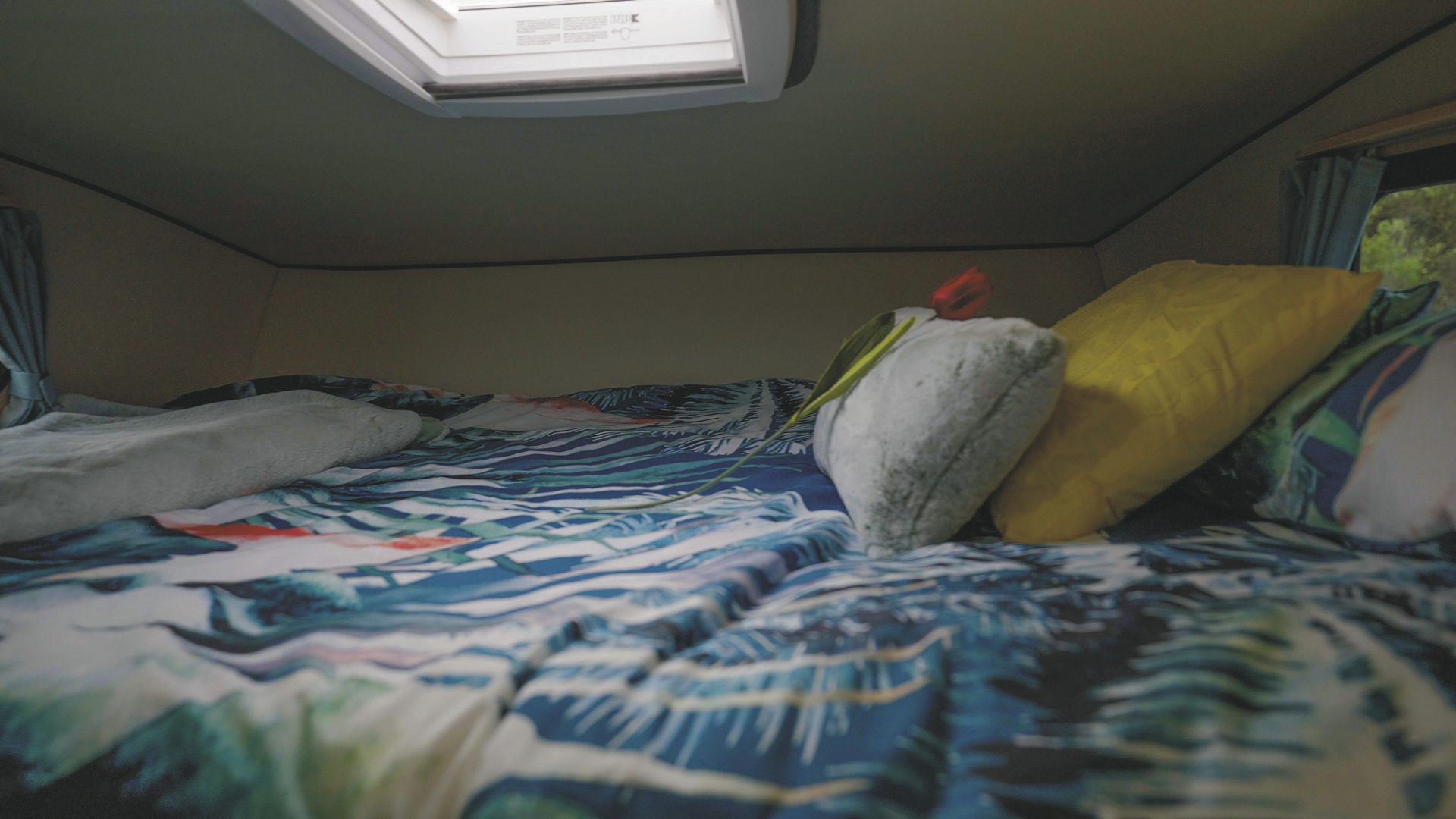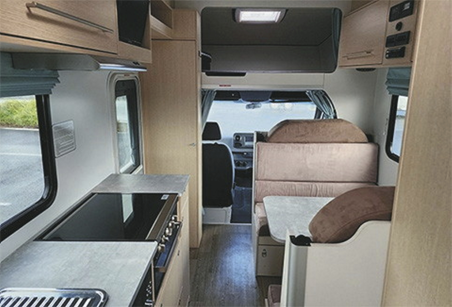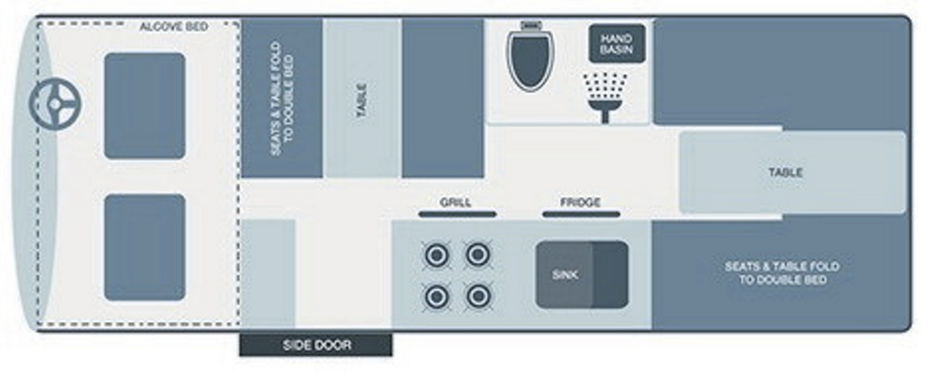 • Doppelbett über der Fahrerkabine (1,97 x 1,49 m)• seitliche Sitzgruppe, zum kleinerem Doppelbett umbau (1,84 x 1,15 m)