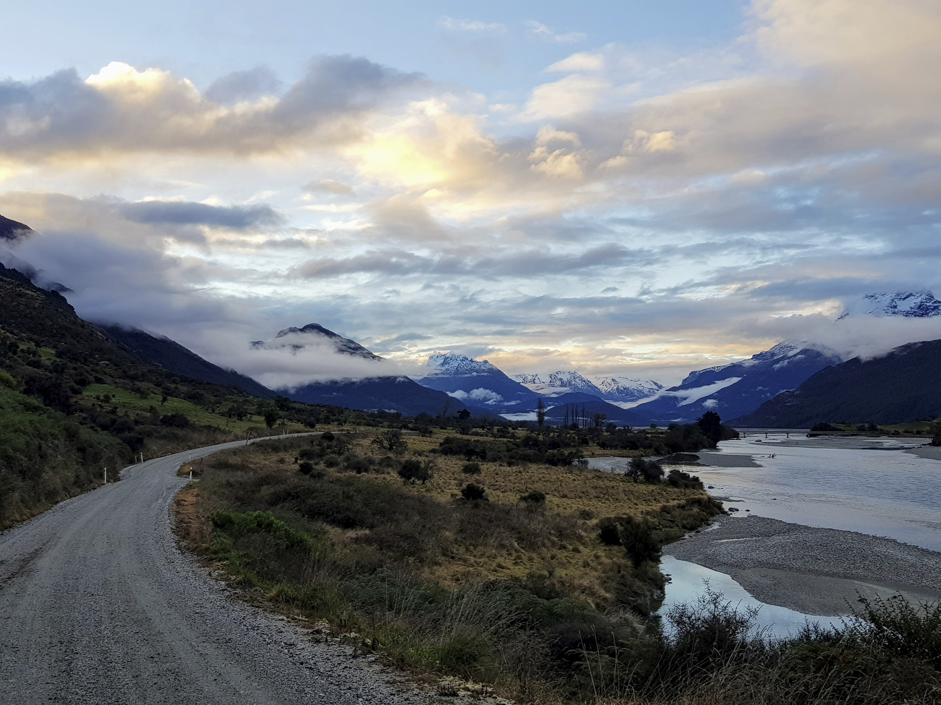 Gegenüber von Glenorchy am malerischen Ufer von Lake Wakatipu. Von Glenorchy aus 26 km, von denen die letzten 9 km ungeteert sind.